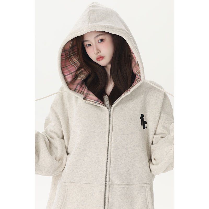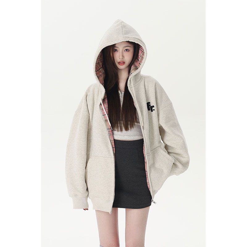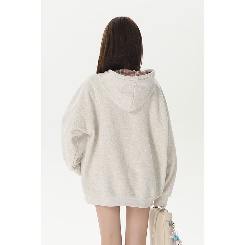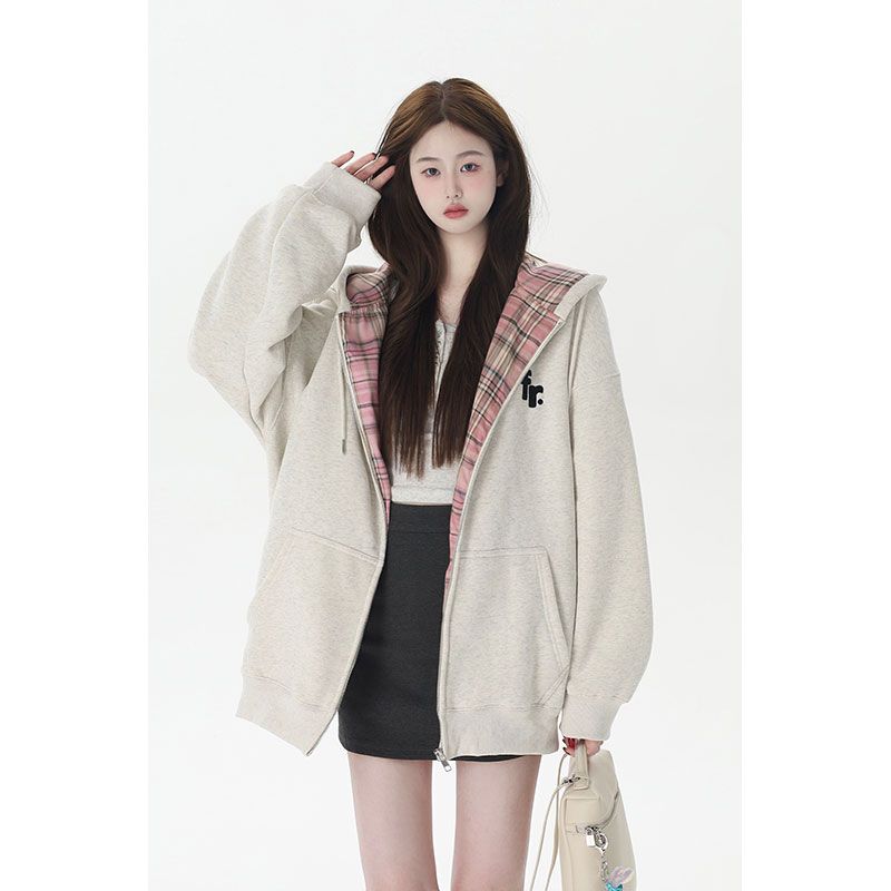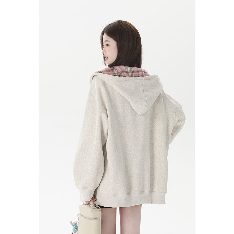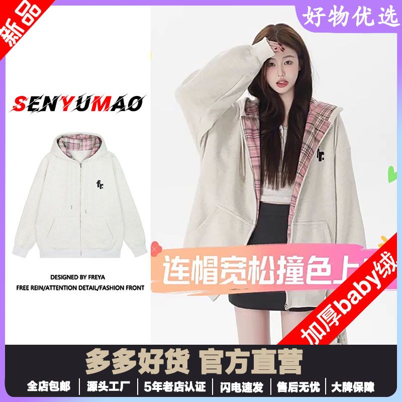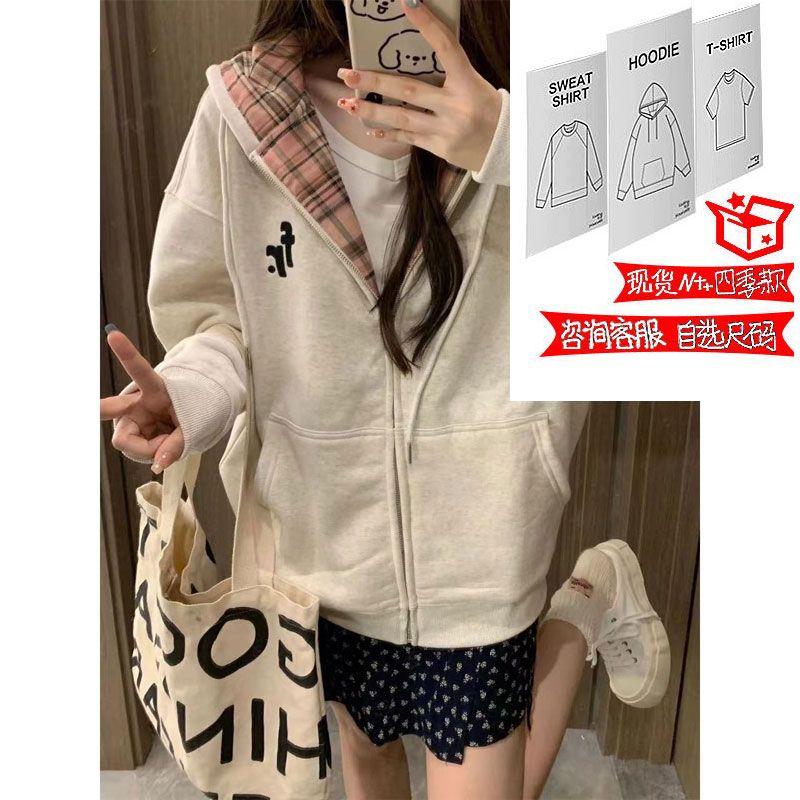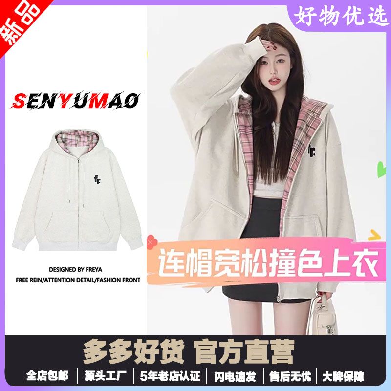 这件好好搭!!!【格子拼接】韩系校园风连帽卫衣女INS韩版开衫外套