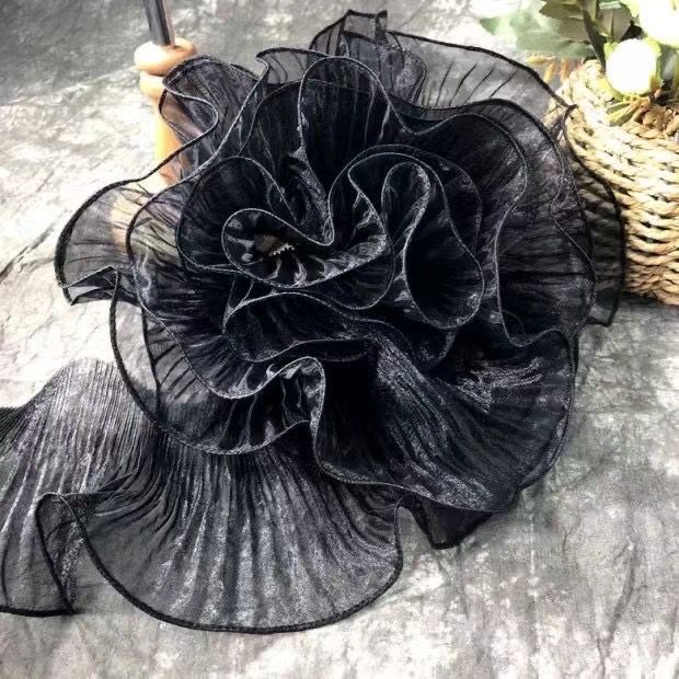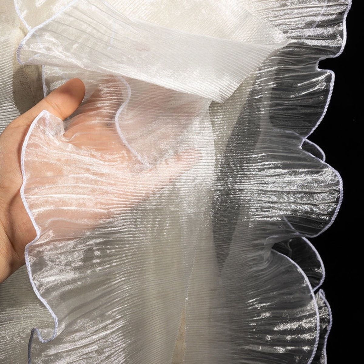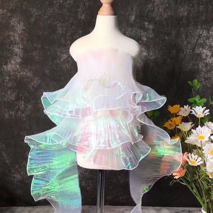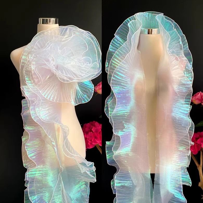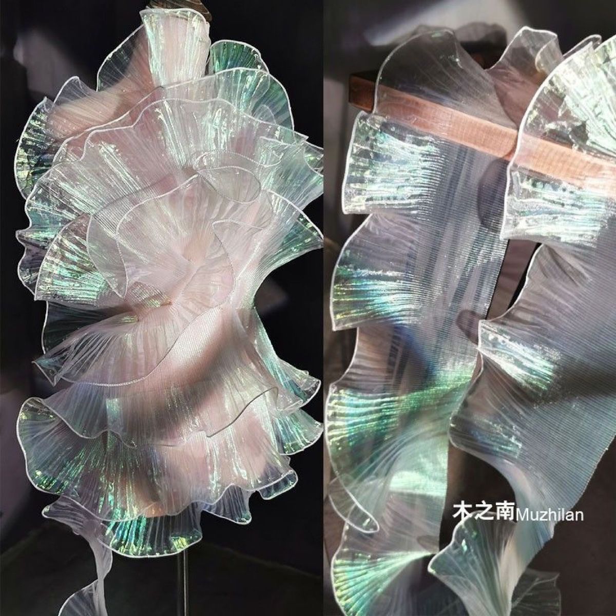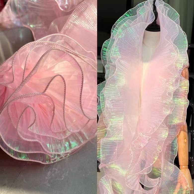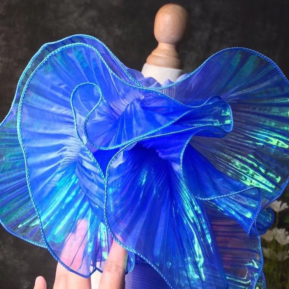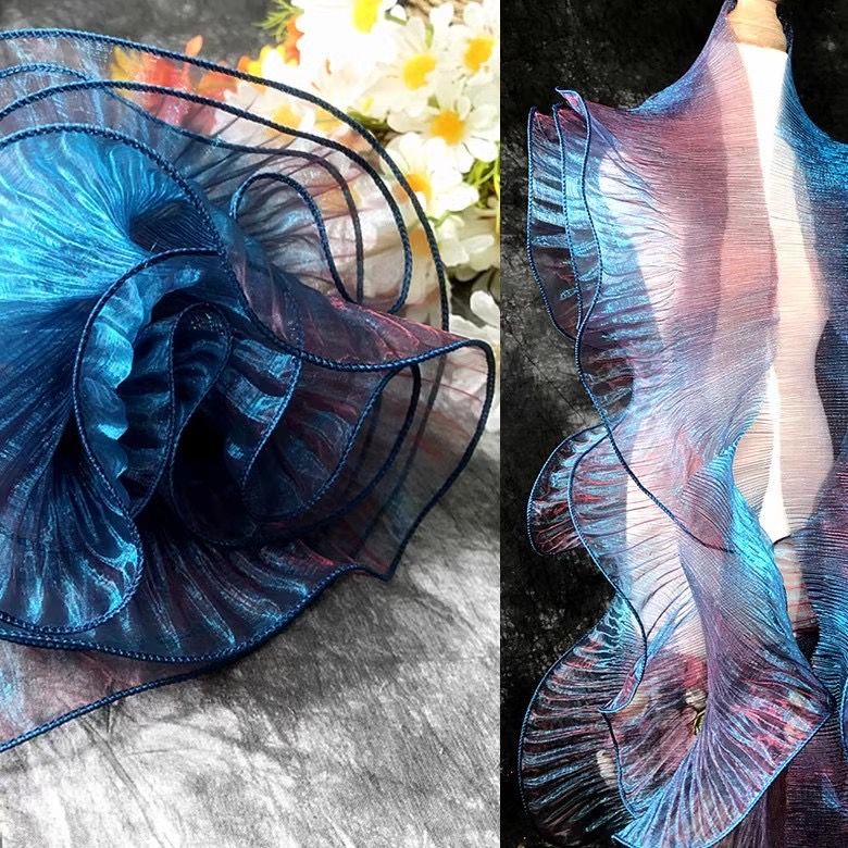 深海蓝褶皱荷叶花边布料幻彩渐变纱裙摆diy服装设计师辅料面料