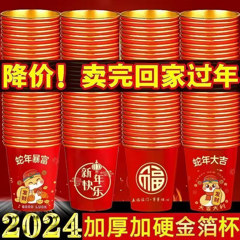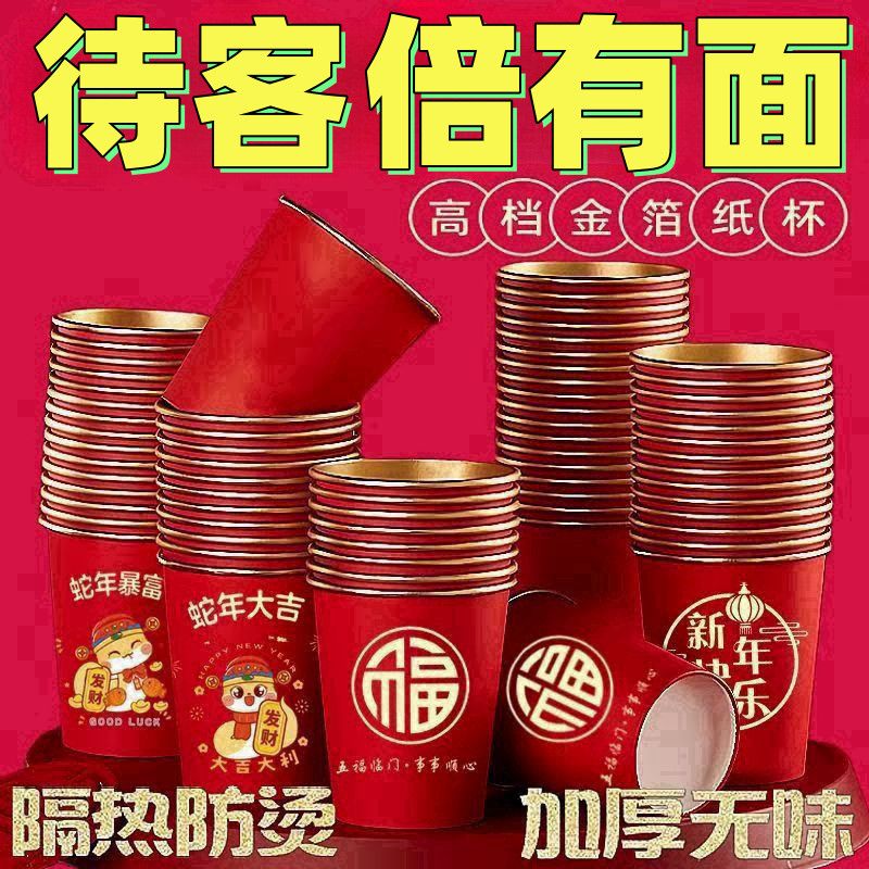 2025蛇年新款福字金箔纸杯加厚一次性杯子红色喜庆高颜值年货水杯