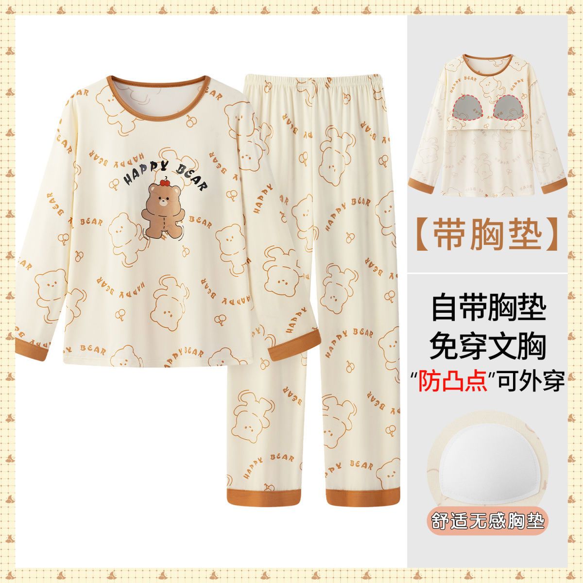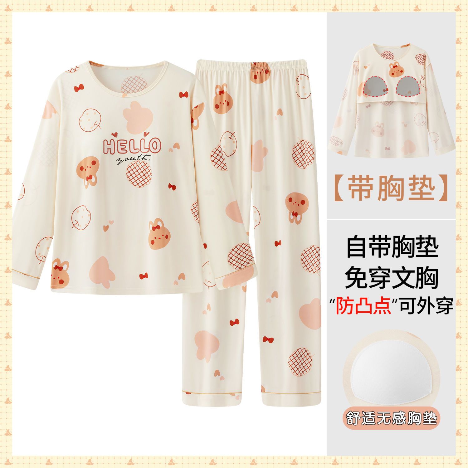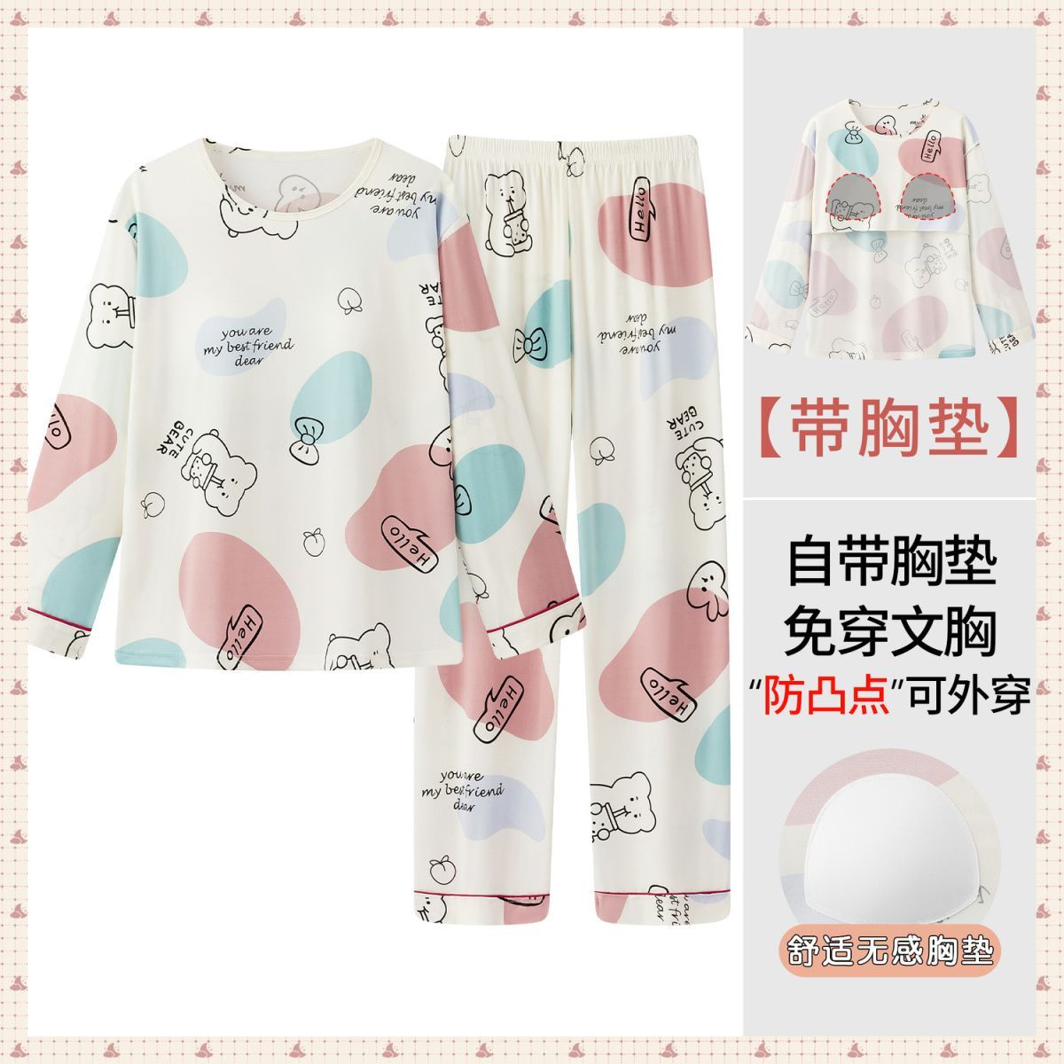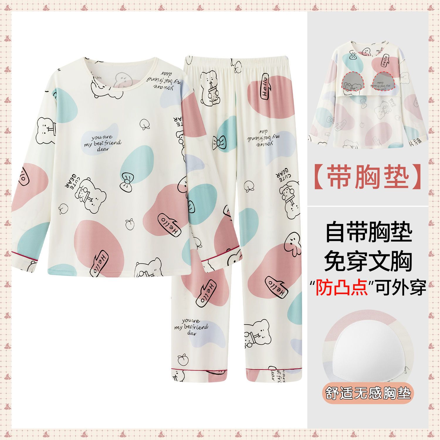 纯棉睡衣女100%全棉带胸垫睡衣女秋冬长袖卡通学生宿舍家居服套装