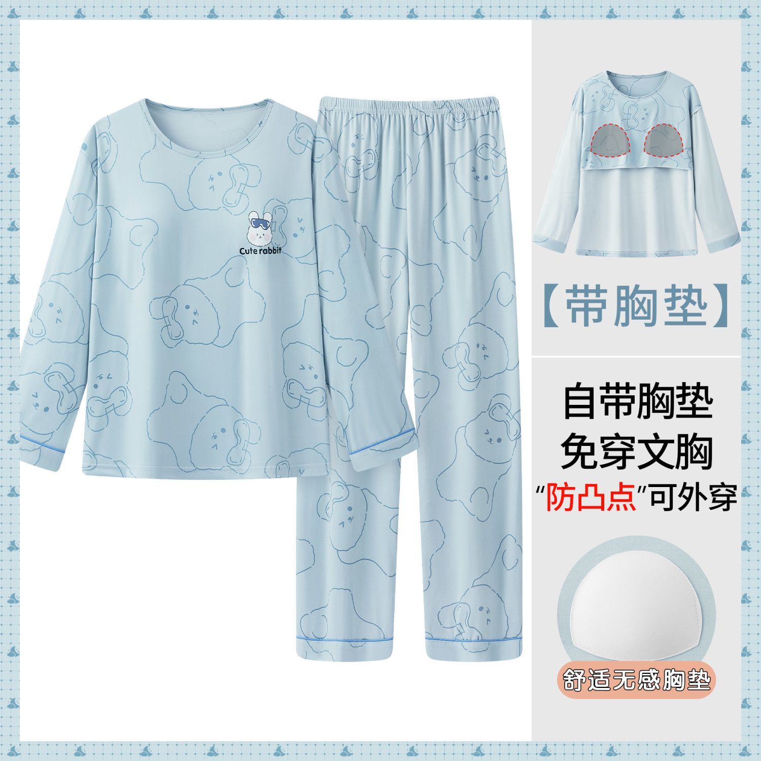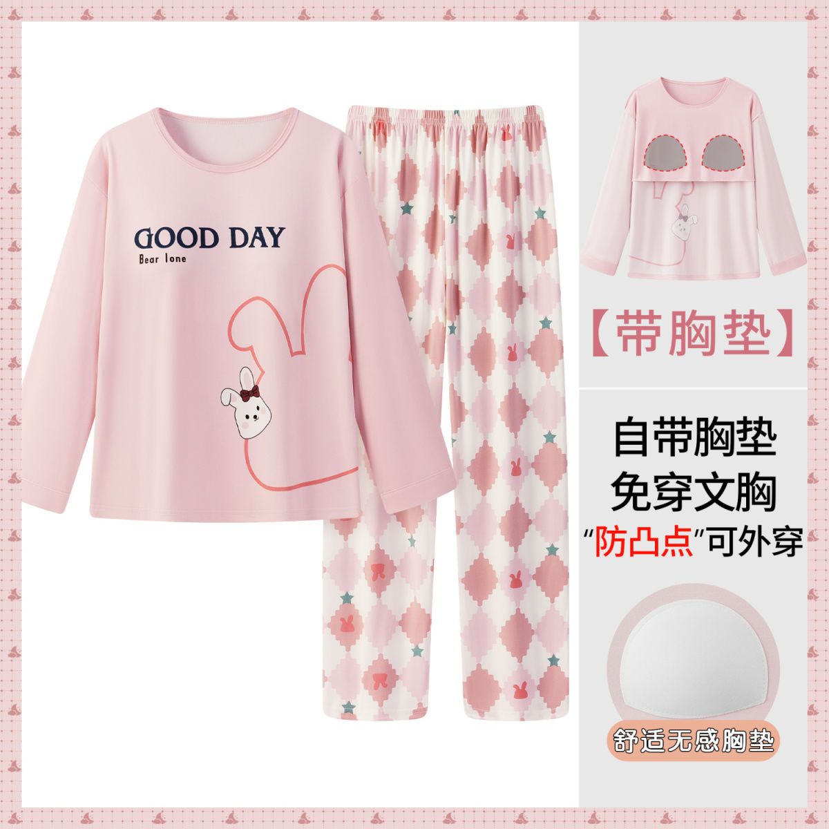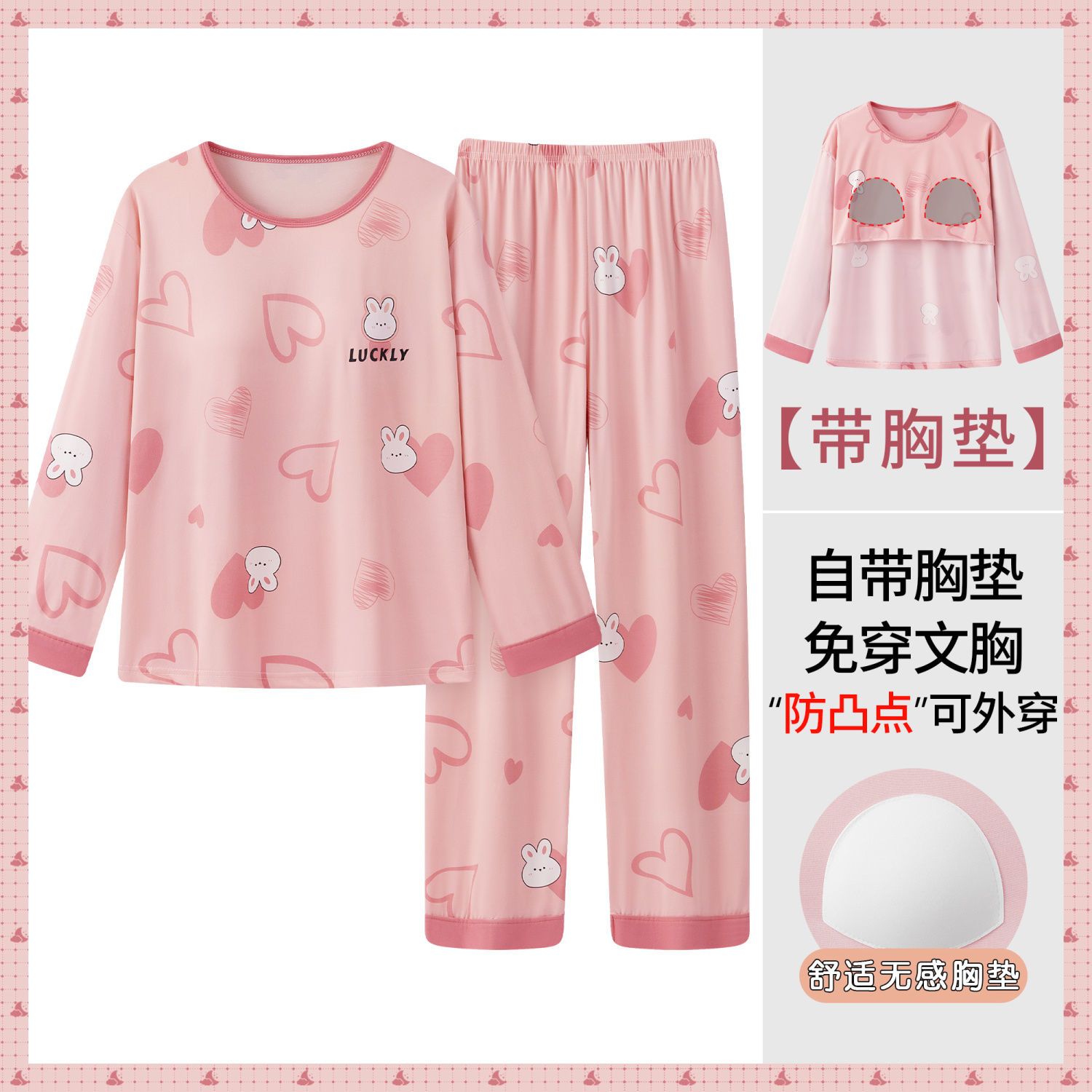 纯棉睡衣女100%全棉带胸垫睡衣女秋冬长袖卡通学生宿舍家居服套装