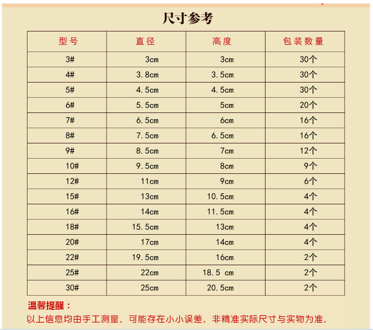 | no. 7 diameter 6.5 16 pieces per pack(7号直径6.5厘米16个一包) | USD $2.89 | 999999 piece available |