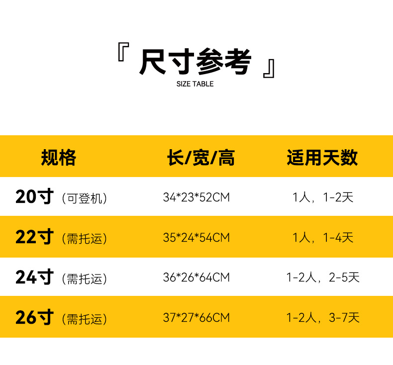 | 26寸(前开口+usb充电+侧挂钩) | USD $54.32 | 9908 piece available |