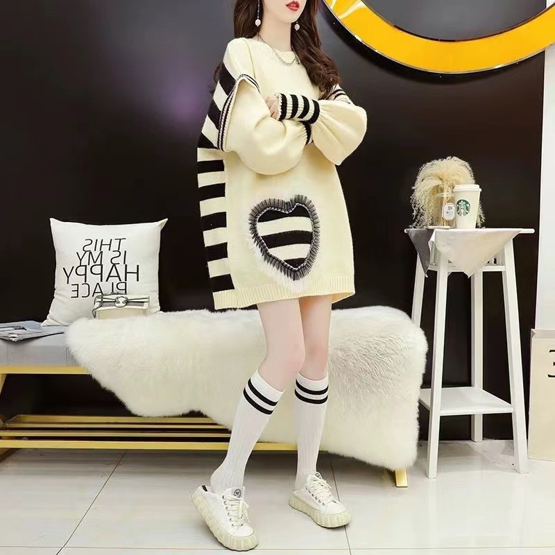 条纹设计感针织中长款毛衣女2024秋冬韩系慵懒风宽松甜美上衣外穿