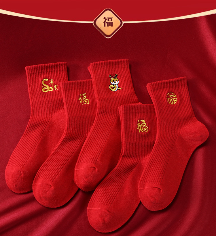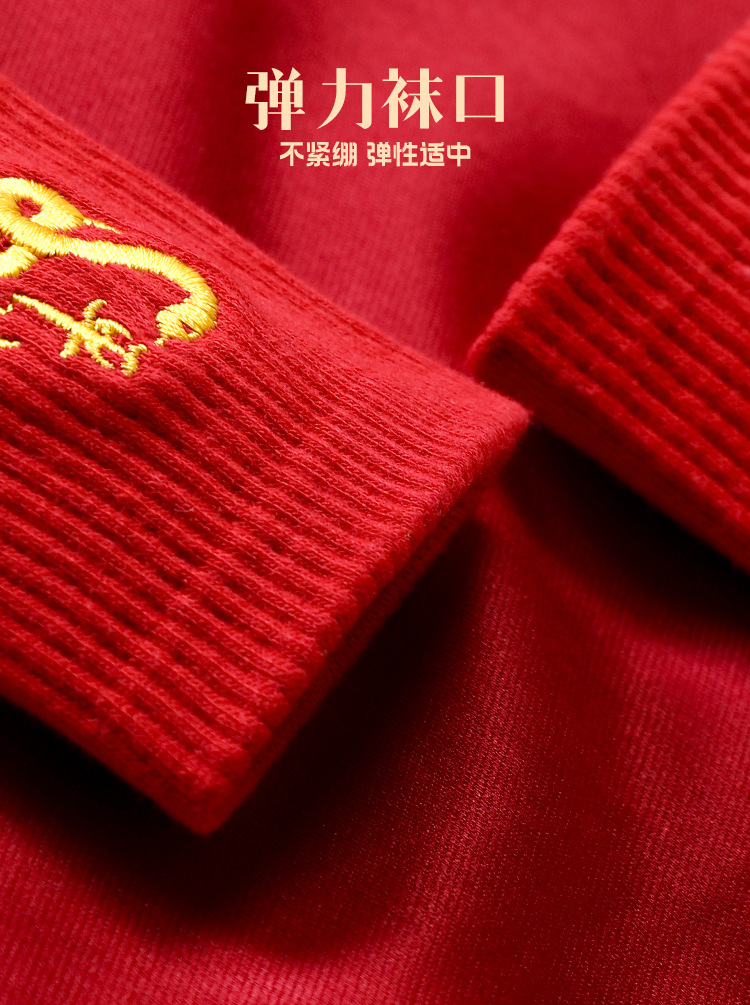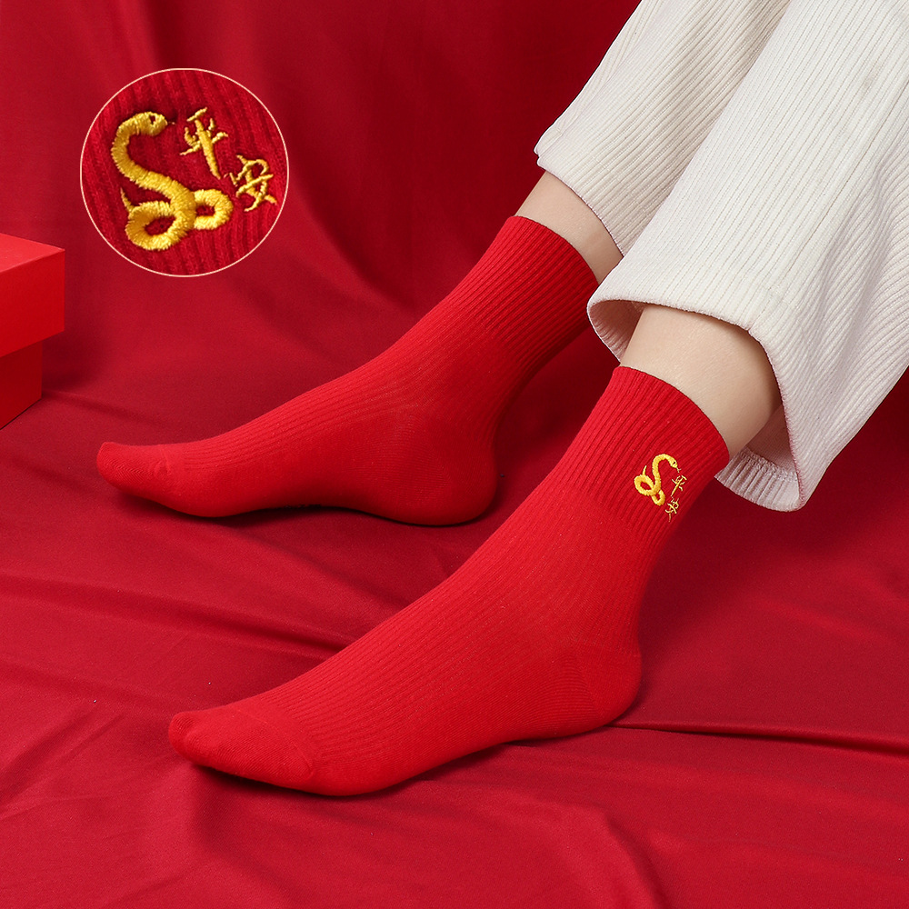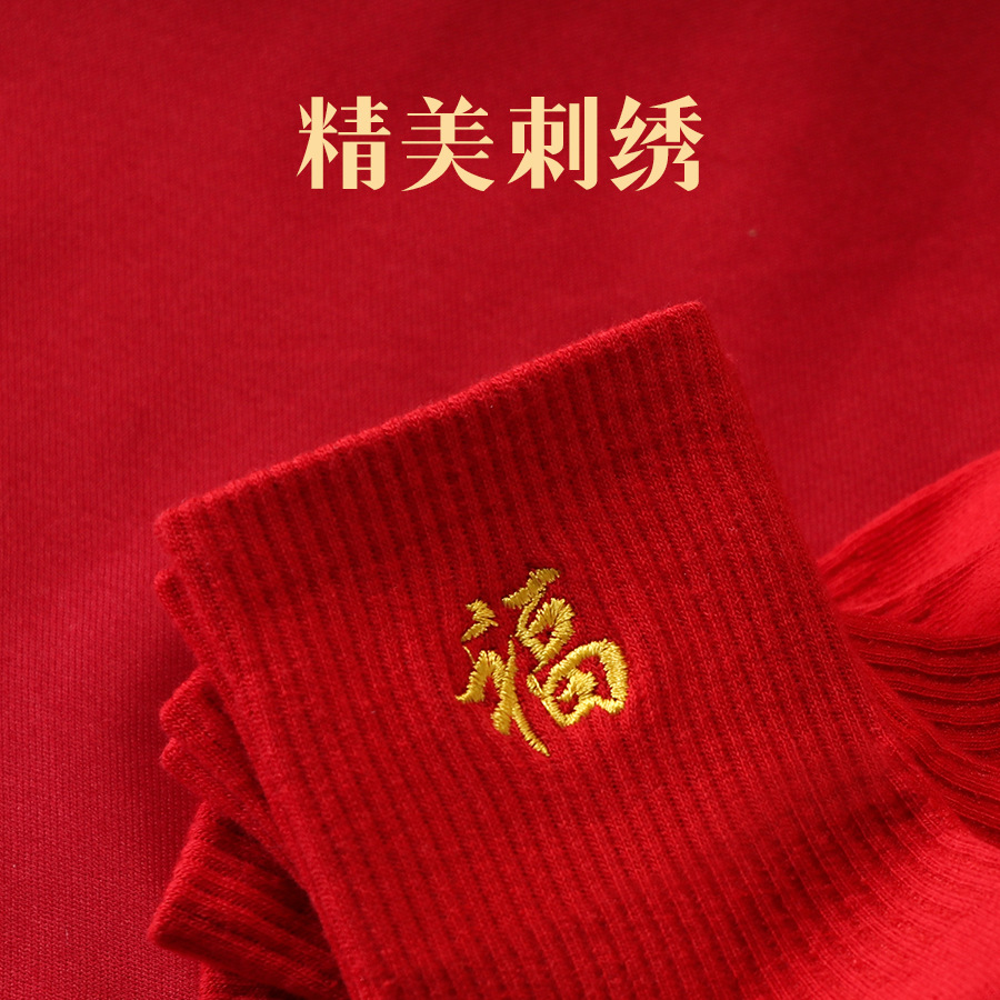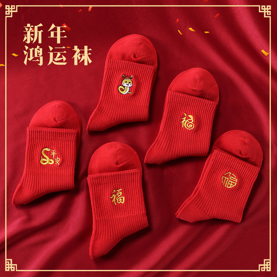 红袜子女款蛇年本命年中筒棉袜刺绣新年大红色情侣结婚福袜
