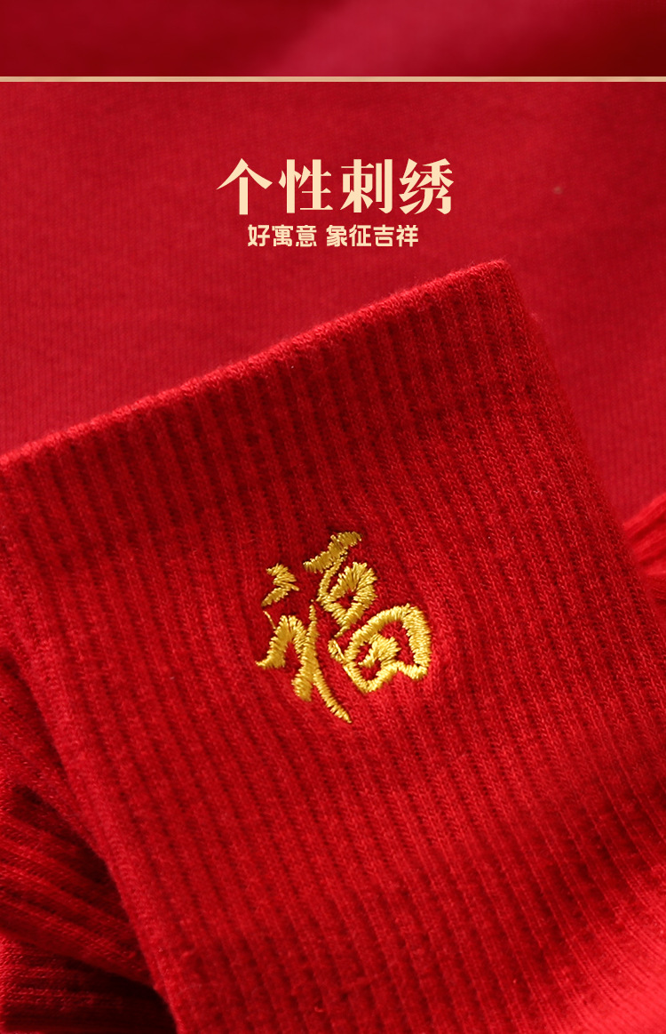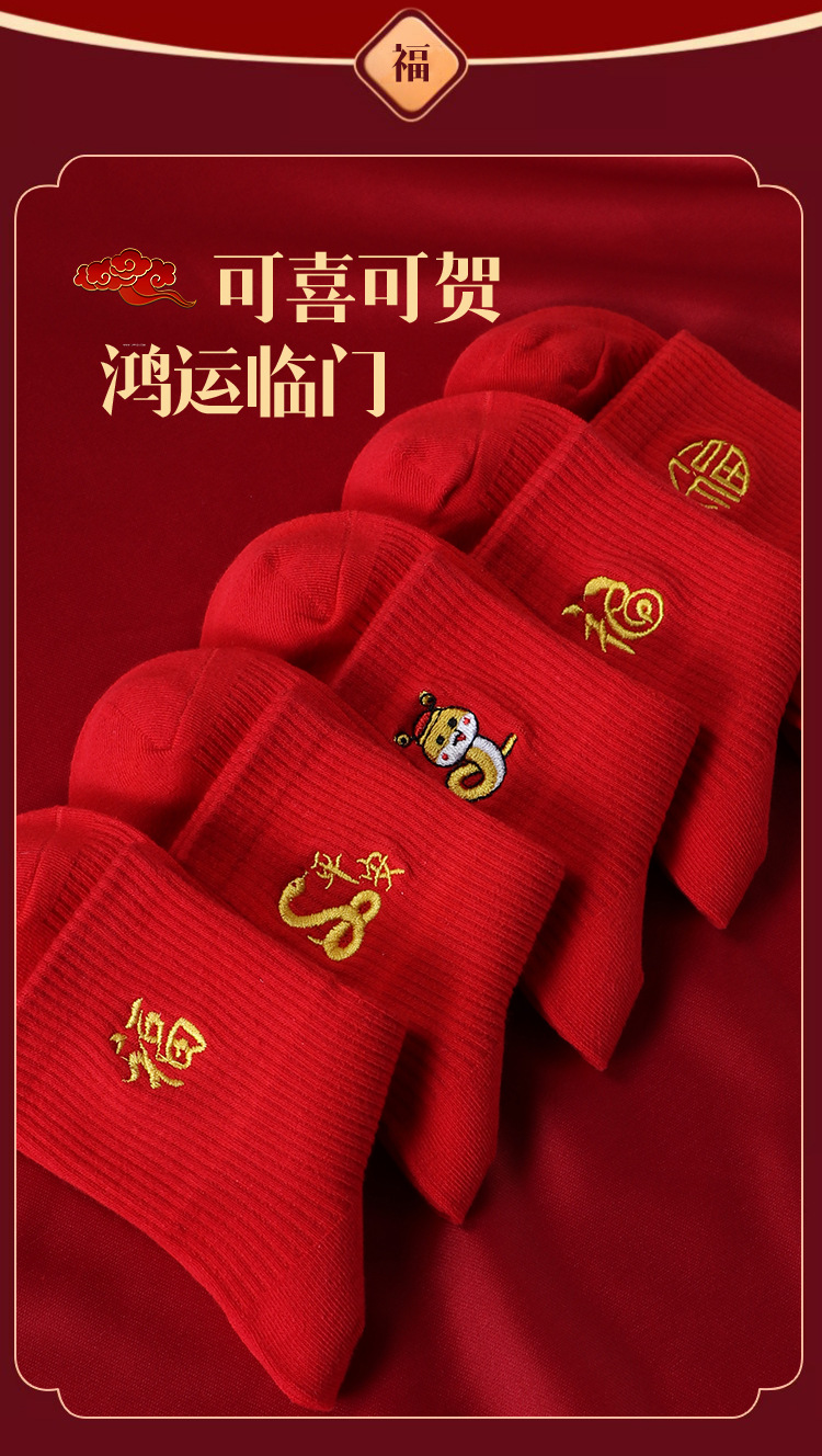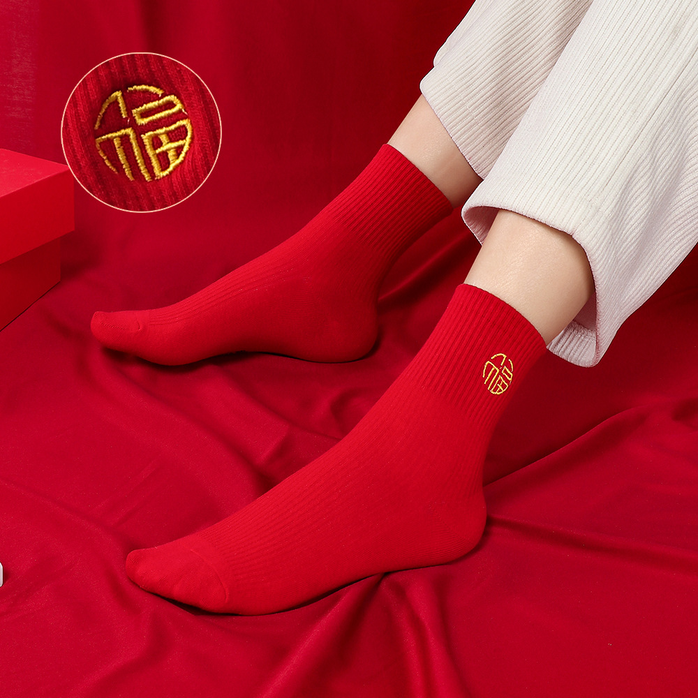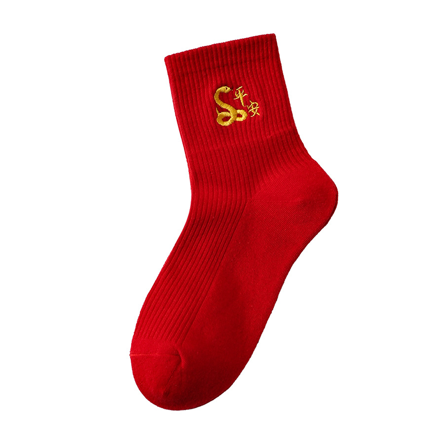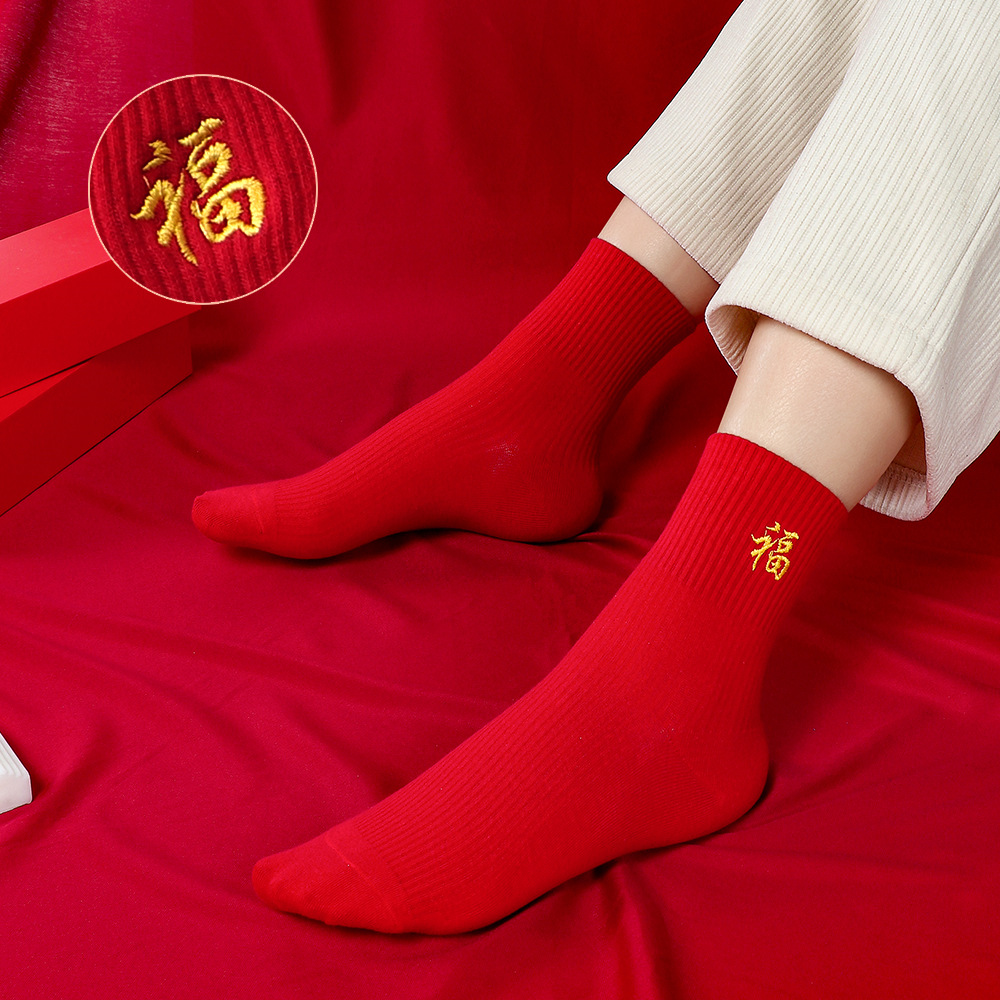 红袜子女款蛇年本命年中筒棉袜刺绣新年大红色情侣结婚福袜