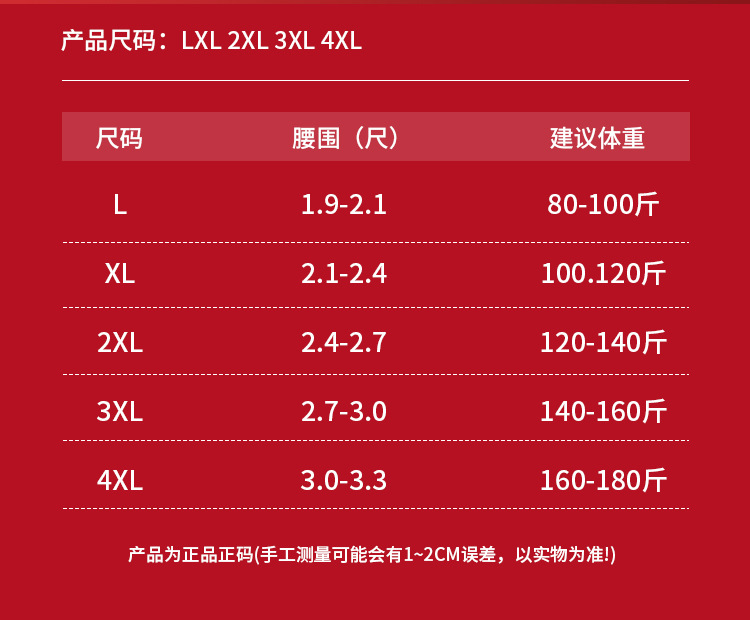 | 4xl (80.00 kg-90.00 kg(4XL(160-180斤)) | USD $2.66 | 99998 piece available |