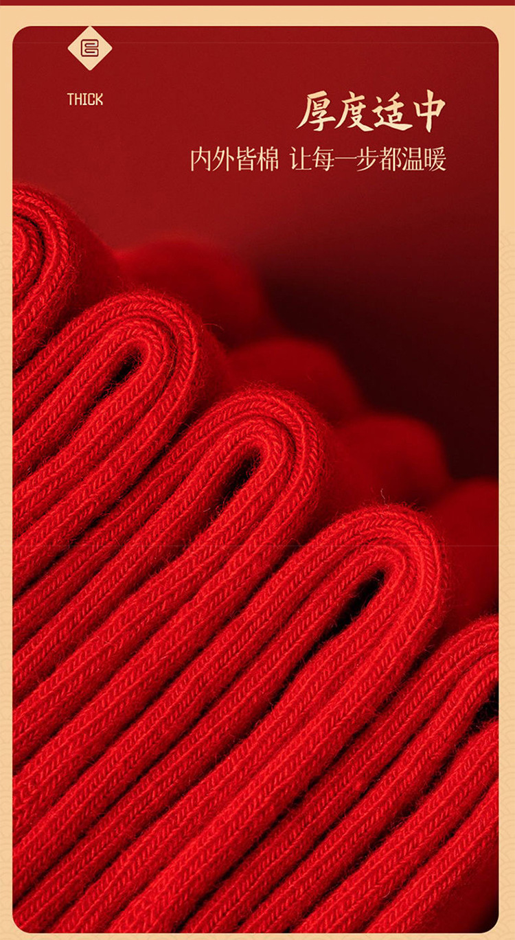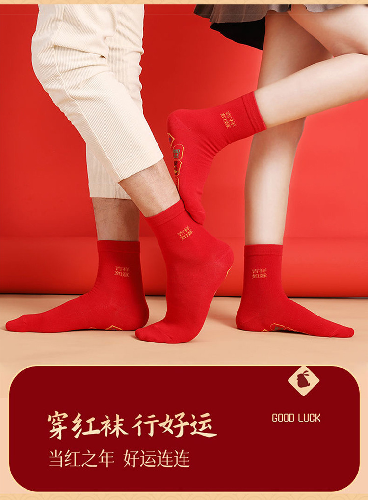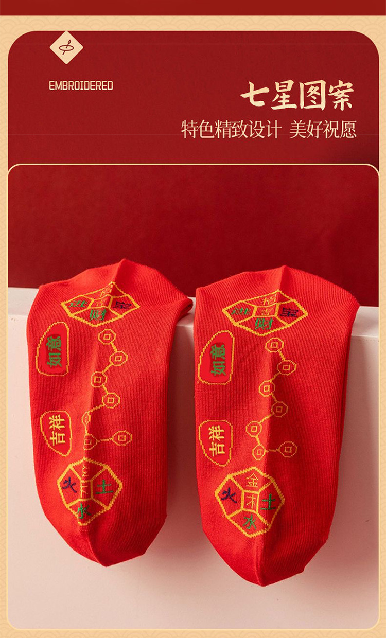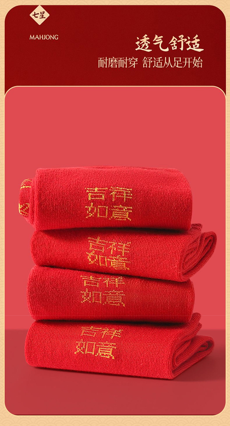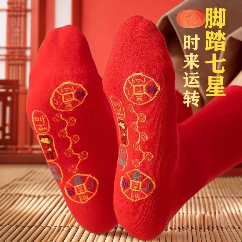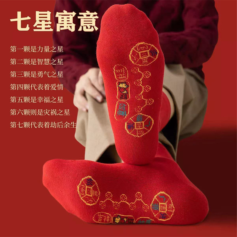 脚踏七星大红中筒男女棉袜蛇年本命年结婚七福连珠袜子女工厂批发