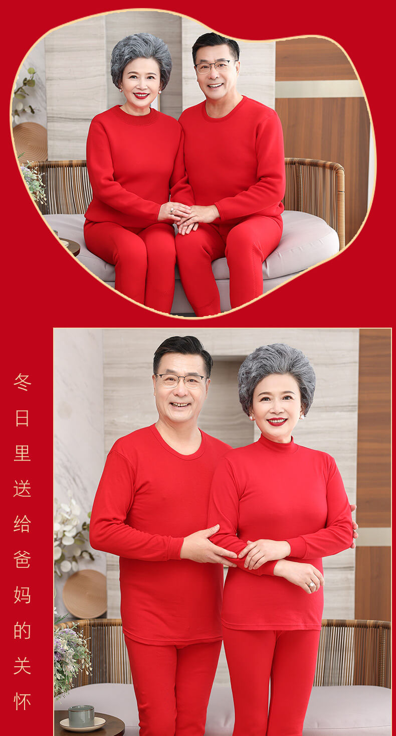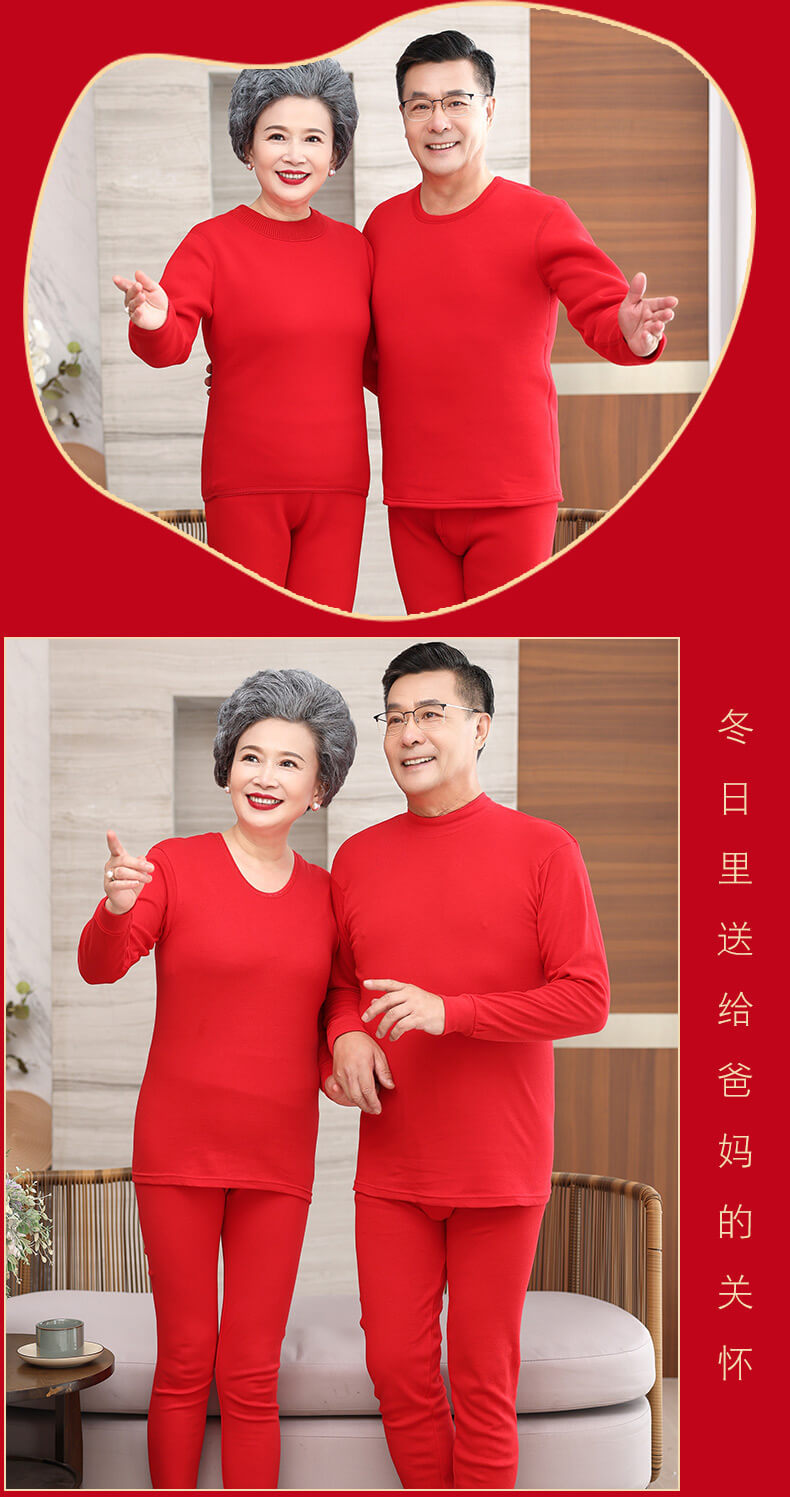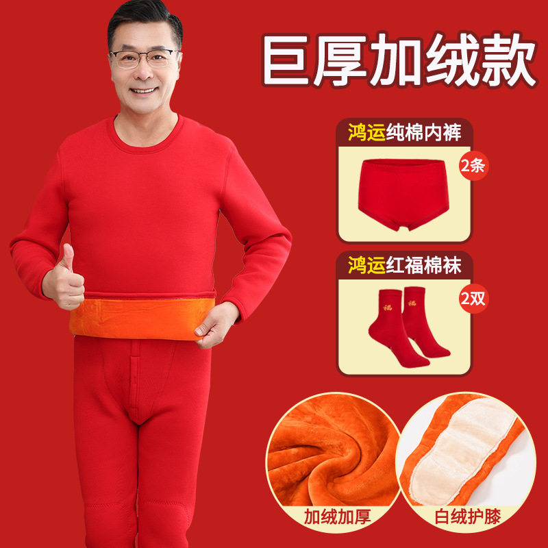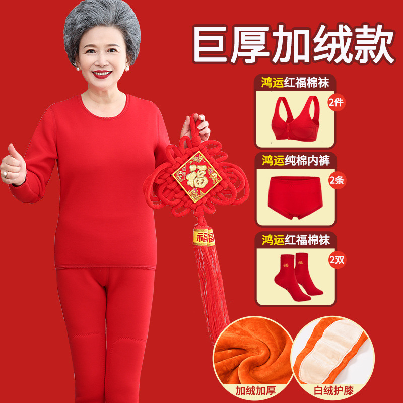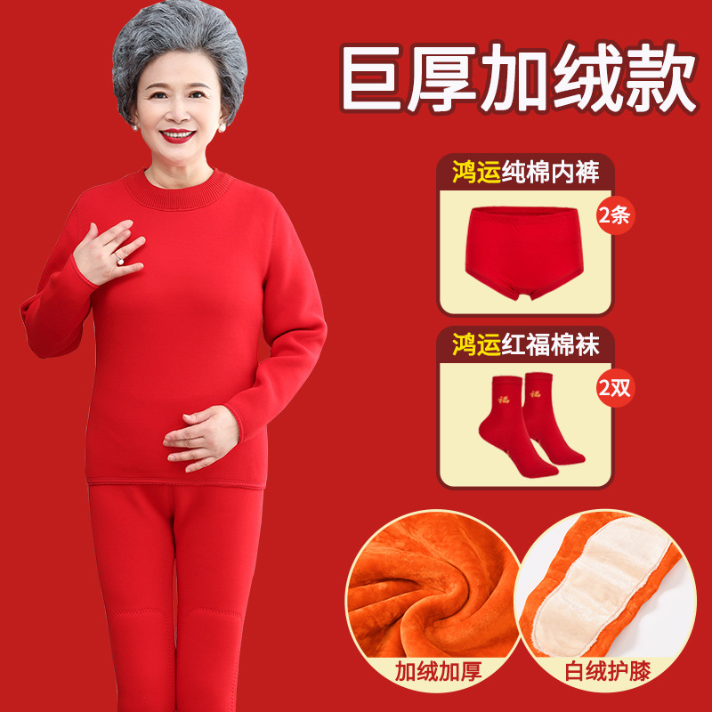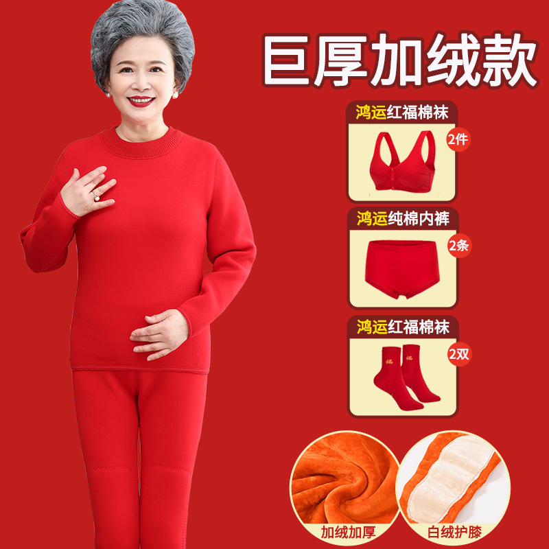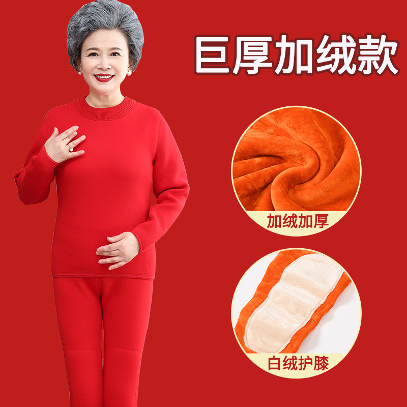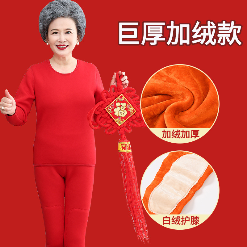 老年人本命年保暖内衣女士加绒加厚套装蛇年妈妈红色保暖衣男护膝