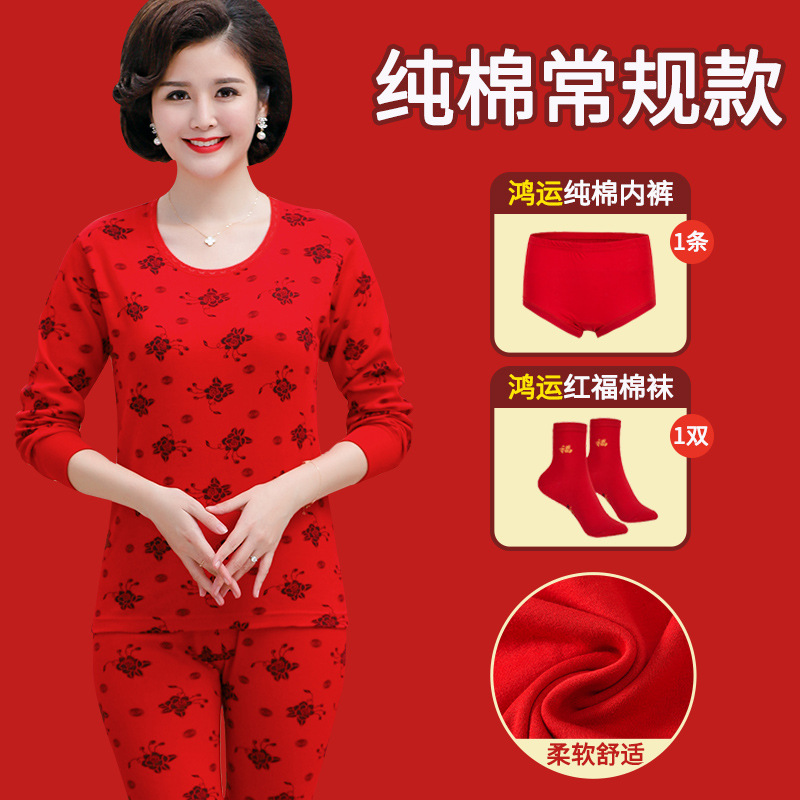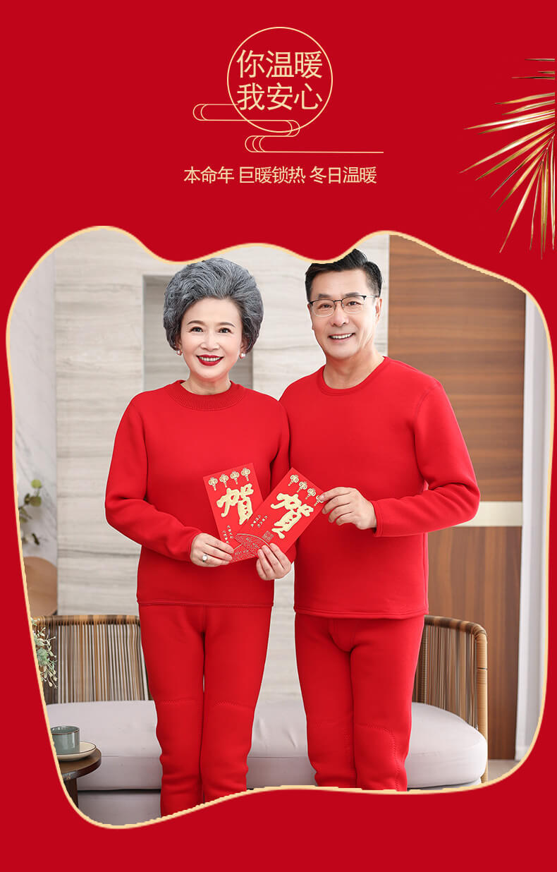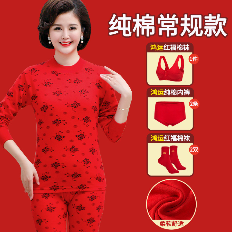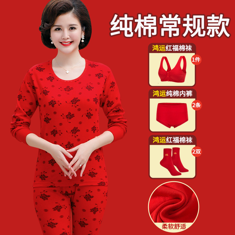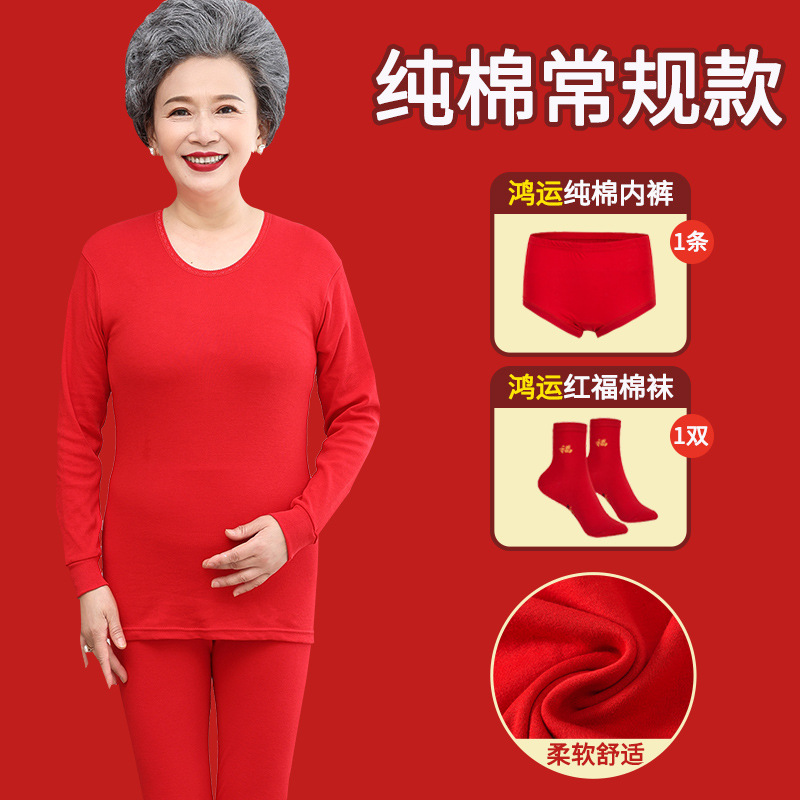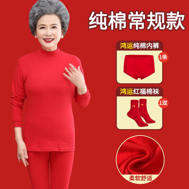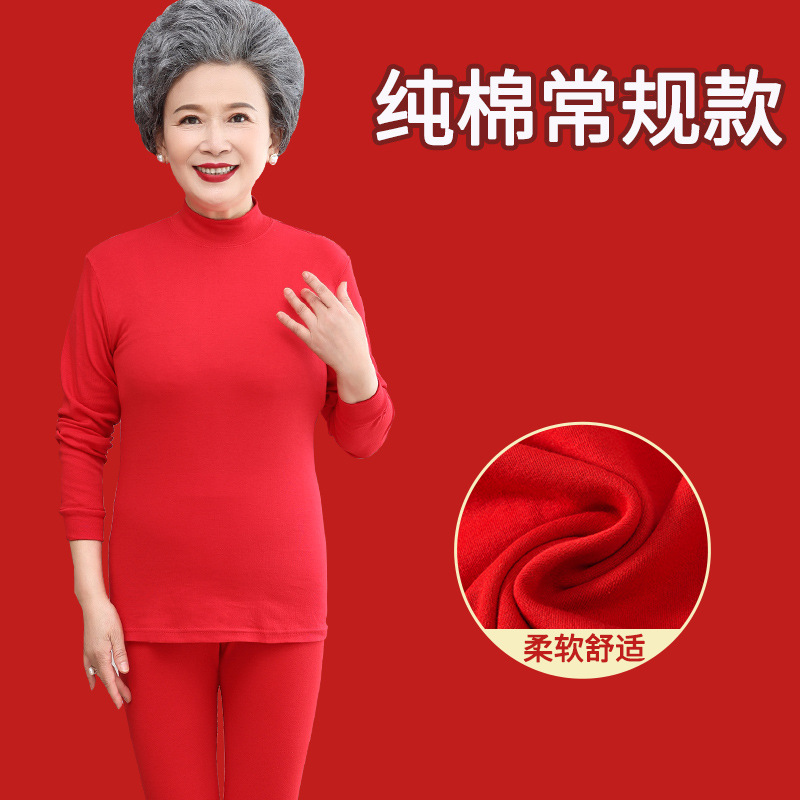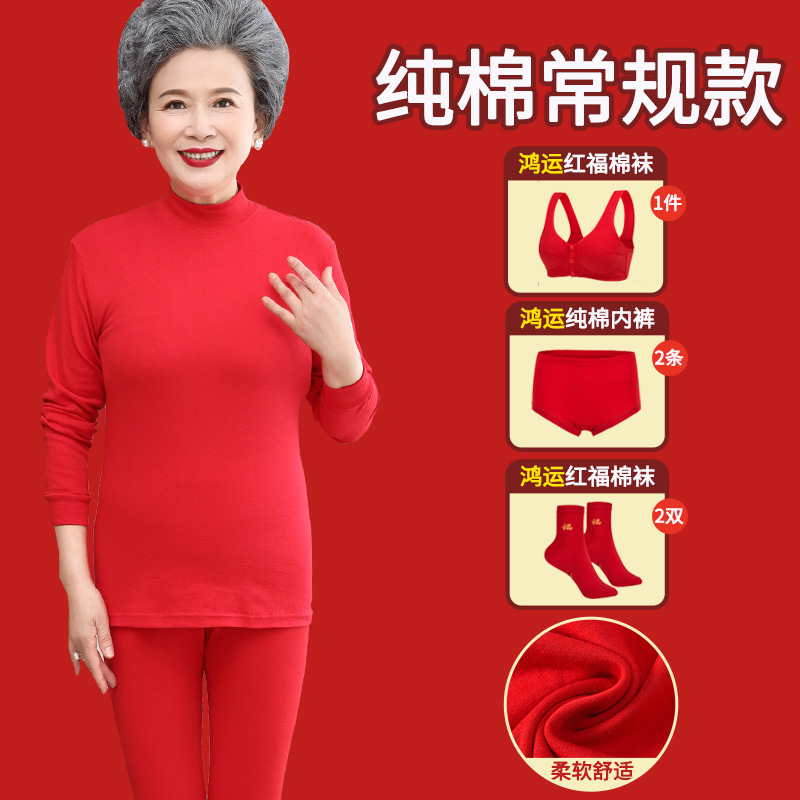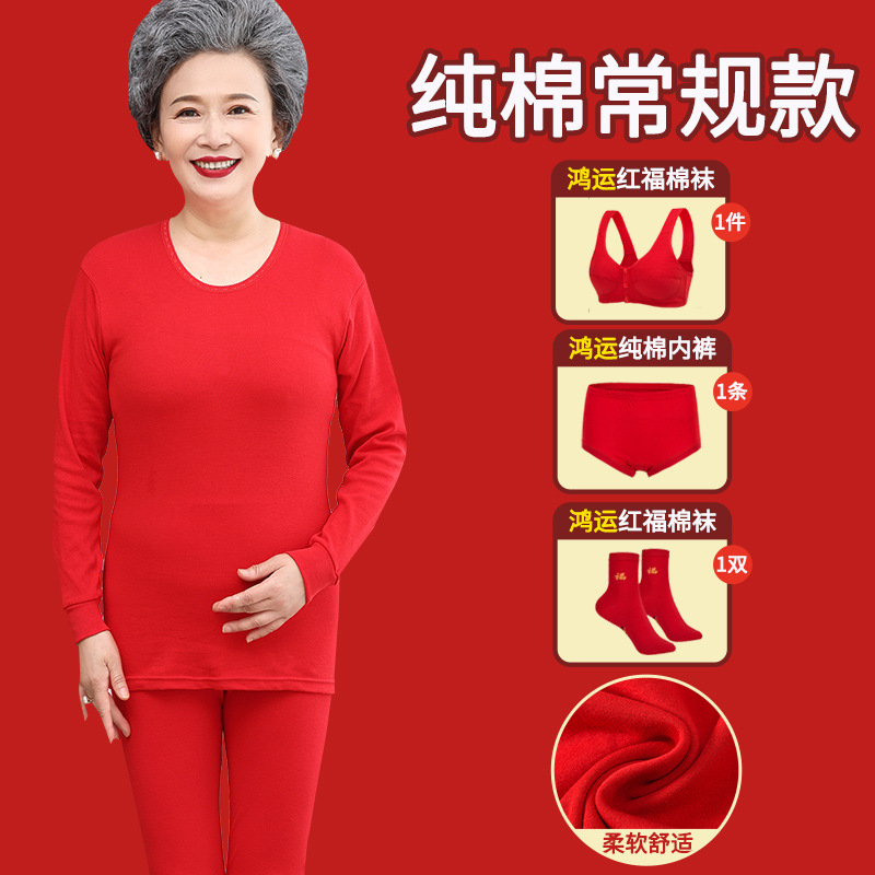 老年人本命年保暖内衣女士加绒加厚套装蛇年妈妈红色保暖衣男护膝