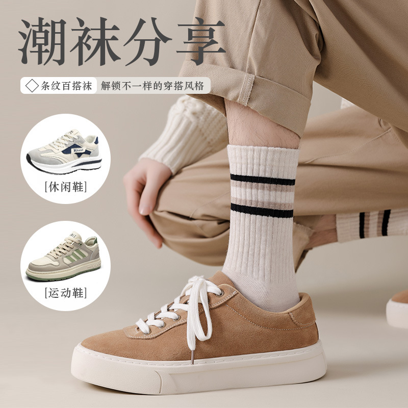 新品上市秋冬舒适中筒袜条纹复古潮流运动棉袜时尚商务休闲男袜子