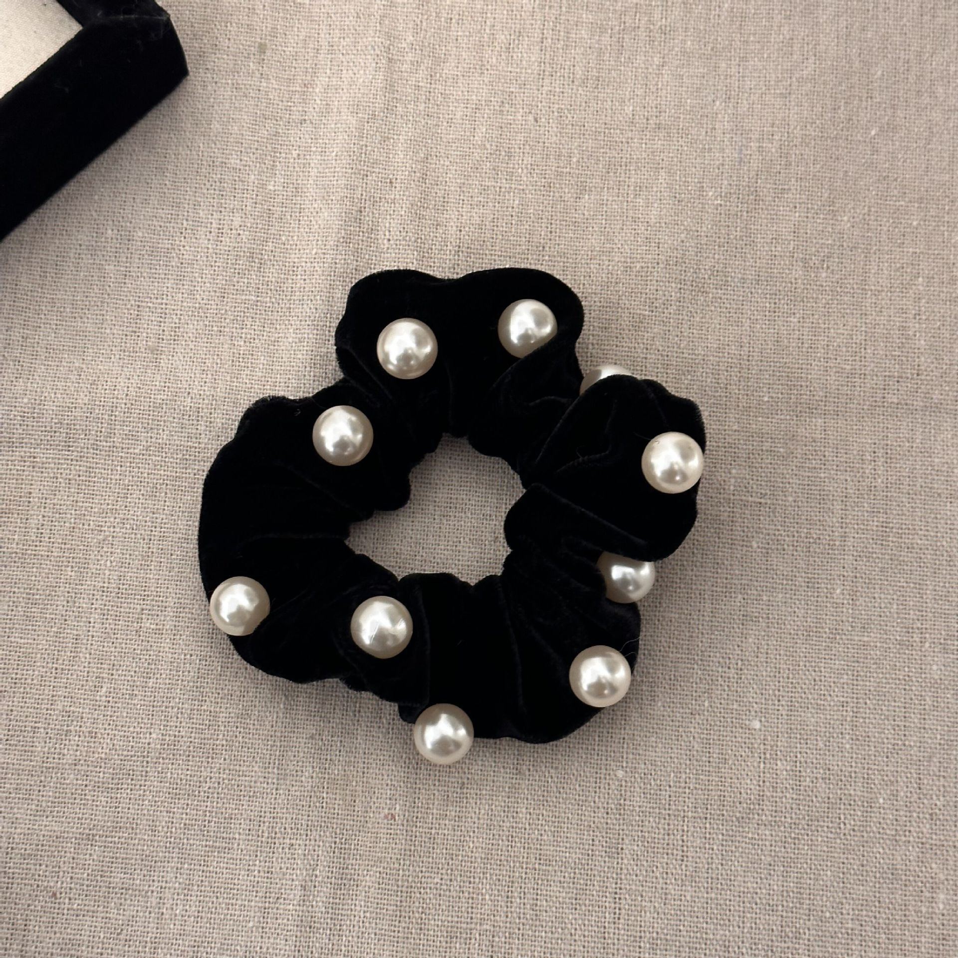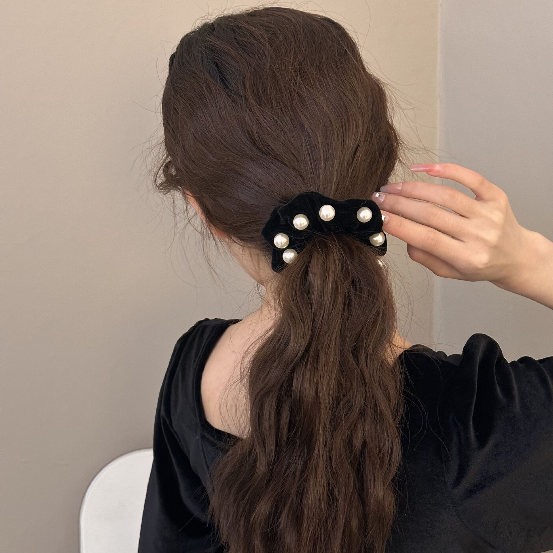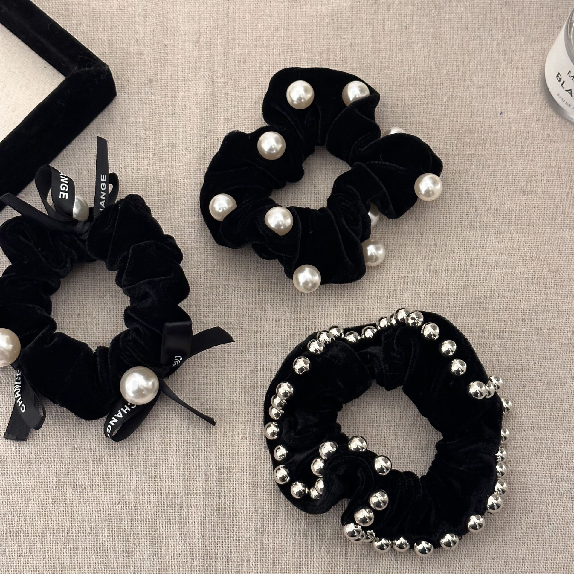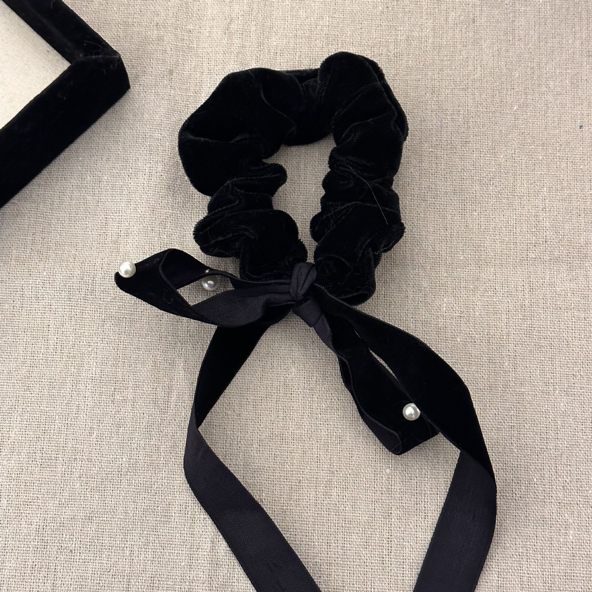 《黑松露》黑色丝绒珍珠飘带大肠发圈复古法式简约优雅头花发绳新