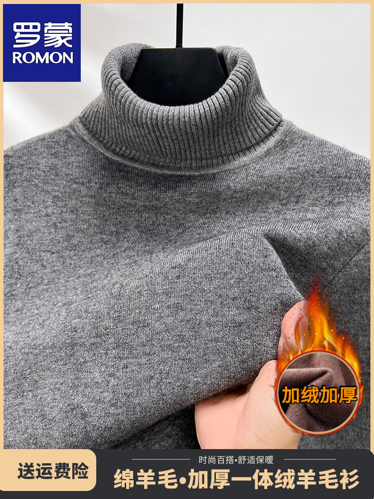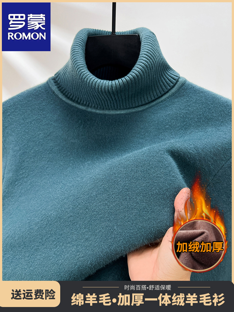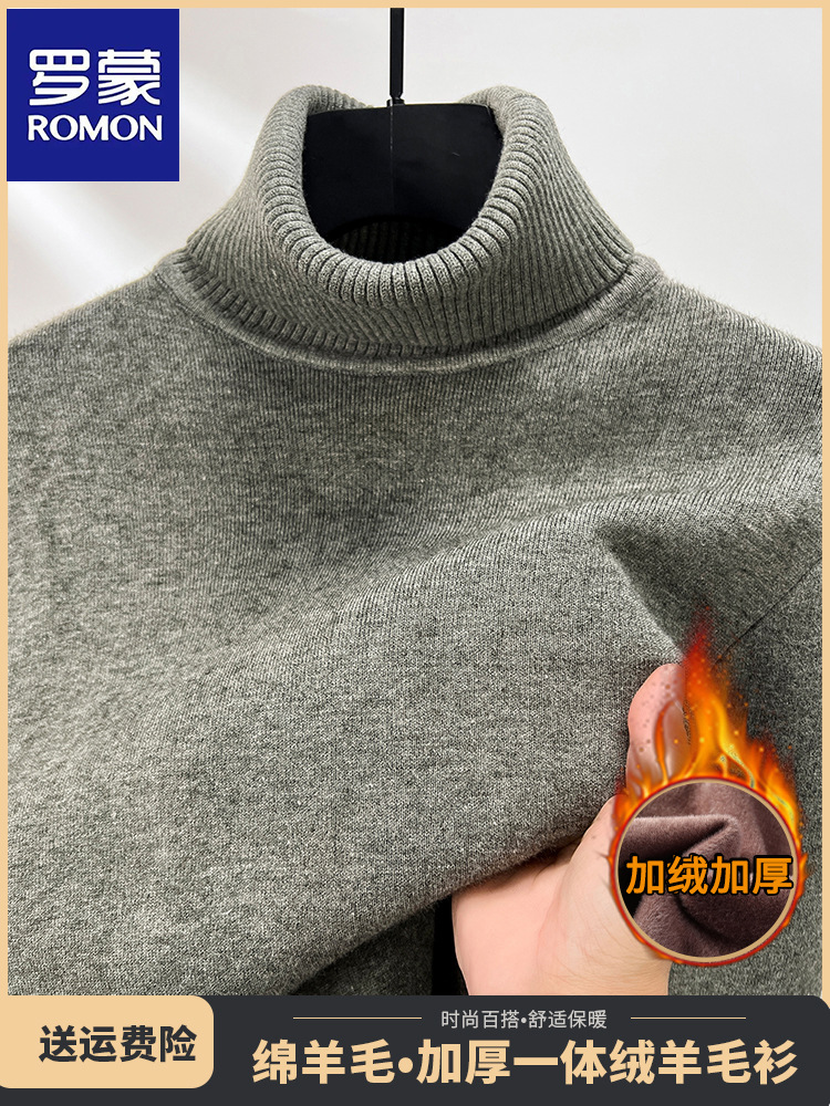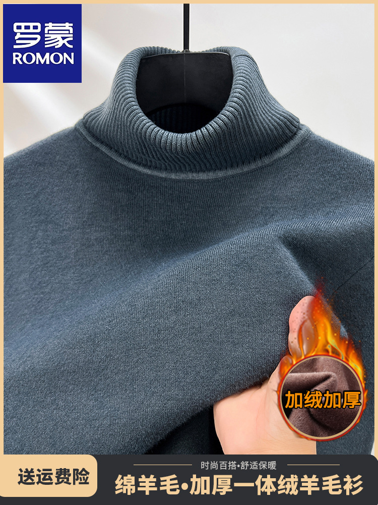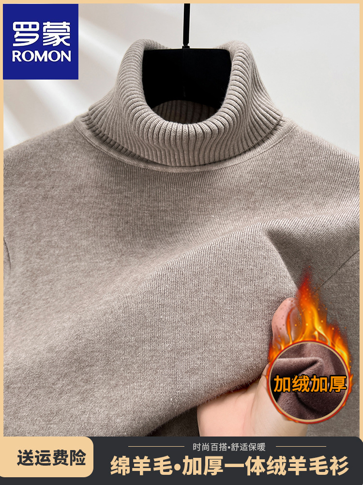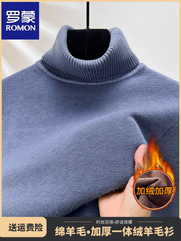 罗蒙新款含羊毛男士冬季加绒高领纯色打底衫针织保暖休闲羊毛衫