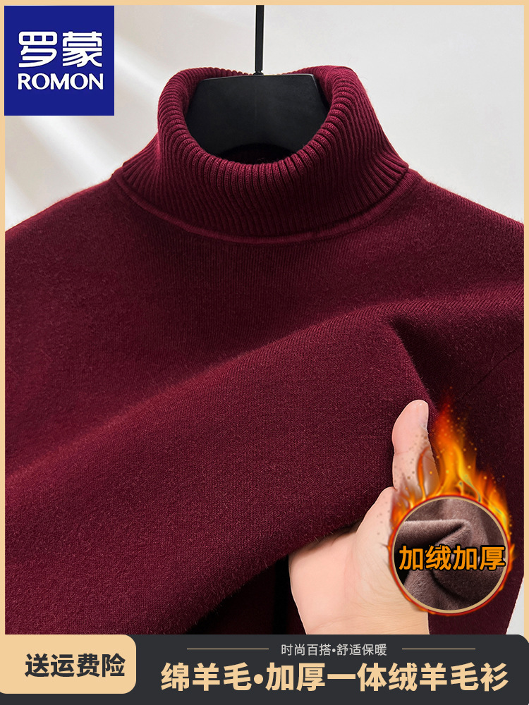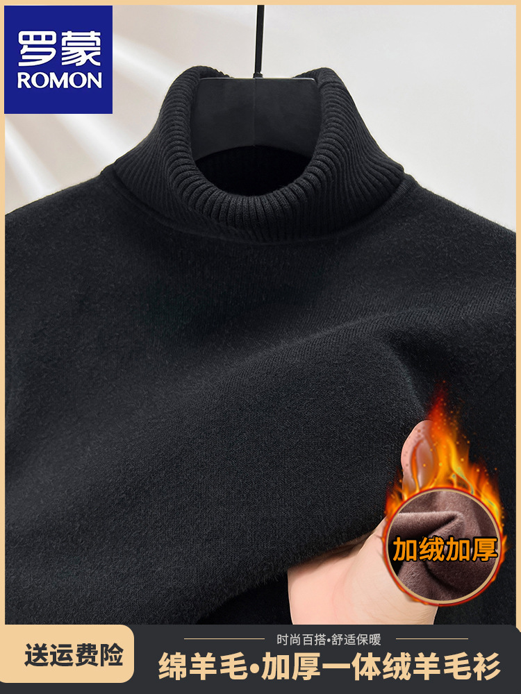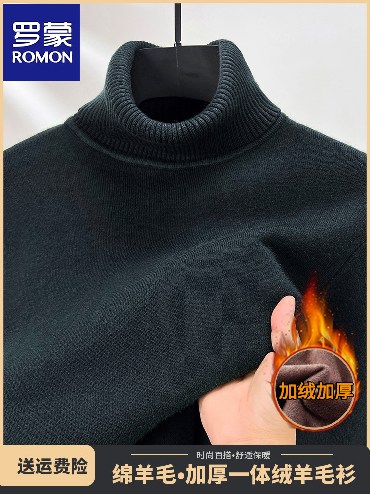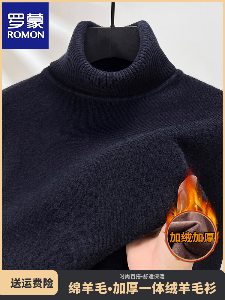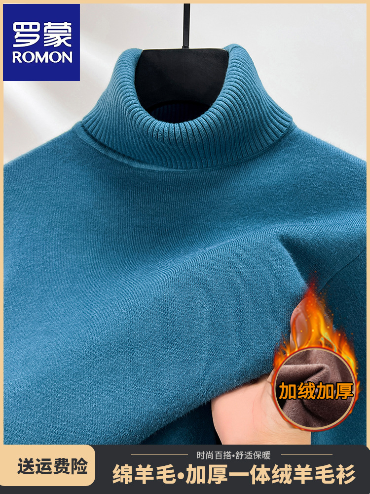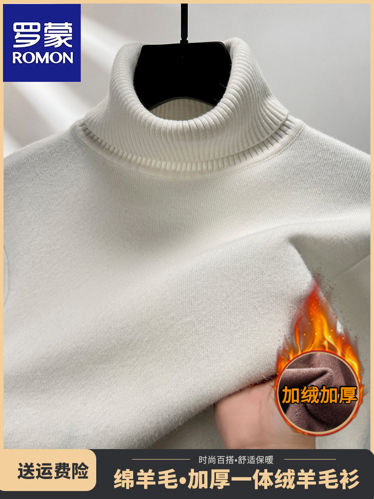 罗蒙新款含羊毛男士冬季加绒高领纯色打底衫针织保暖休闲羊毛衫