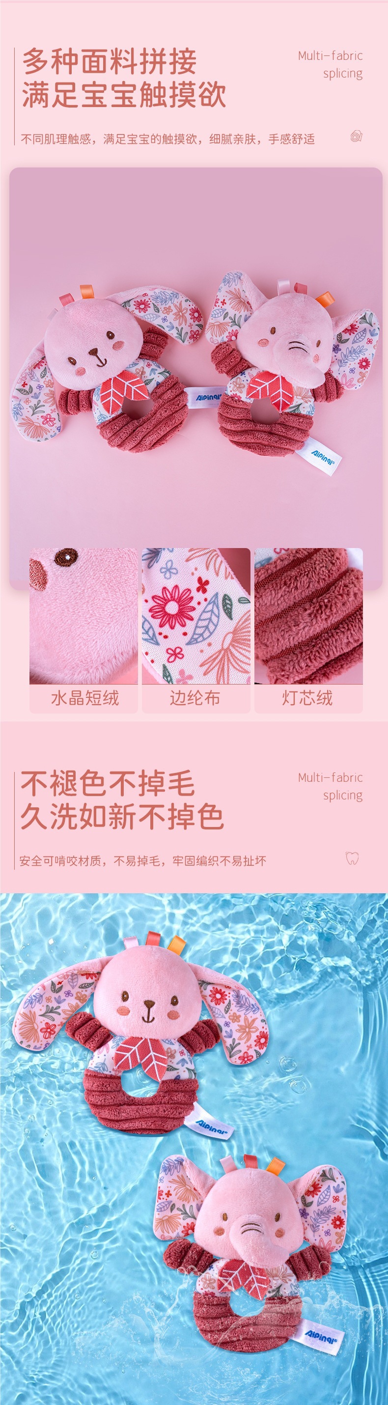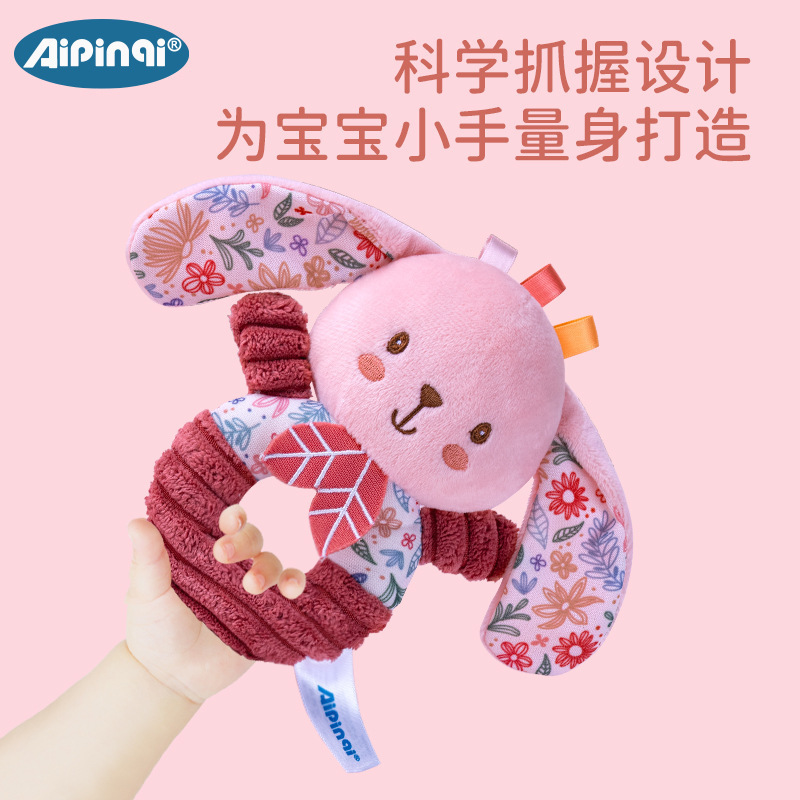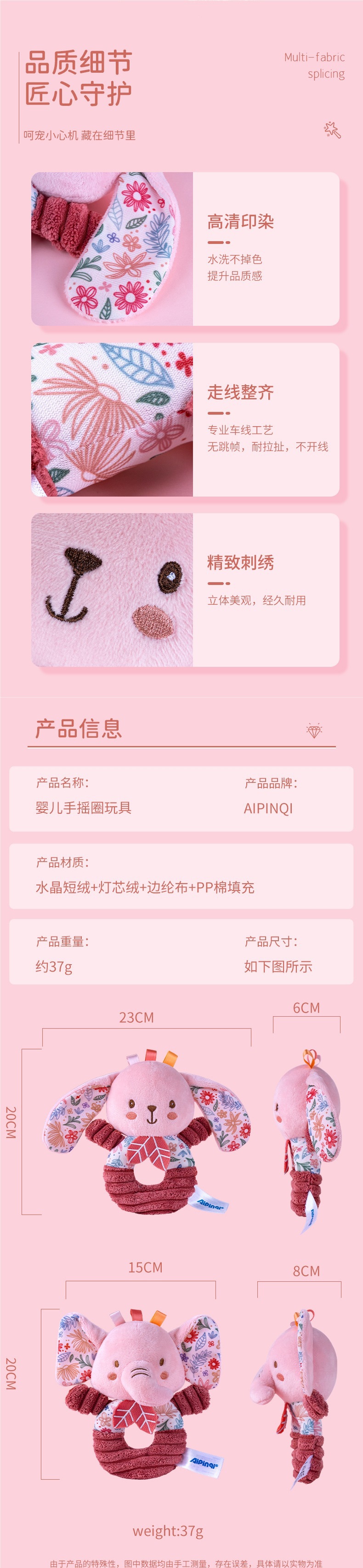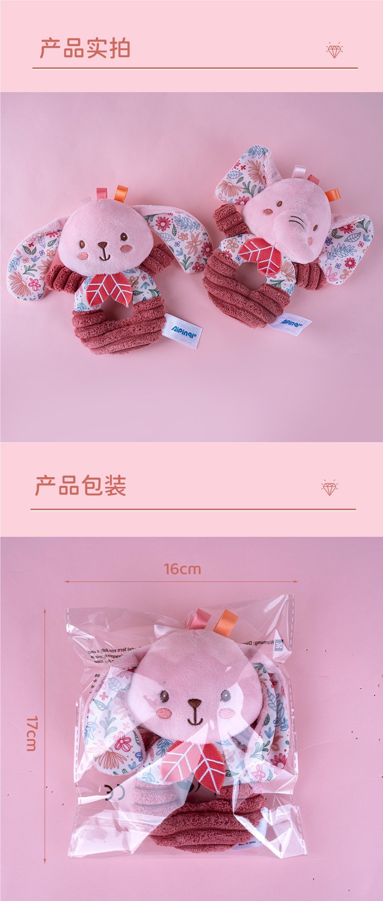 可爱毛绒动物粉色手摇圈 新生儿毛绒公仔玩具0-1岁宝宝BB棒手摇铃