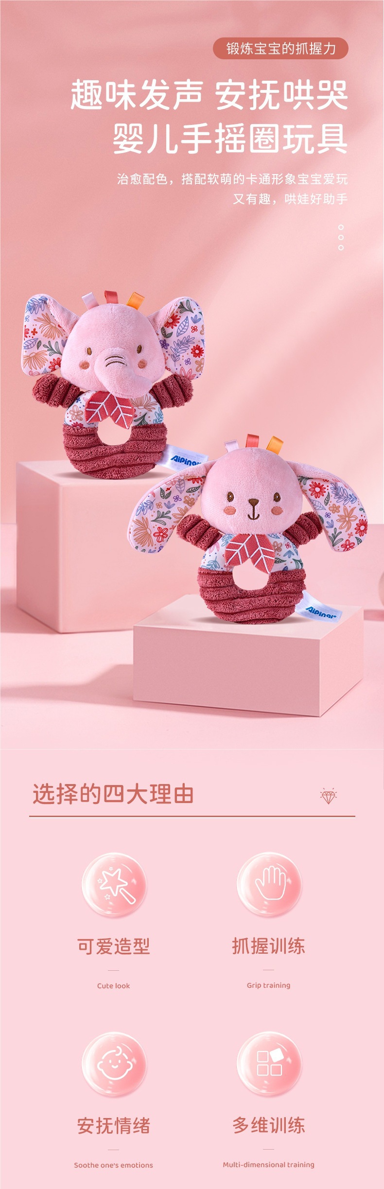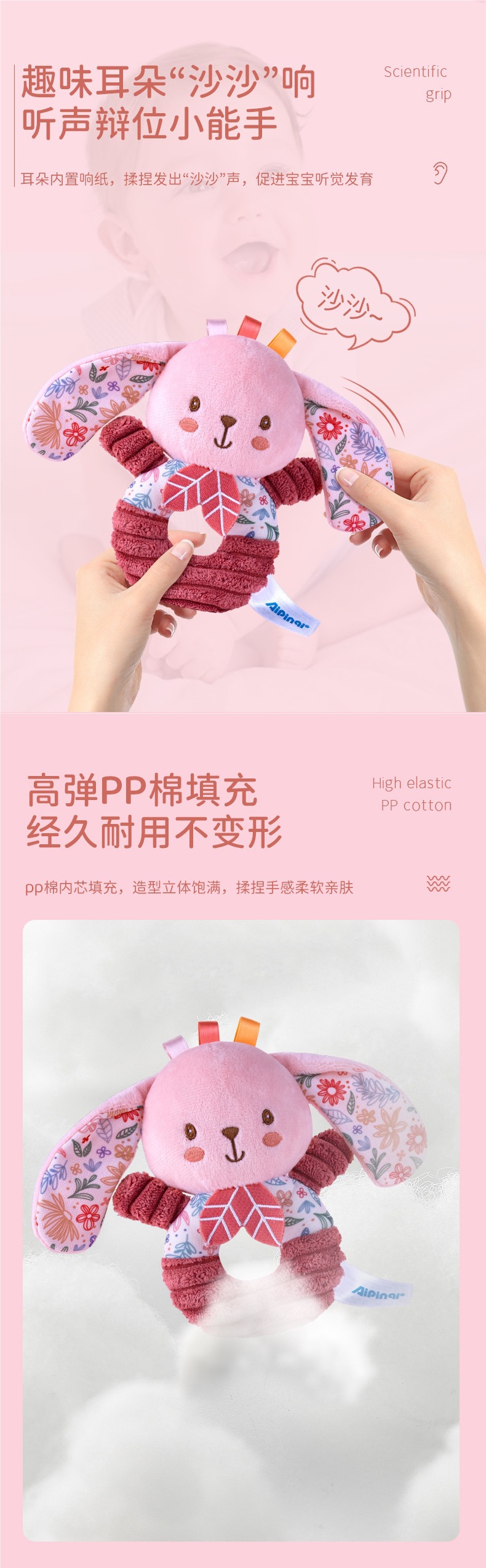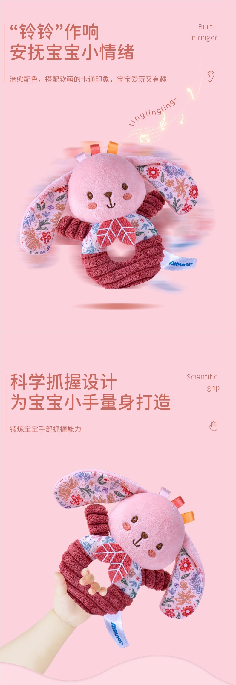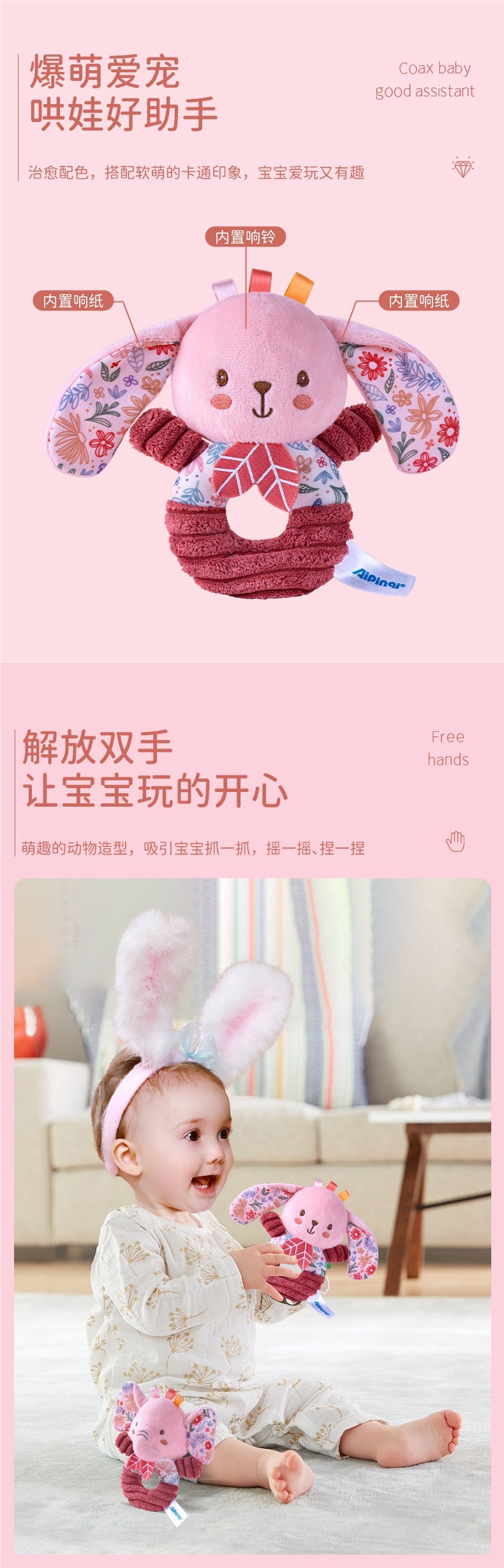 可爱毛绒动物粉色手摇圈 新生儿毛绒公仔玩具0-1岁宝宝BB棒手摇铃