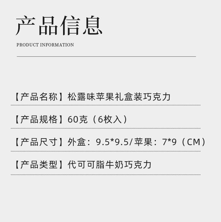 | 60g apple chocolate gift box [6 boxes]](60g苹果巧克力礼盒【6盒】) | USD $17.06 | 999999 piece available |