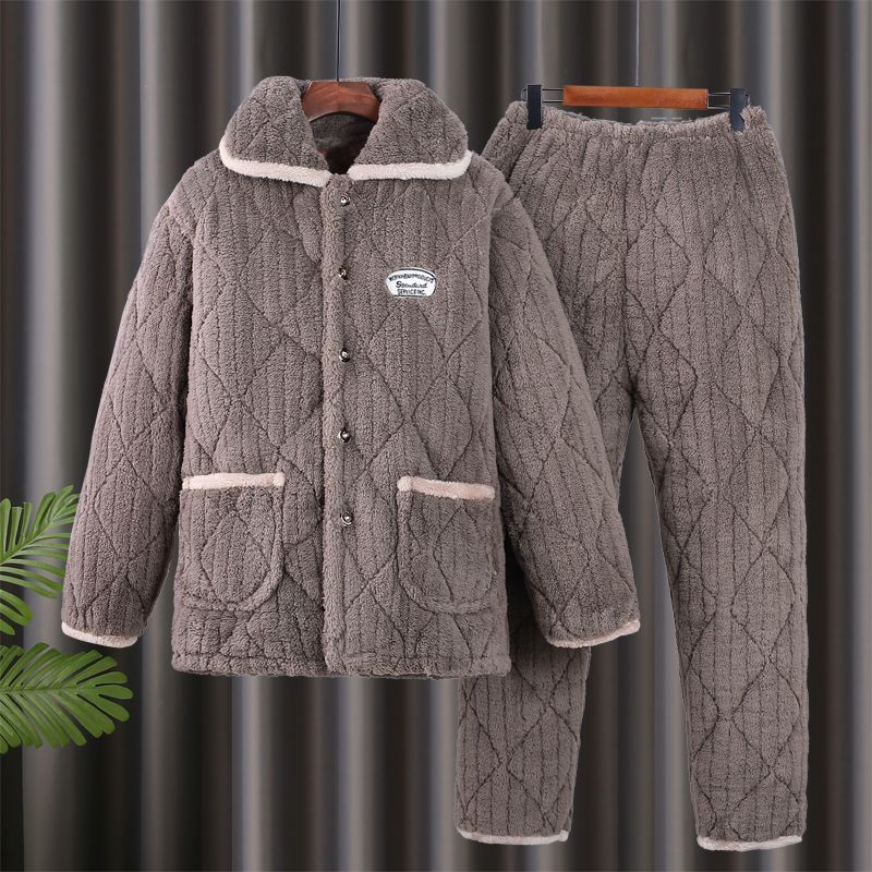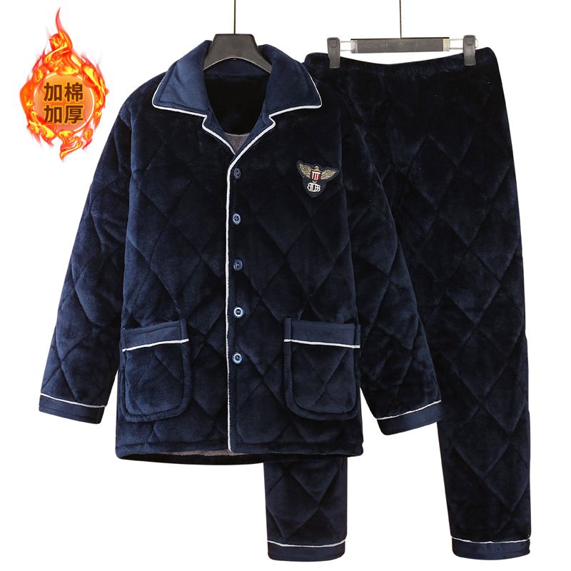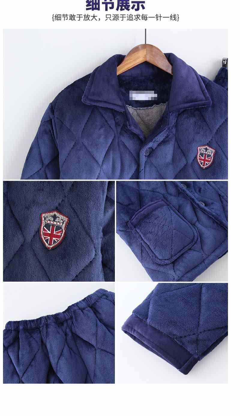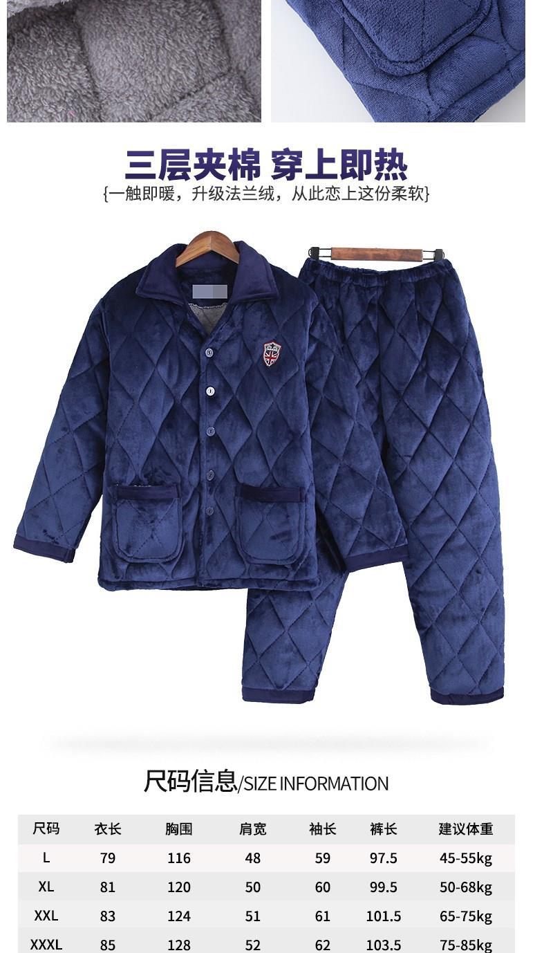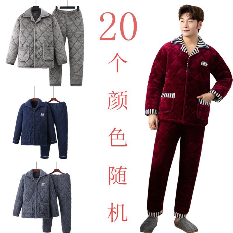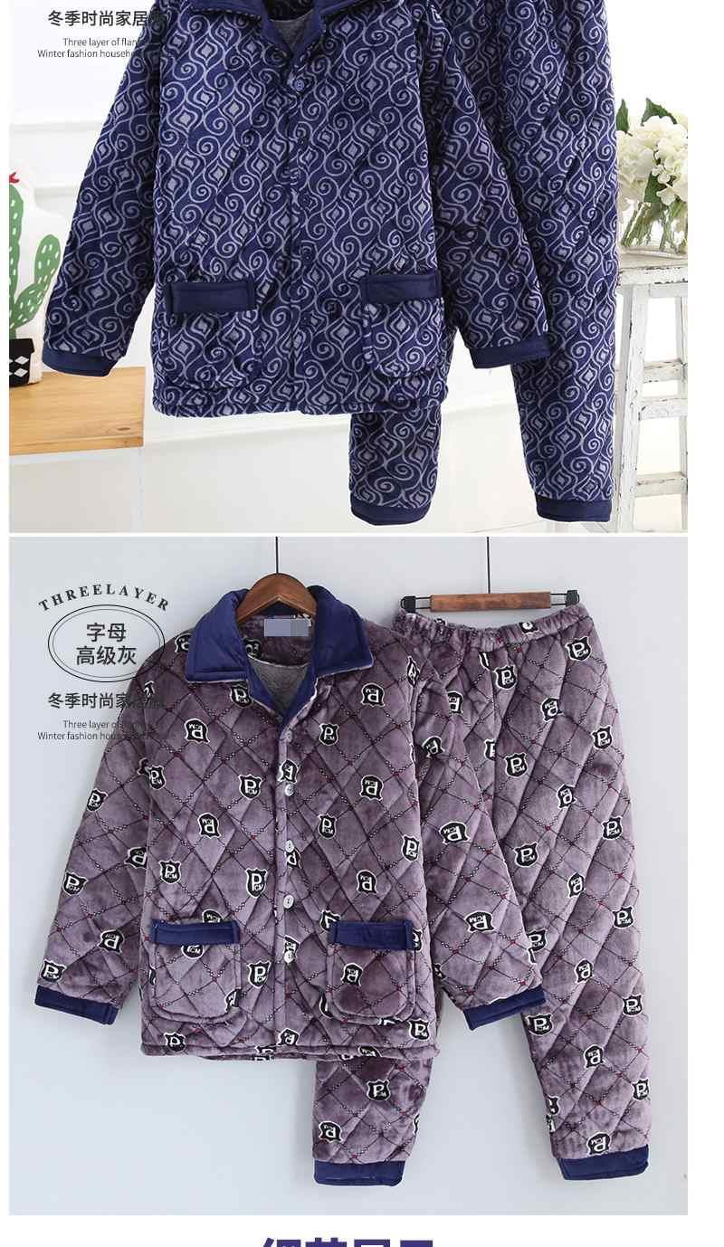 棉睡衣男冬季三层加厚加绒珊瑚绒夹棉男士法兰绒中老年家居服套装