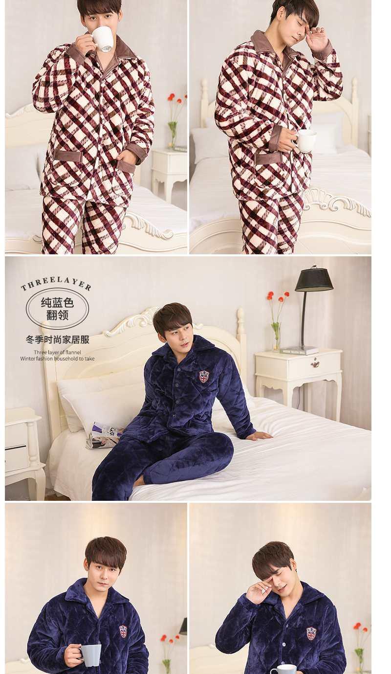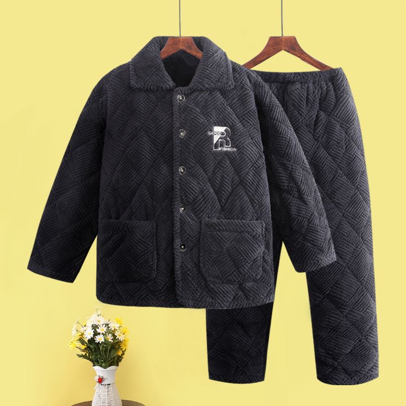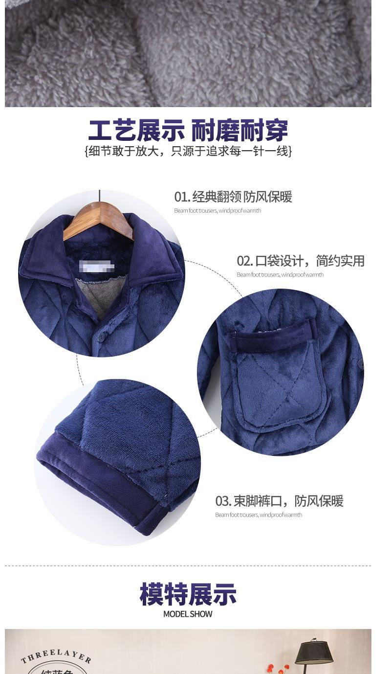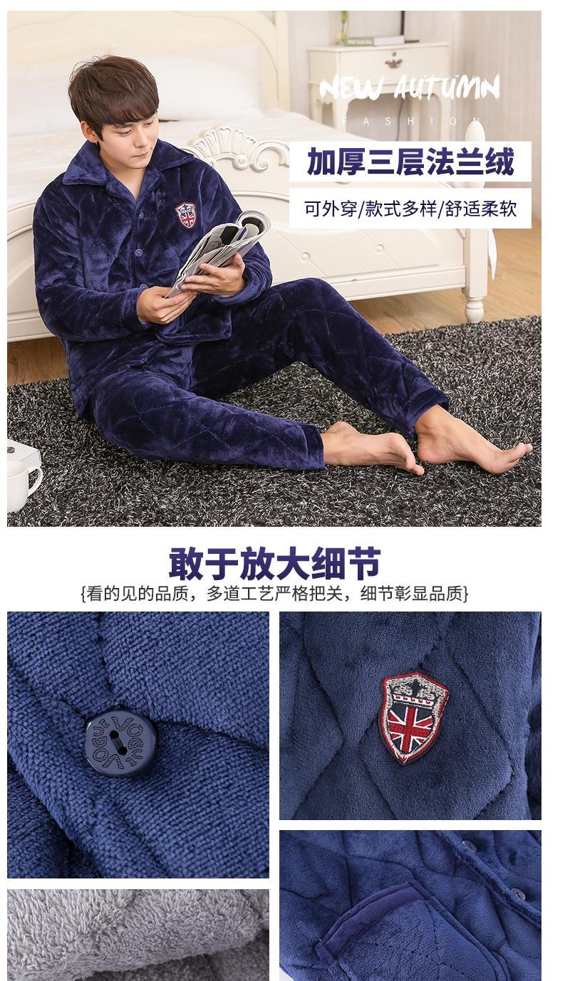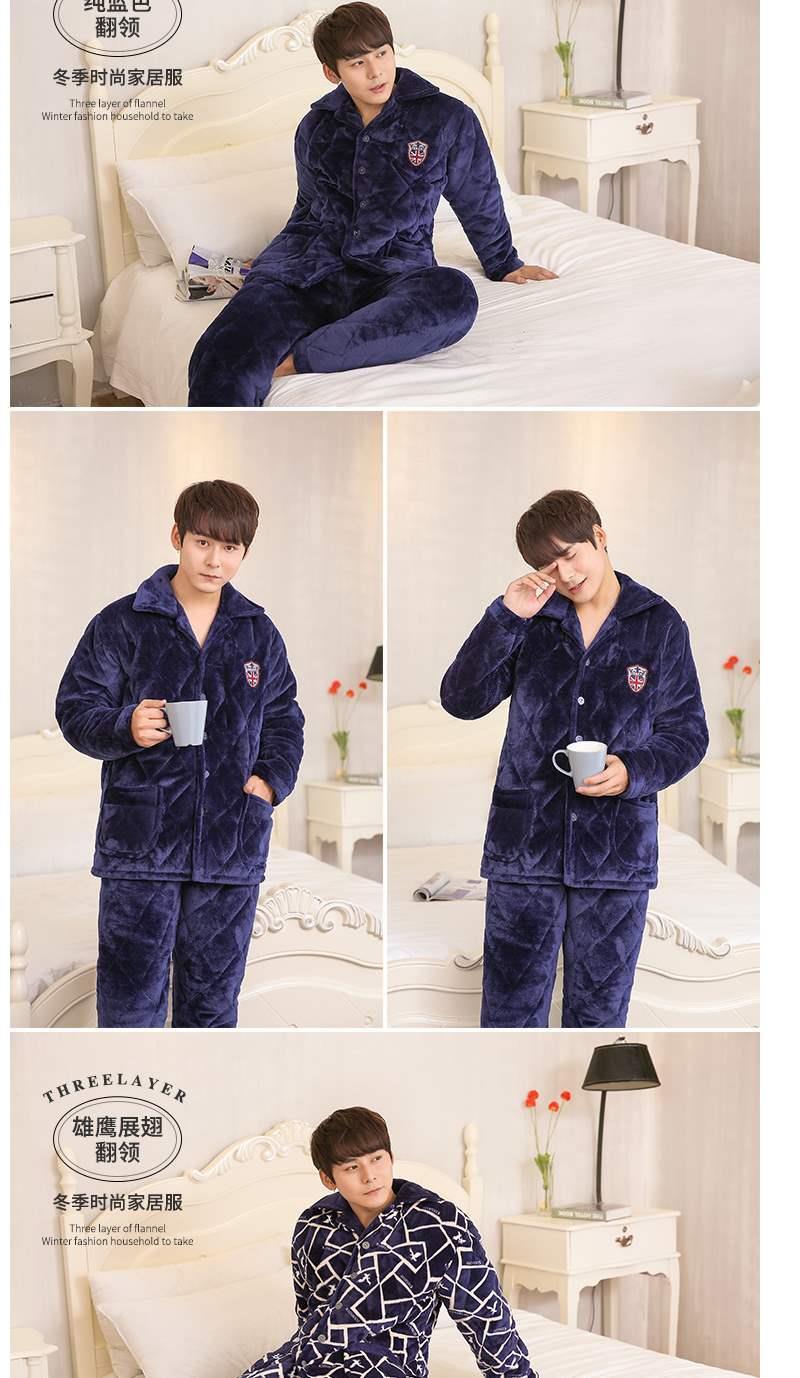 棉睡衣男冬季三层加厚加绒珊瑚绒夹棉男士法兰绒中老年家居服套装
