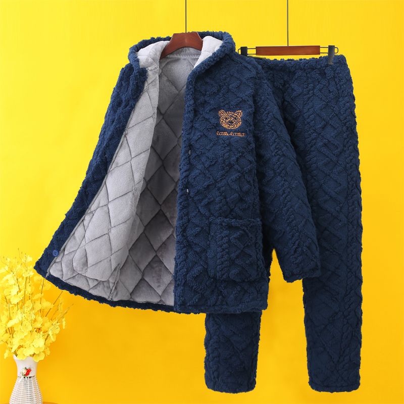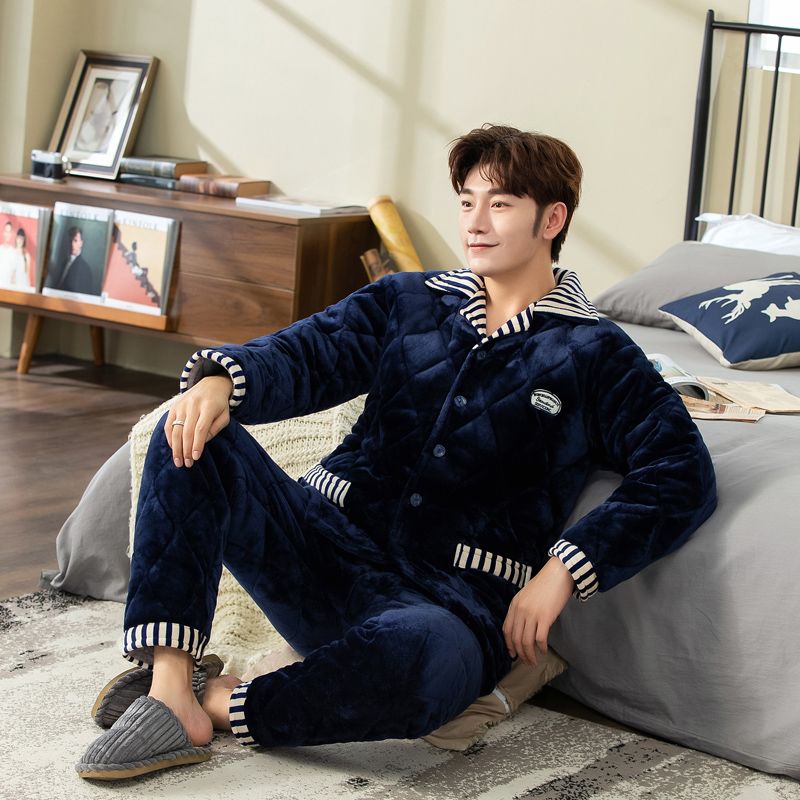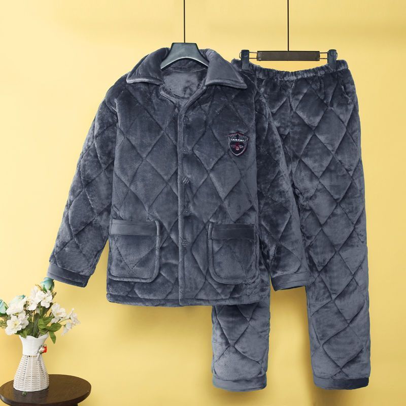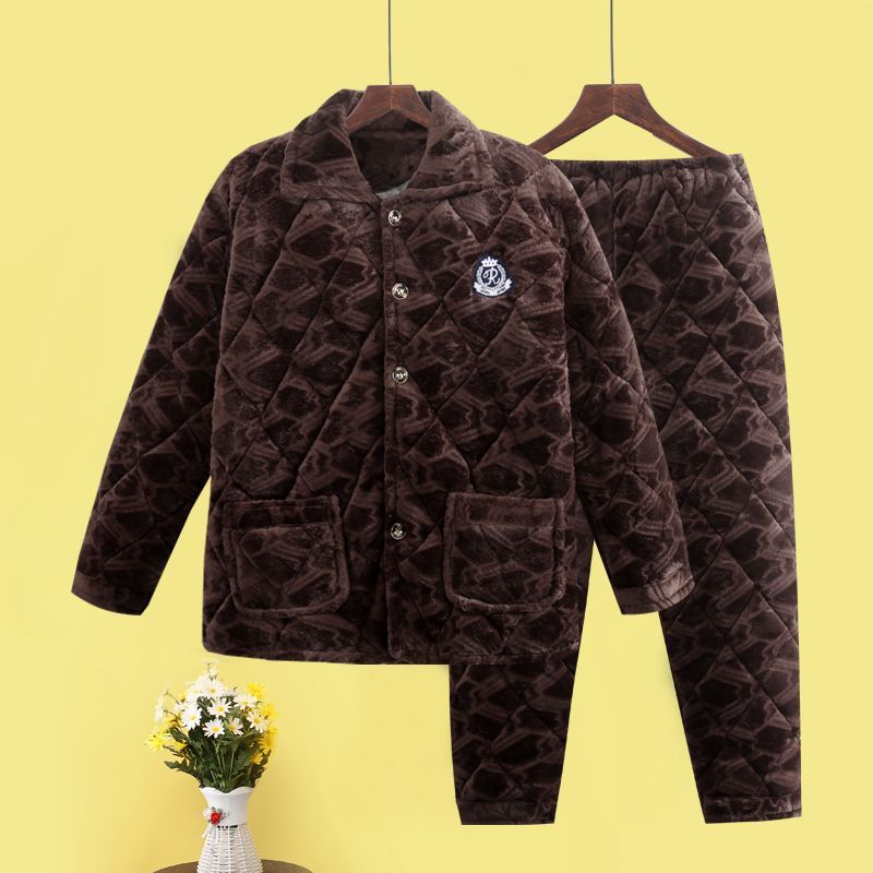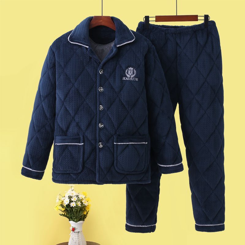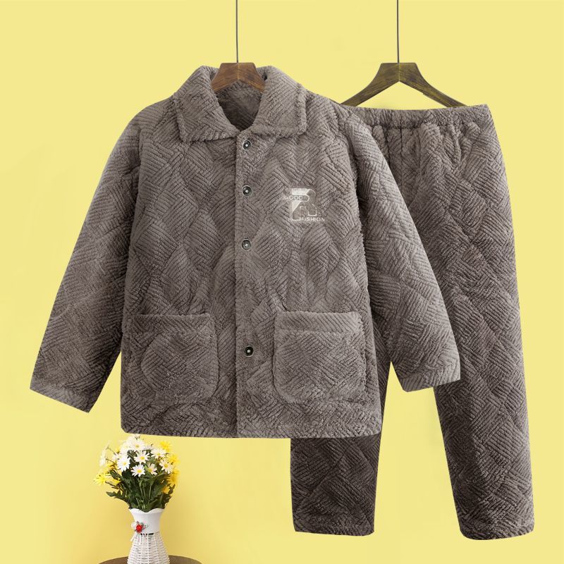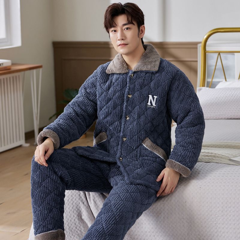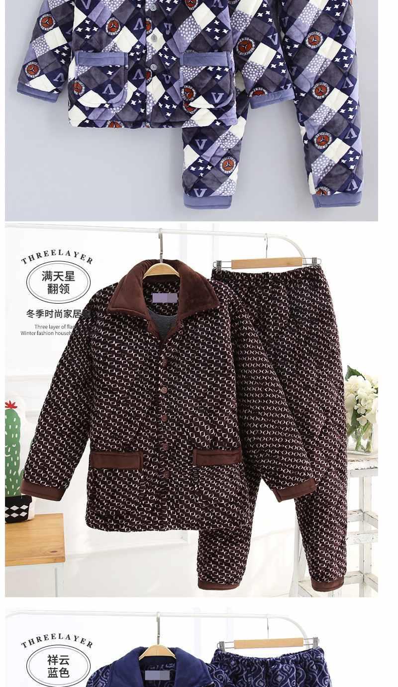 棉睡衣男冬季三层加厚加绒珊瑚绒夹棉男士法兰绒中老年家居服套装