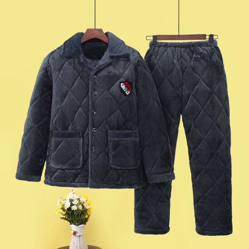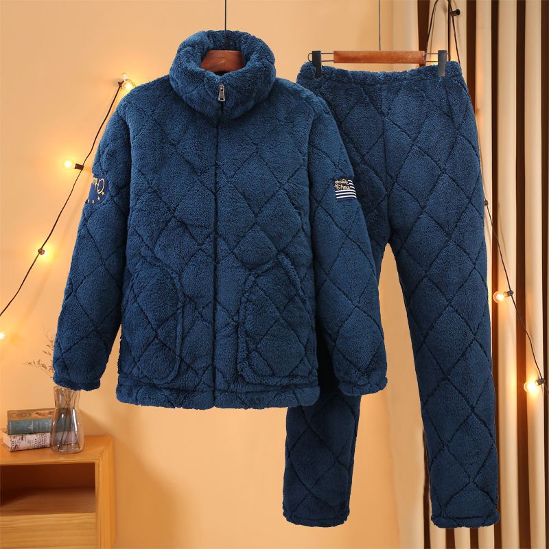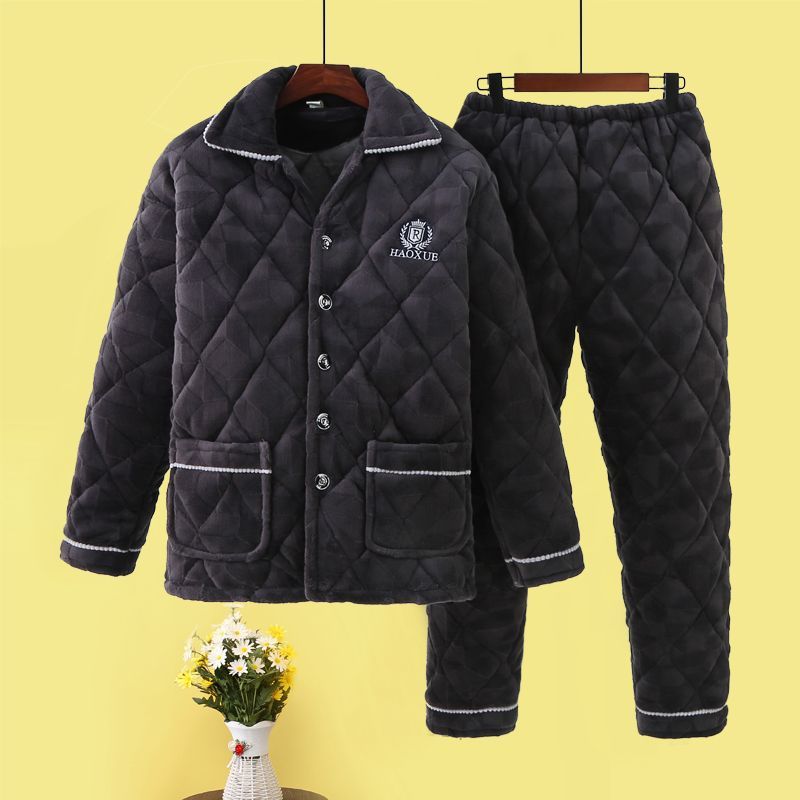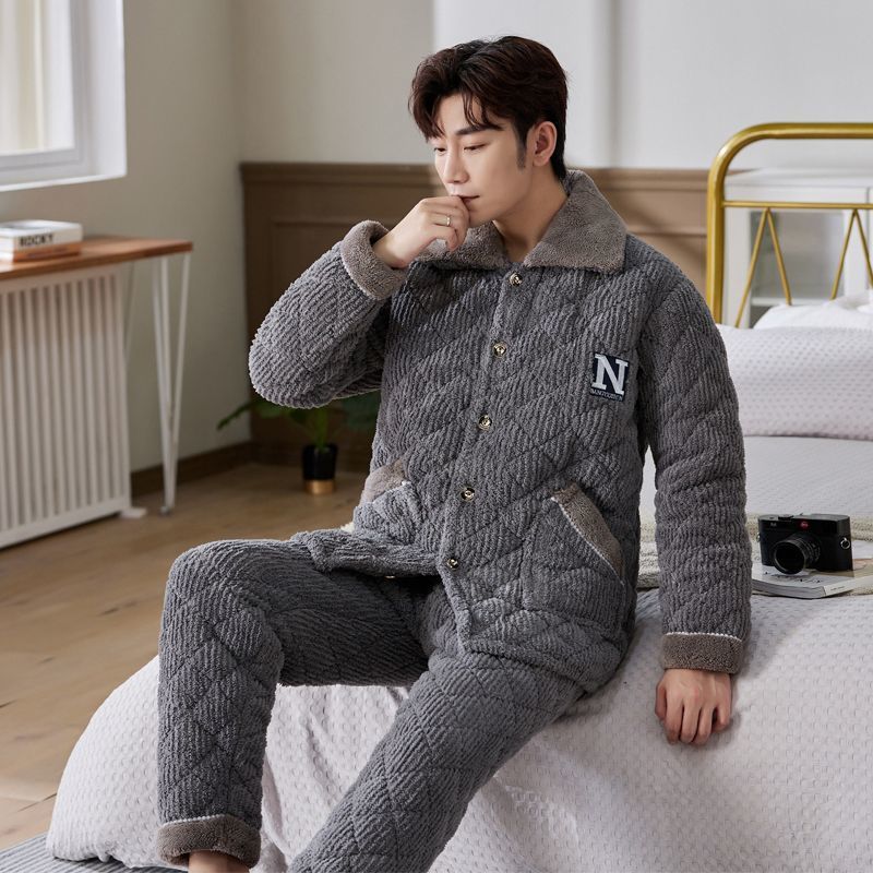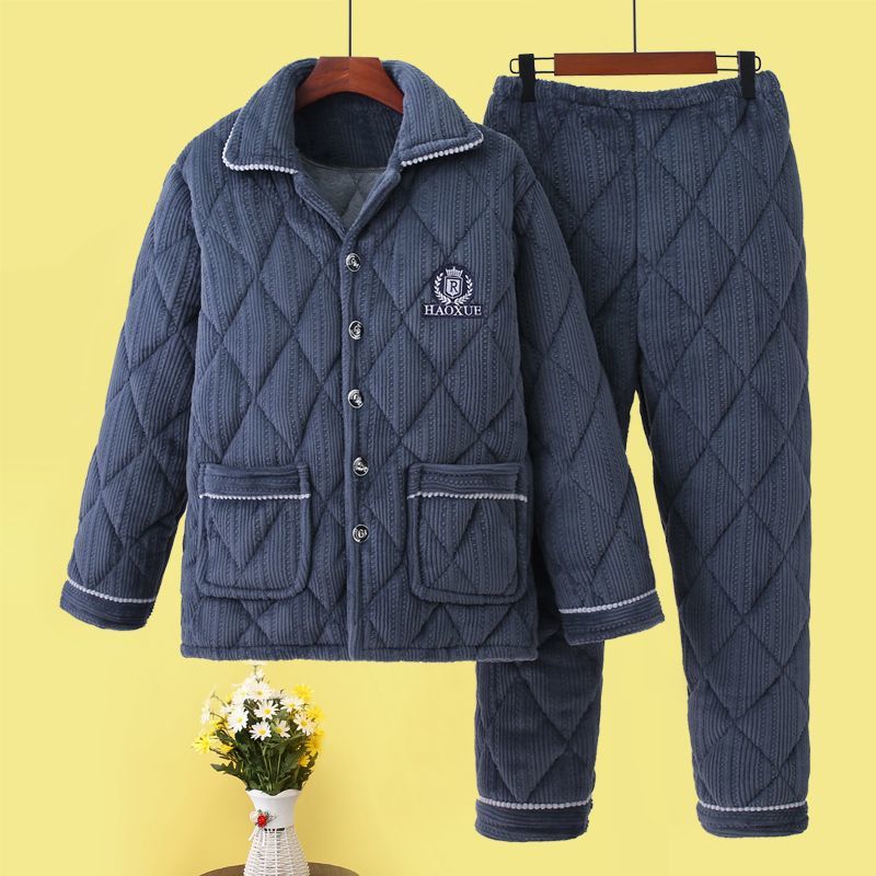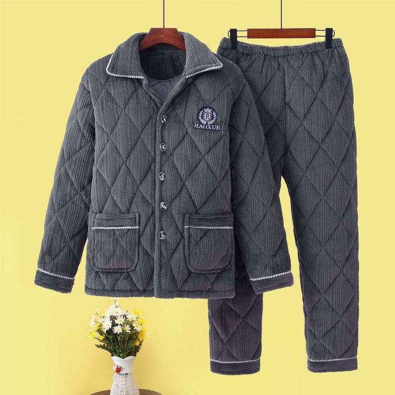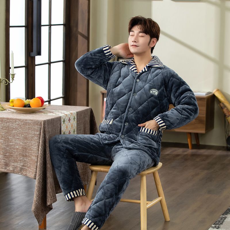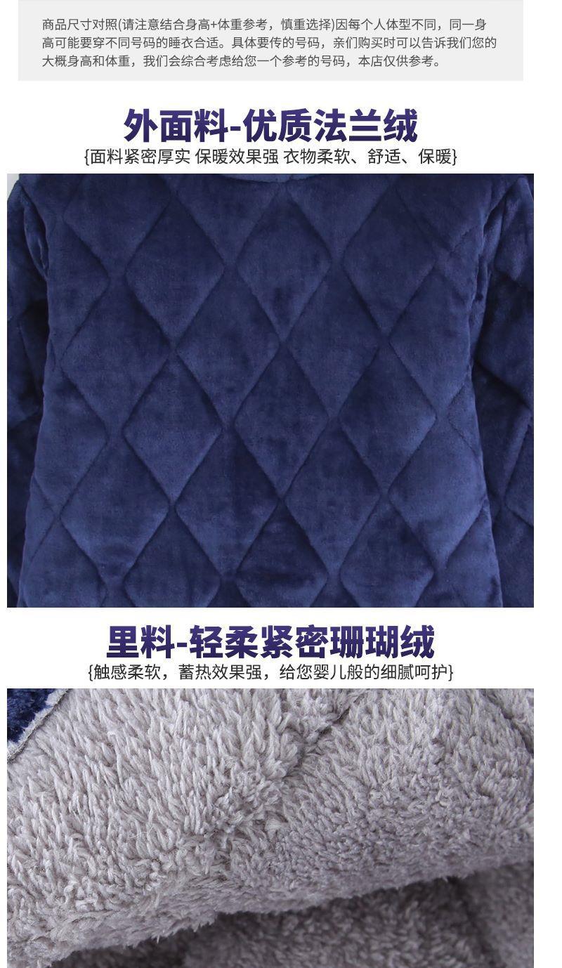 棉睡衣男冬季三层加厚加绒珊瑚绒夹棉男士法兰绒中老年家居服套装