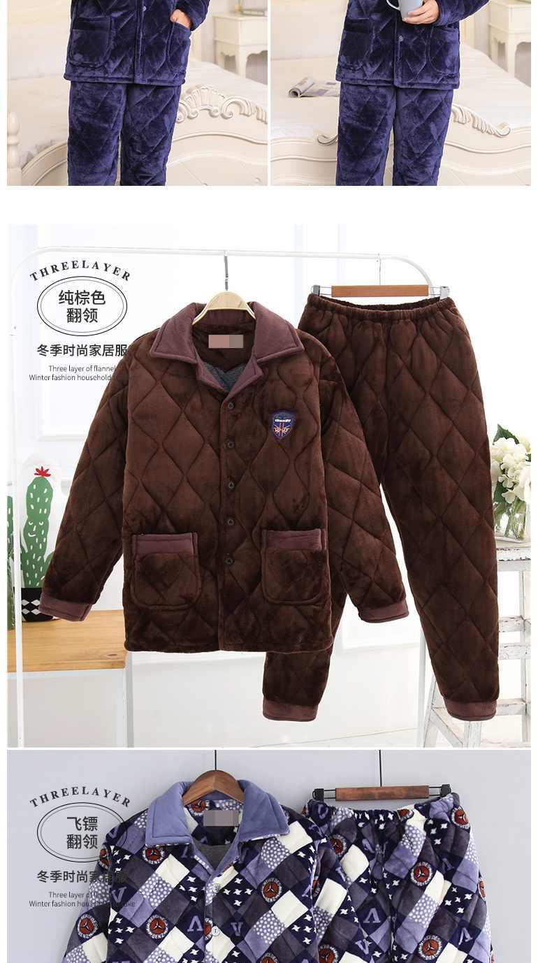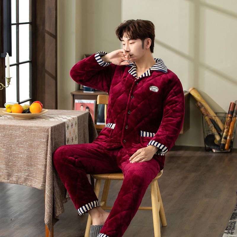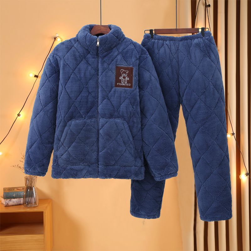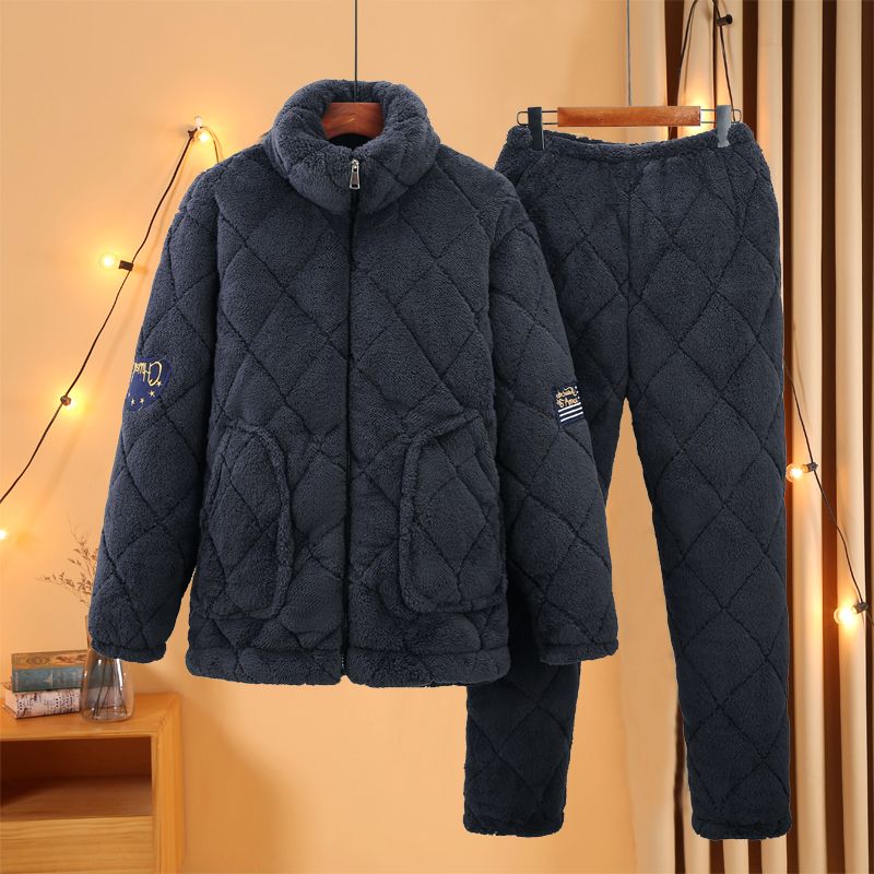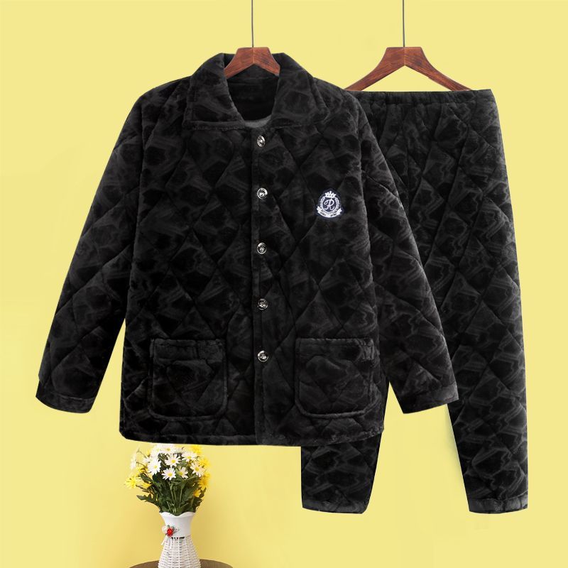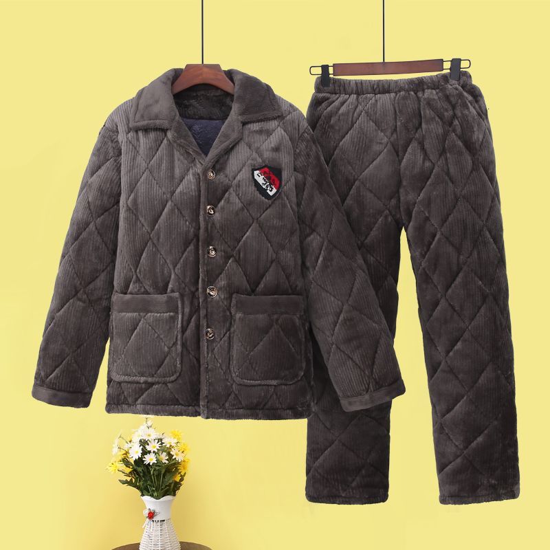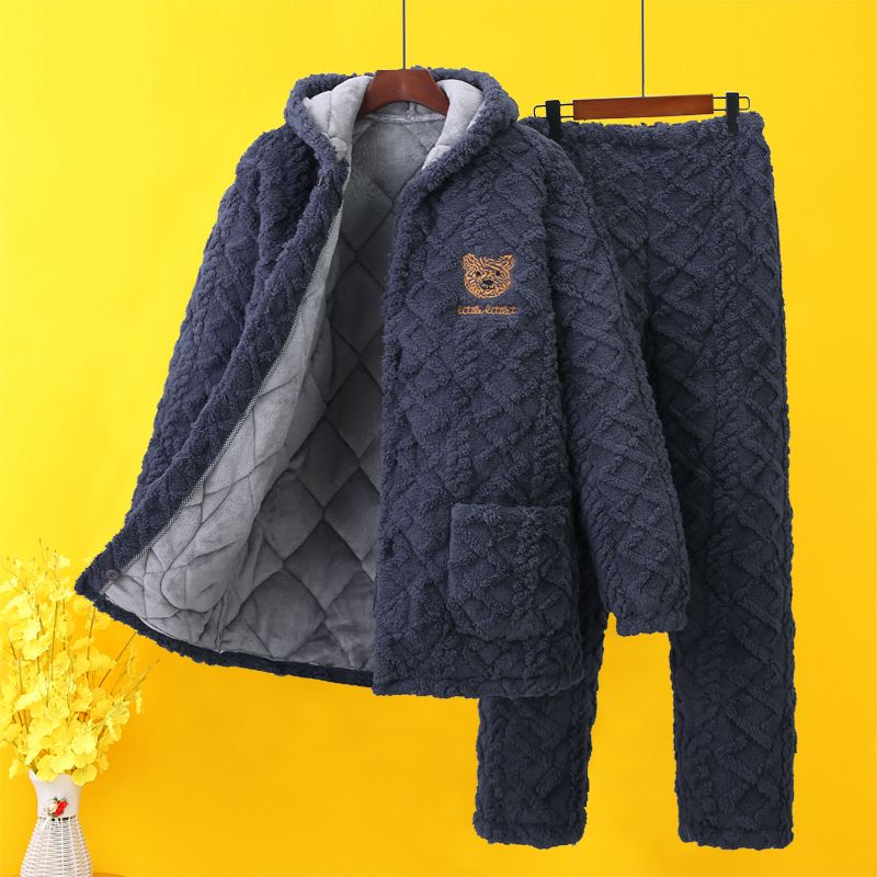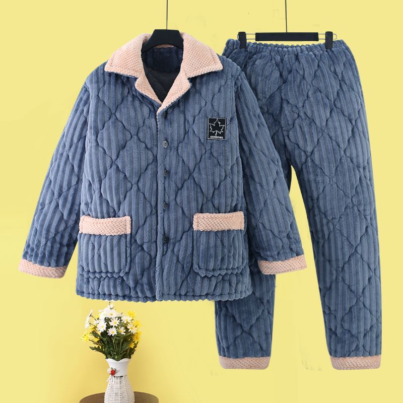 棉睡衣男冬季三层加厚加绒珊瑚绒夹棉男士法兰绒中老年家居服套装