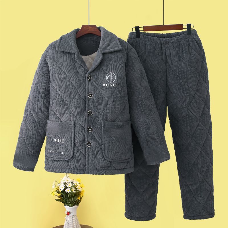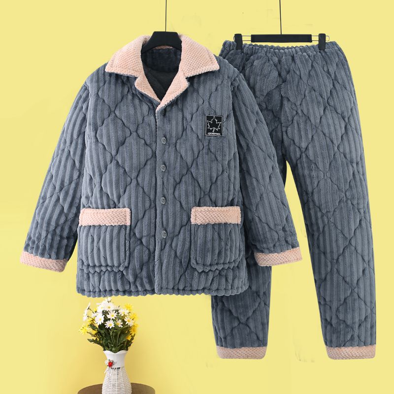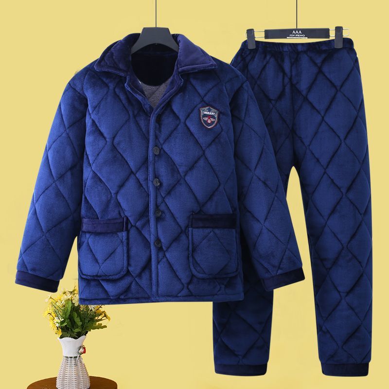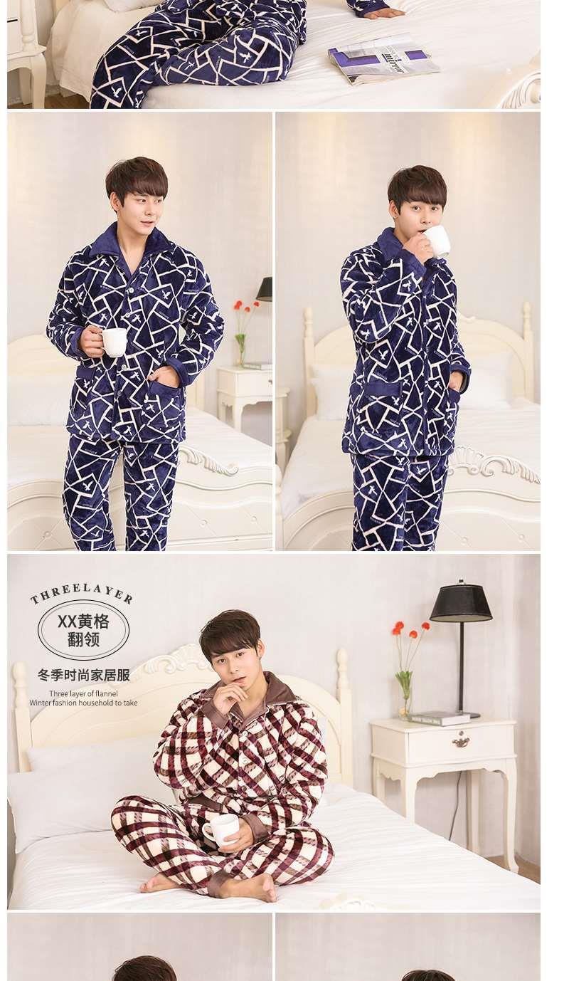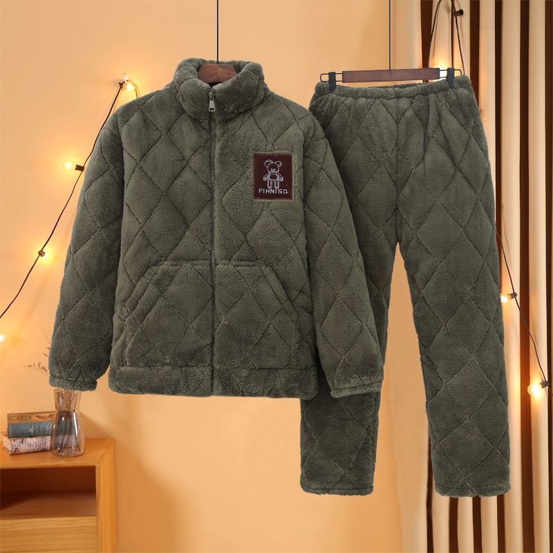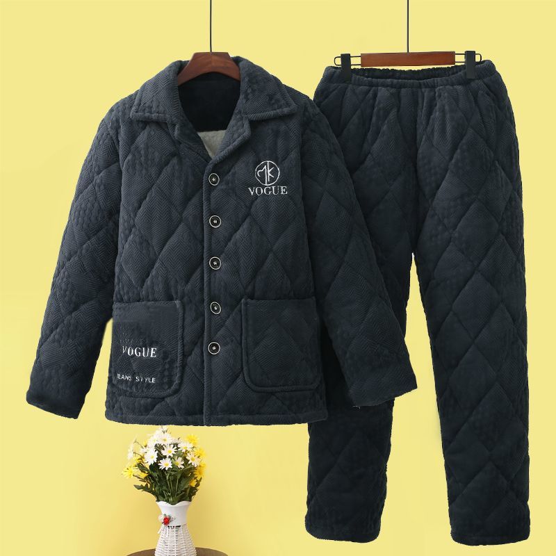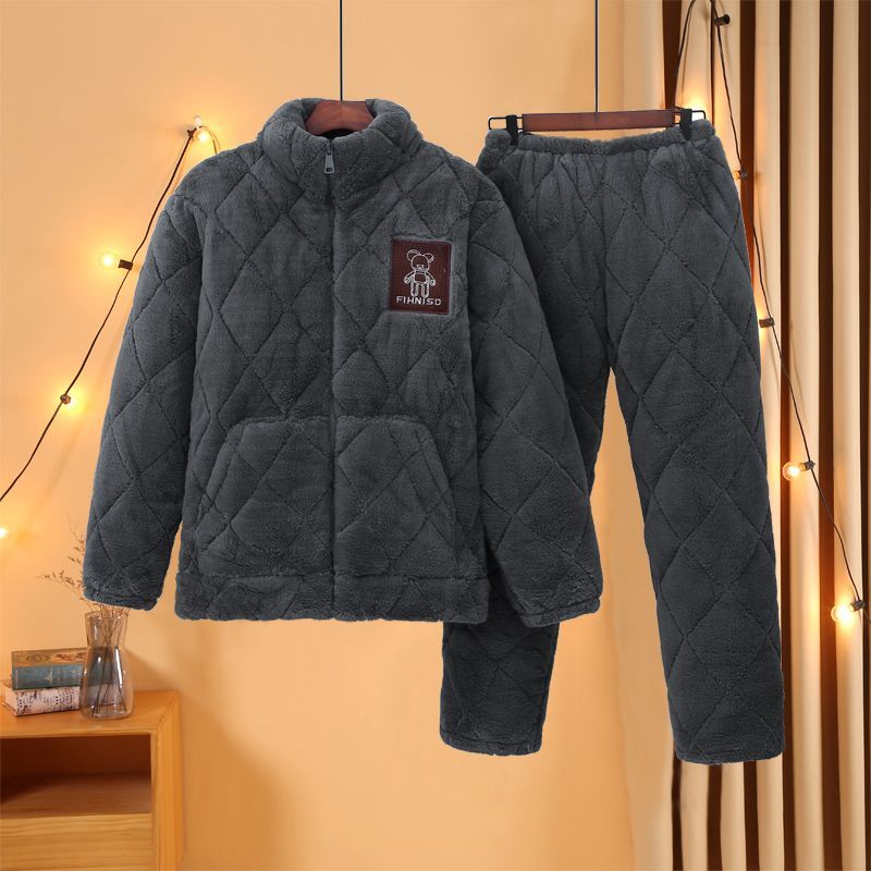 棉睡衣男冬季三层加厚加绒珊瑚绒夹棉男士法兰绒中老年家居服套装
