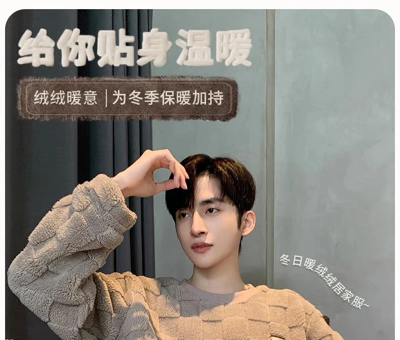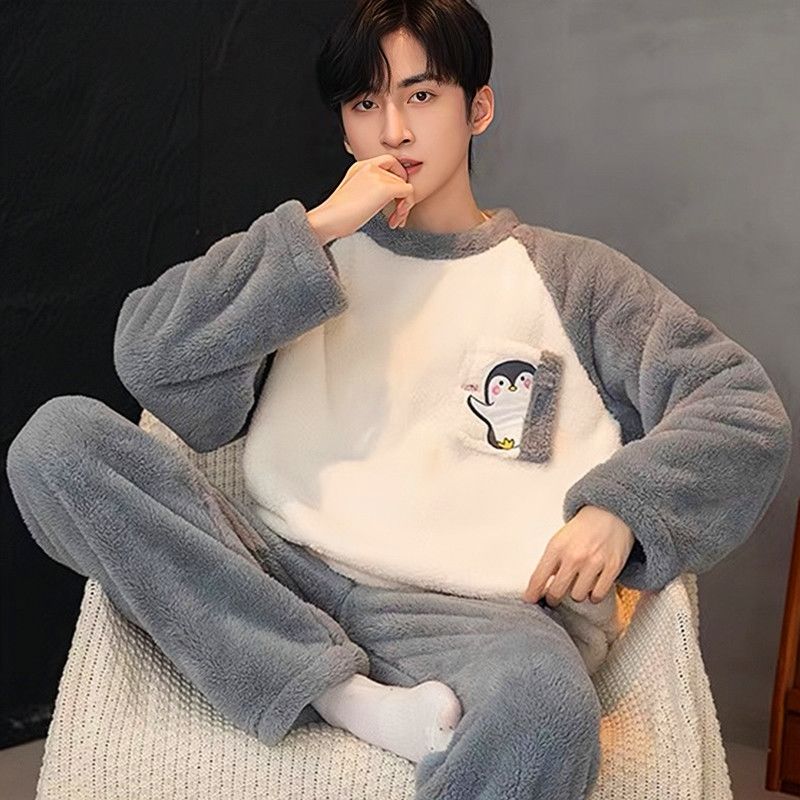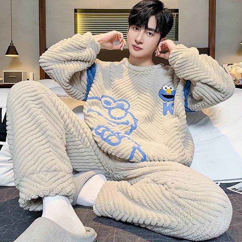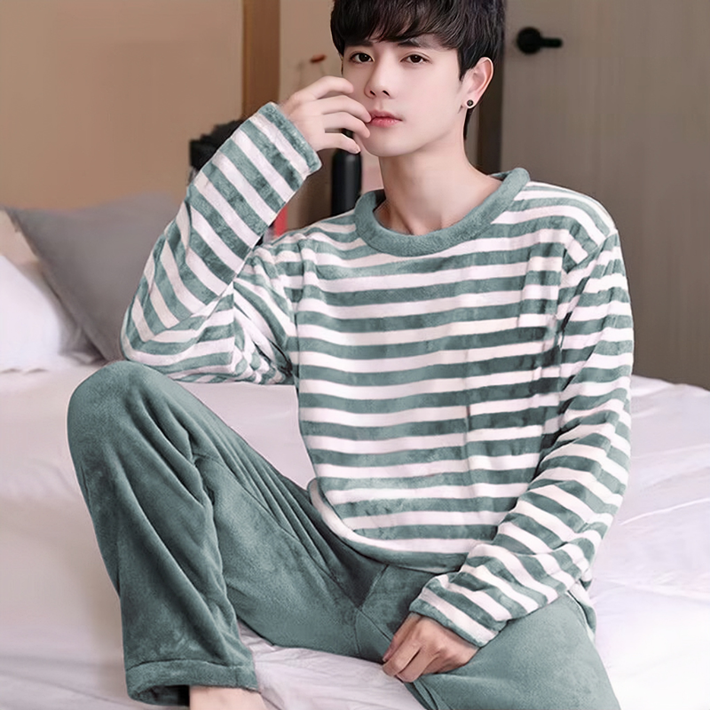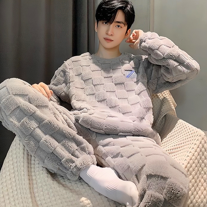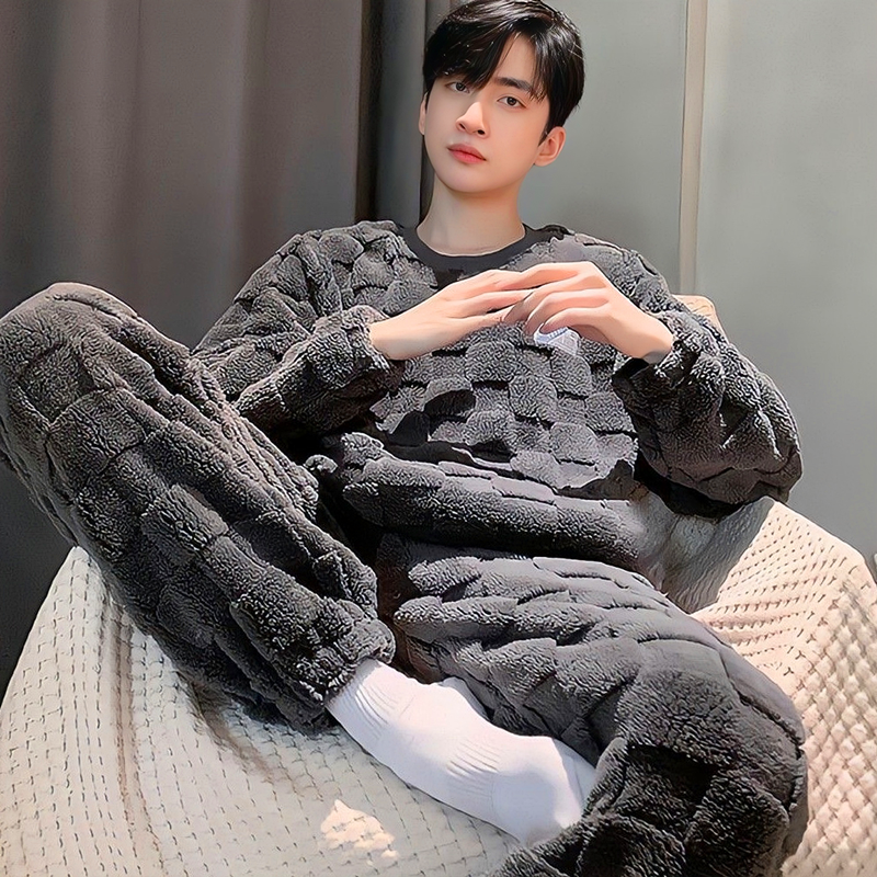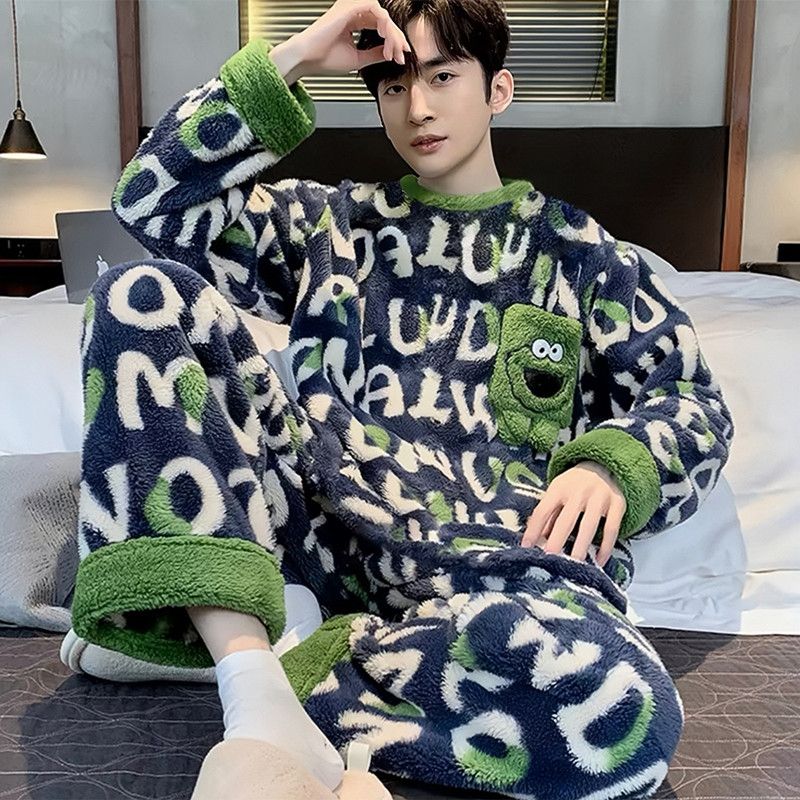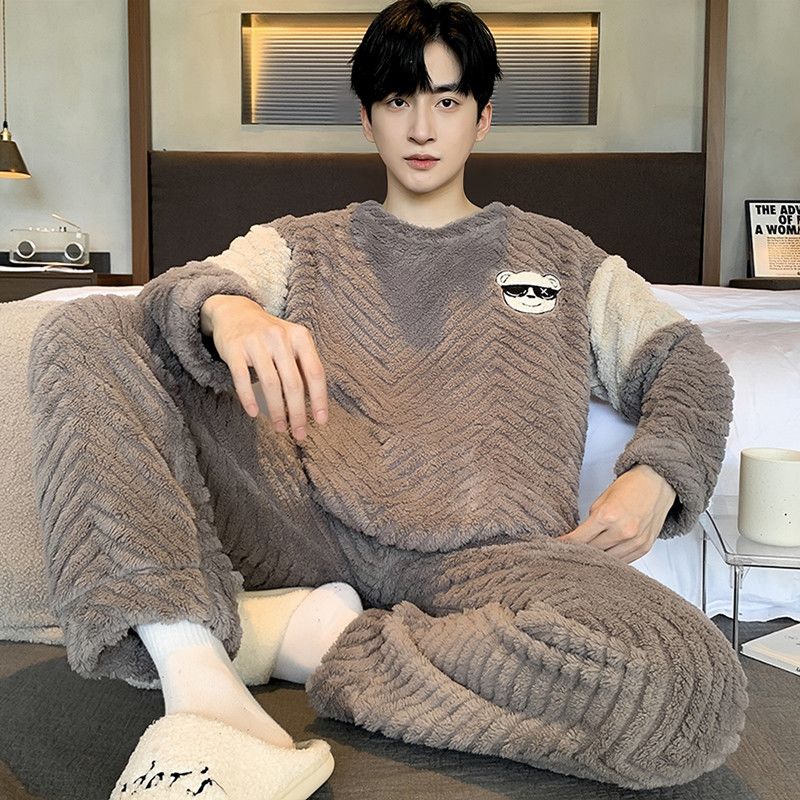 新款男士睡衣秋冬季珊瑚绒加厚加绒保暖家居服青少年睡衣外穿套装