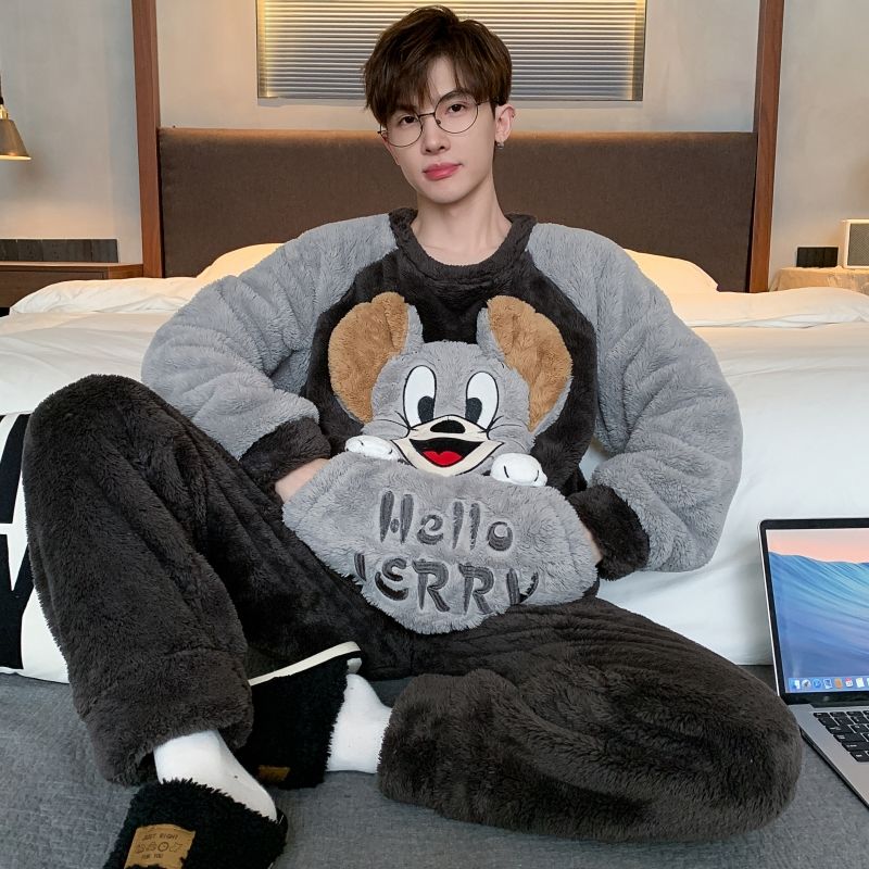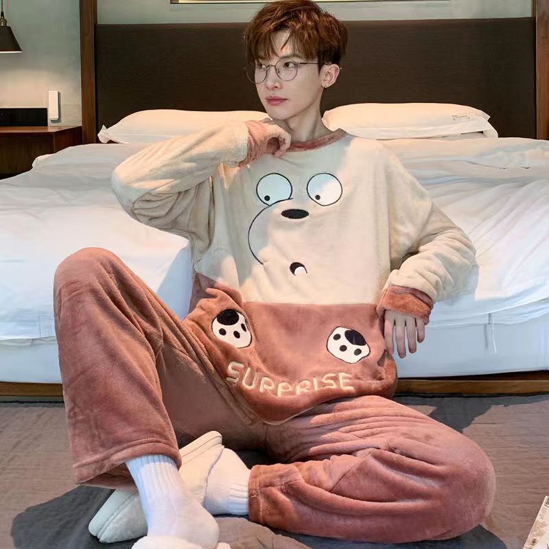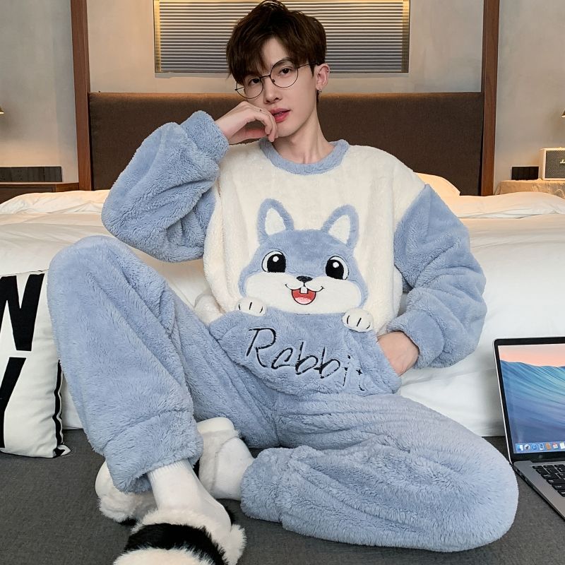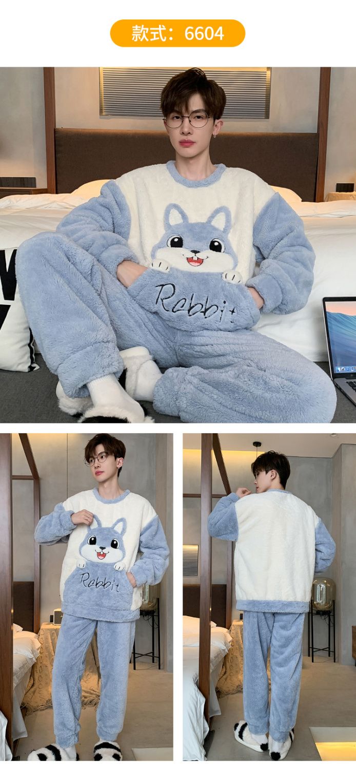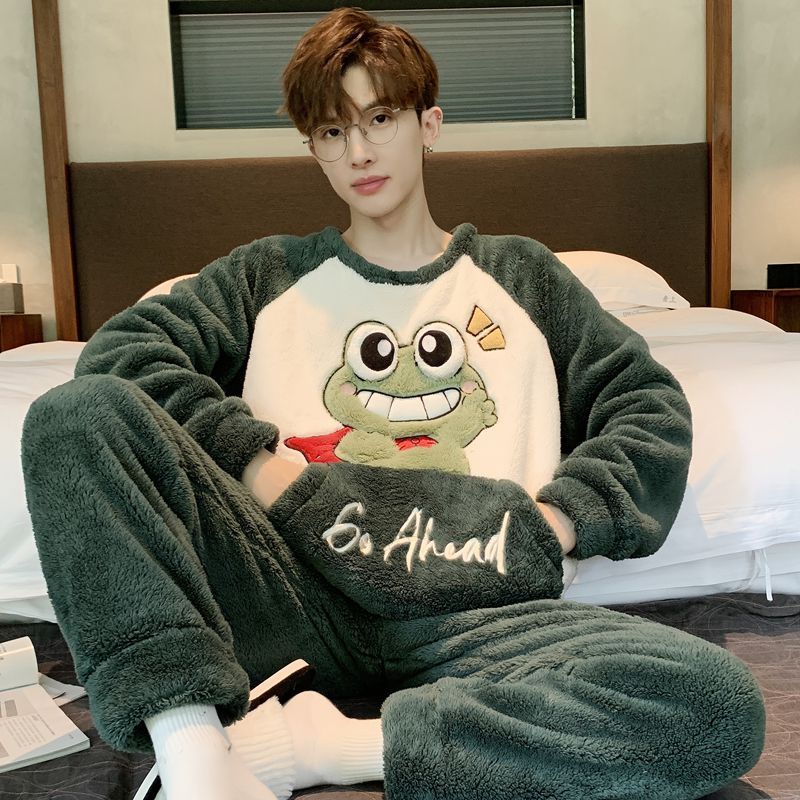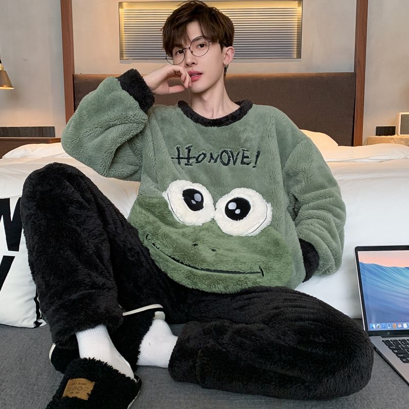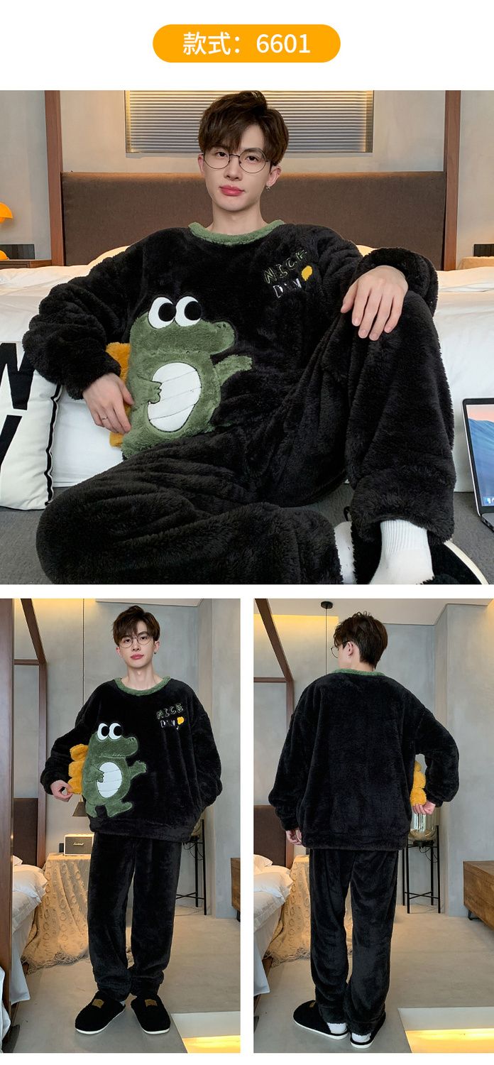 男士睡衣秋冬季珊瑚绒加绒加厚法兰绒卡通长毛绒加大码家居服套装