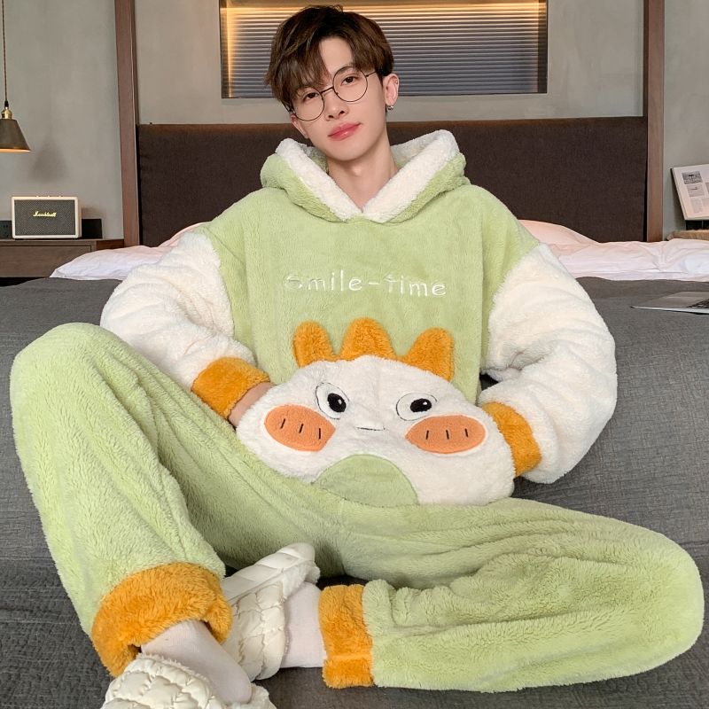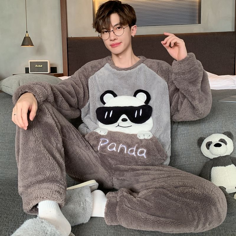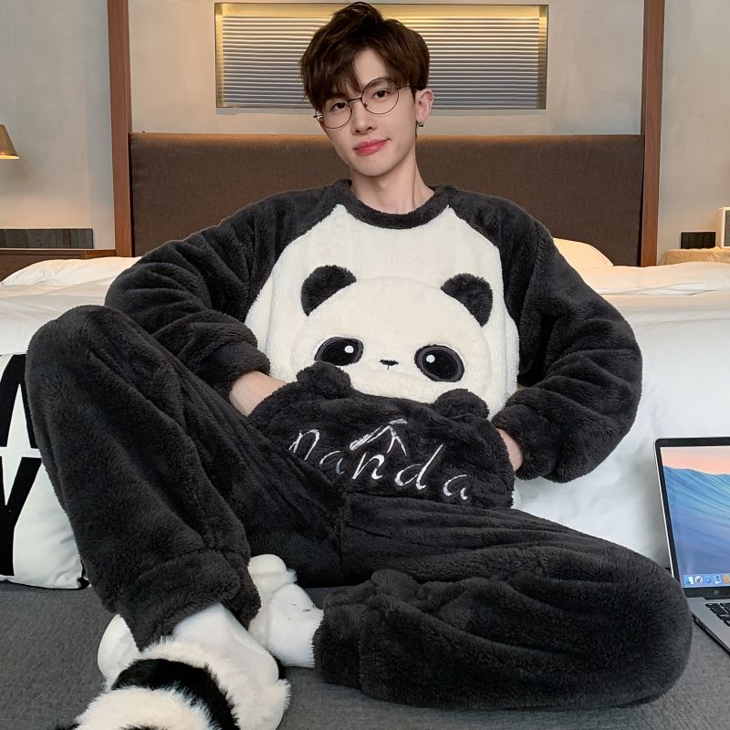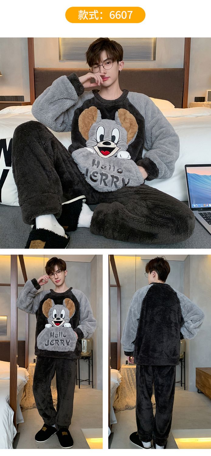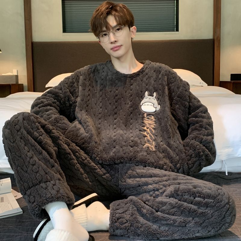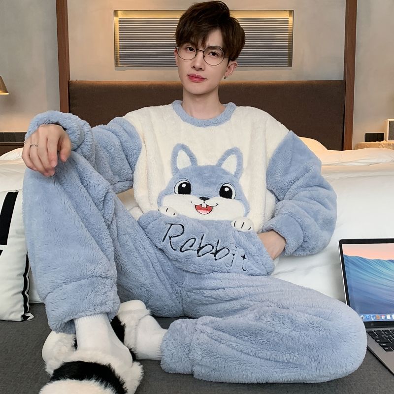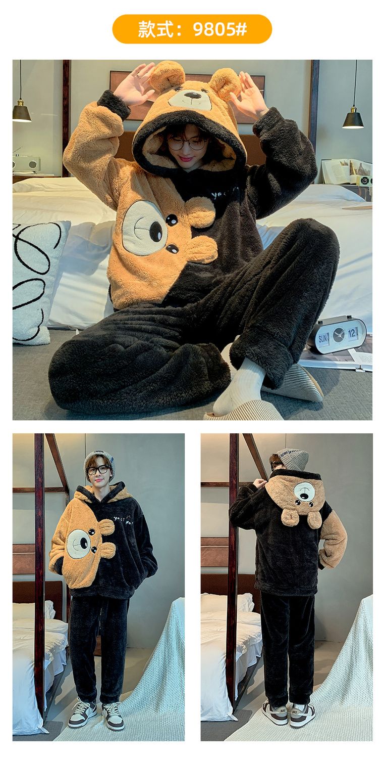 男士睡衣秋冬季珊瑚绒加绒加厚法兰绒卡通长毛绒加大码家居服套装