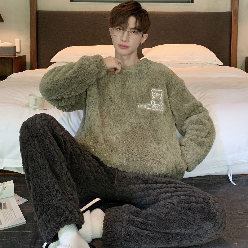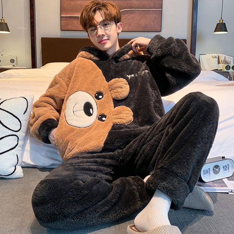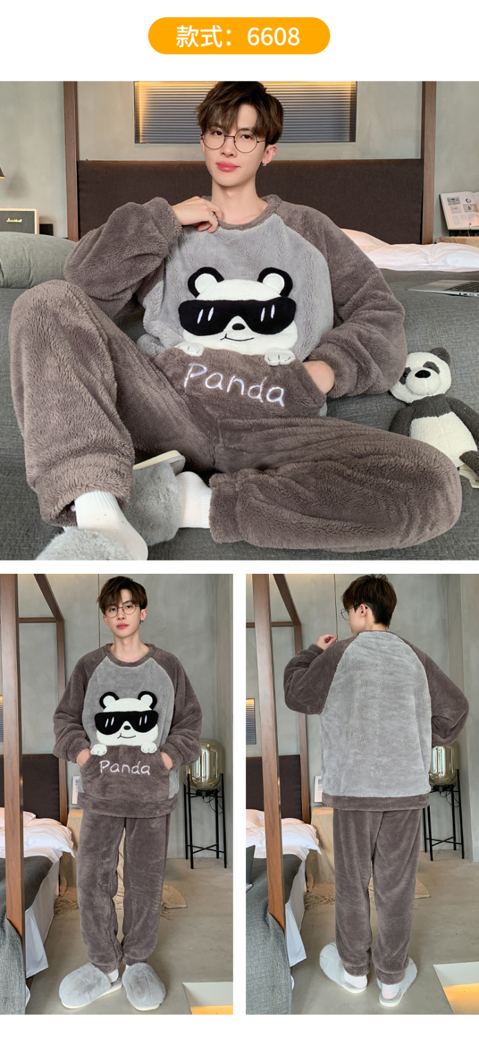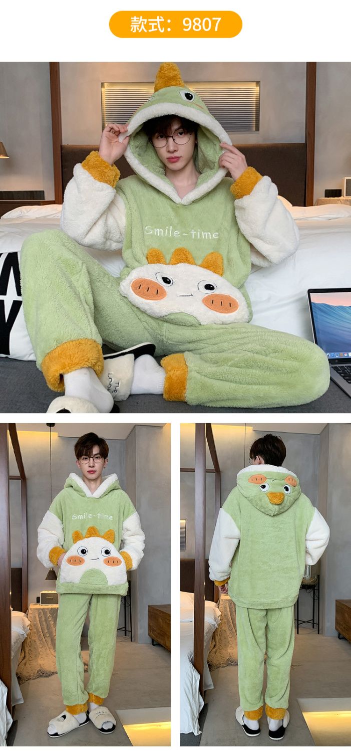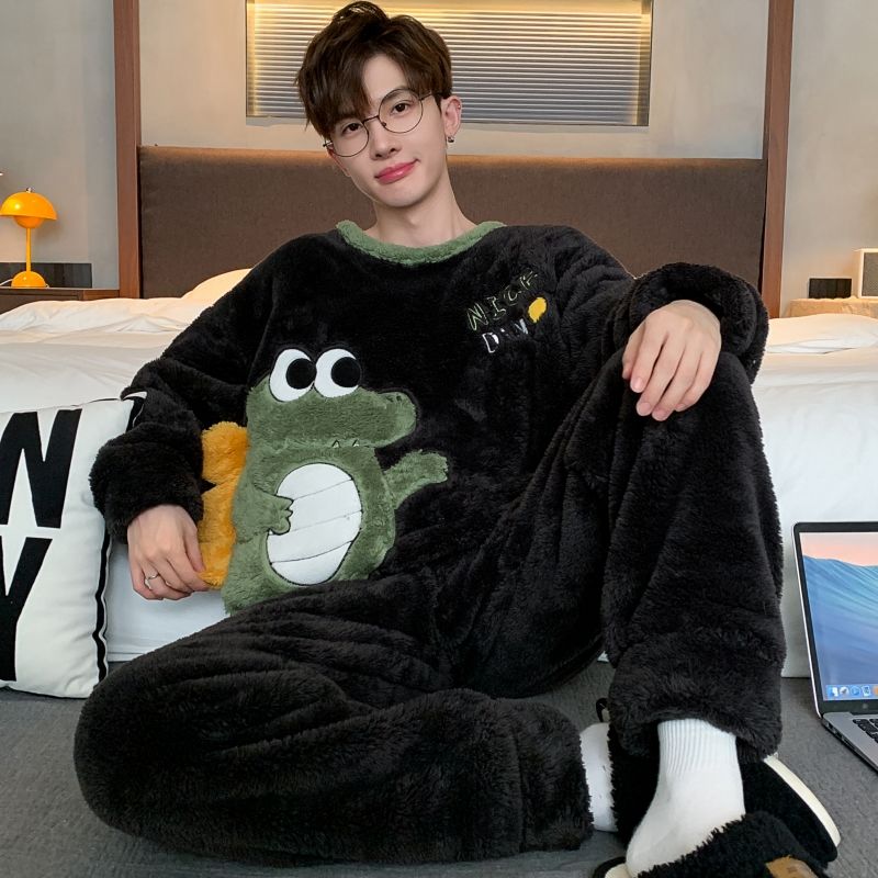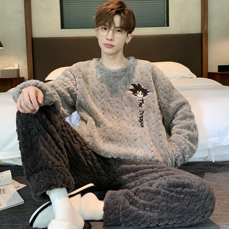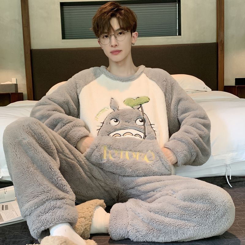 男士睡衣秋冬季珊瑚绒加绒加厚法兰绒卡通长毛绒加大码家居服套装