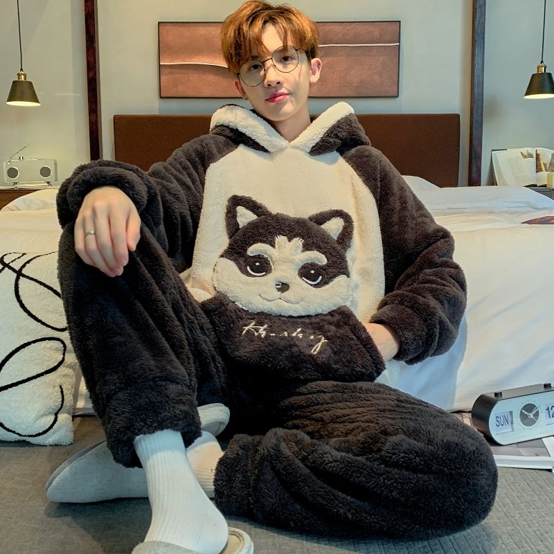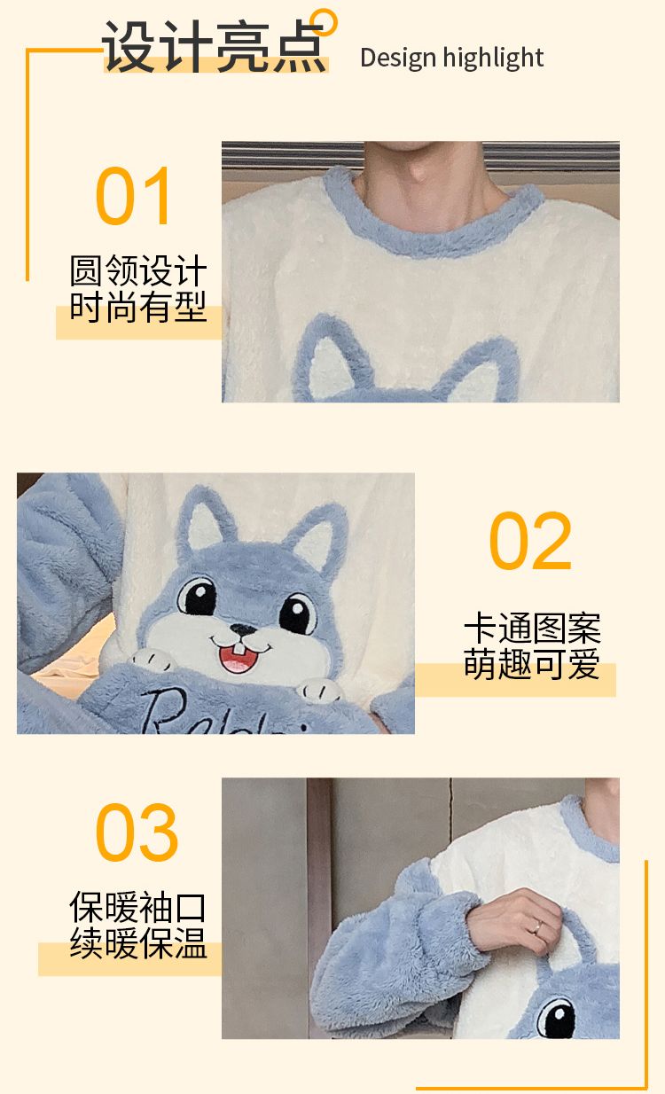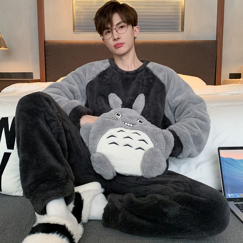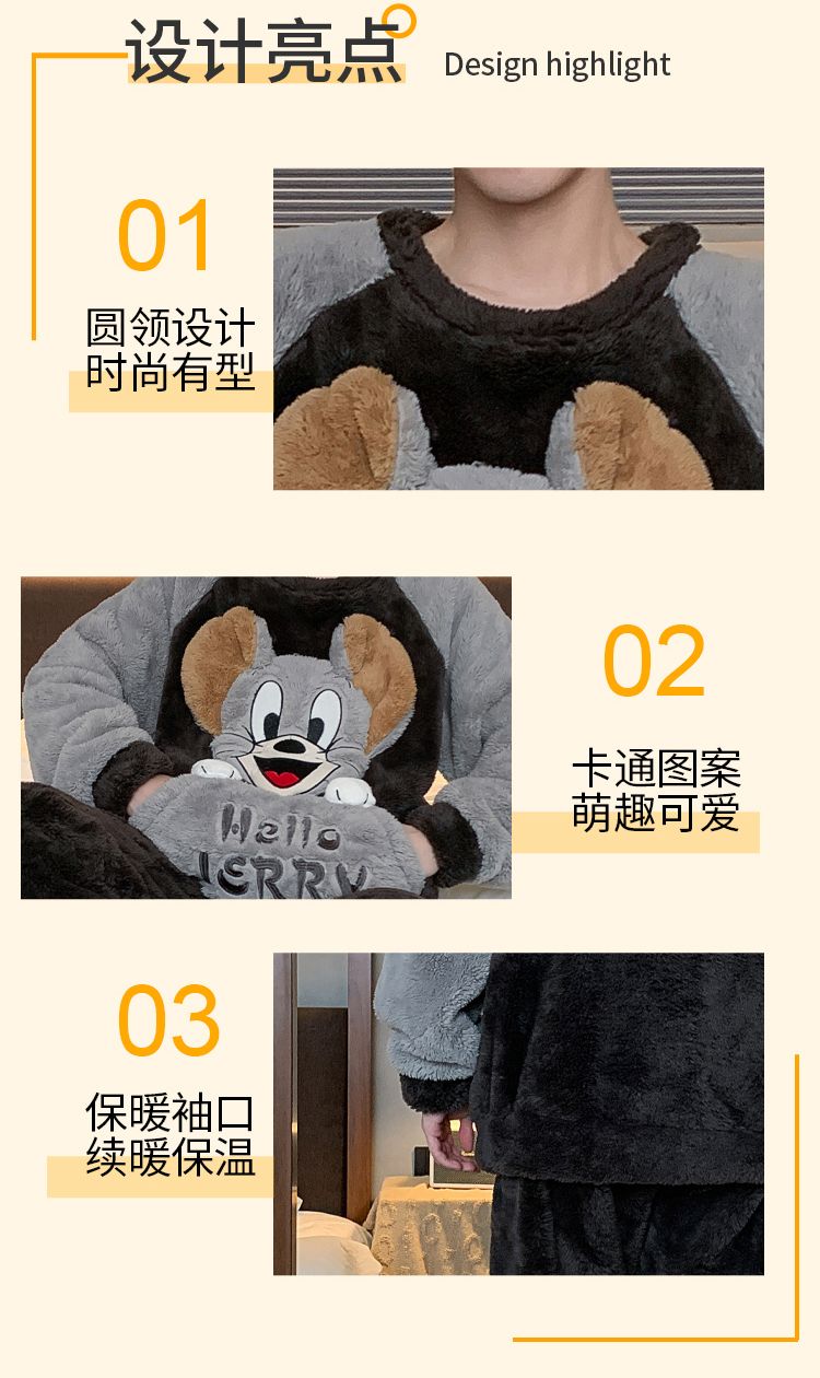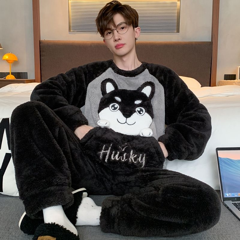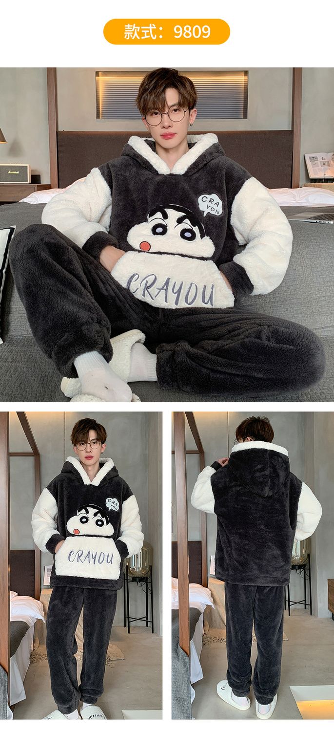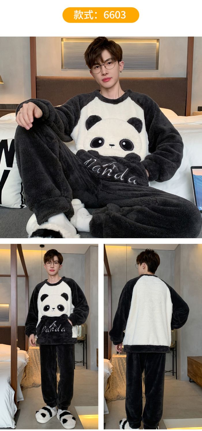 男士睡衣秋冬季珊瑚绒加绒加厚法兰绒卡通长毛绒加大码家居服套装