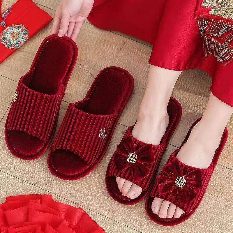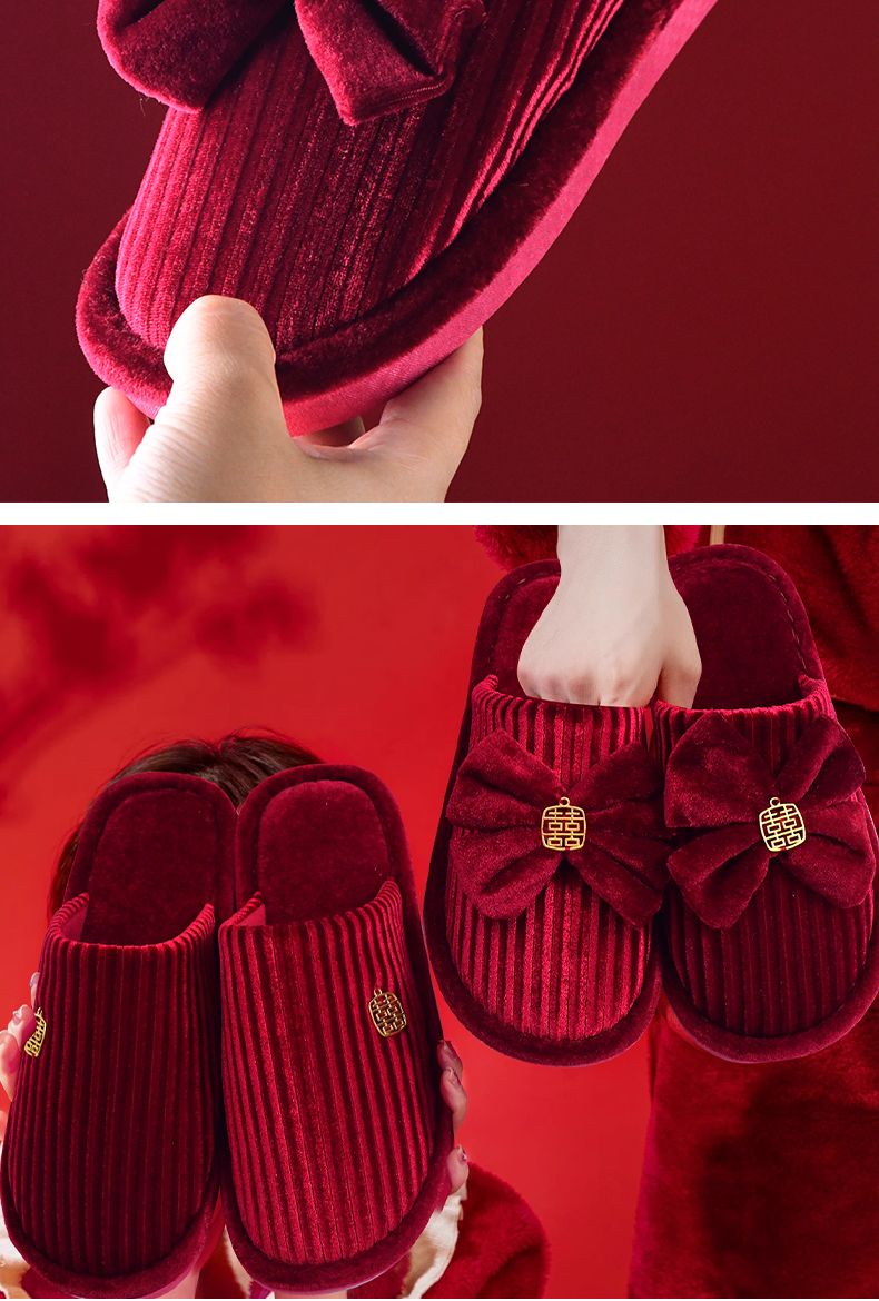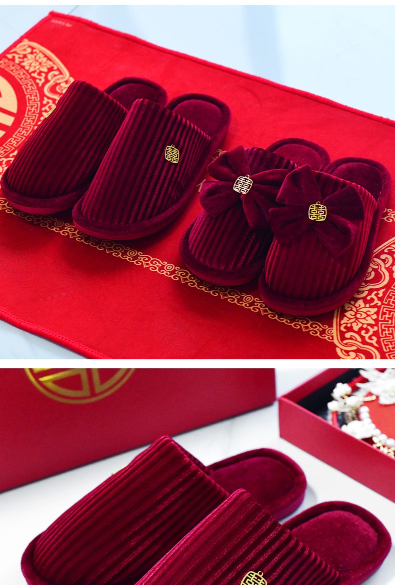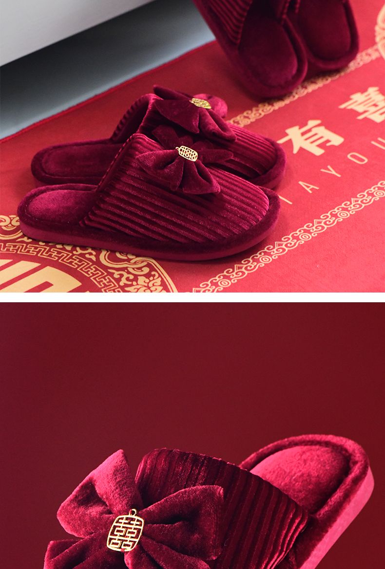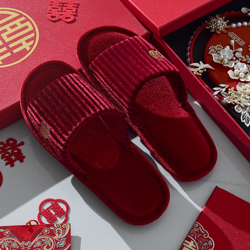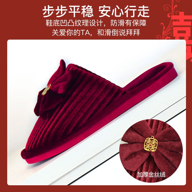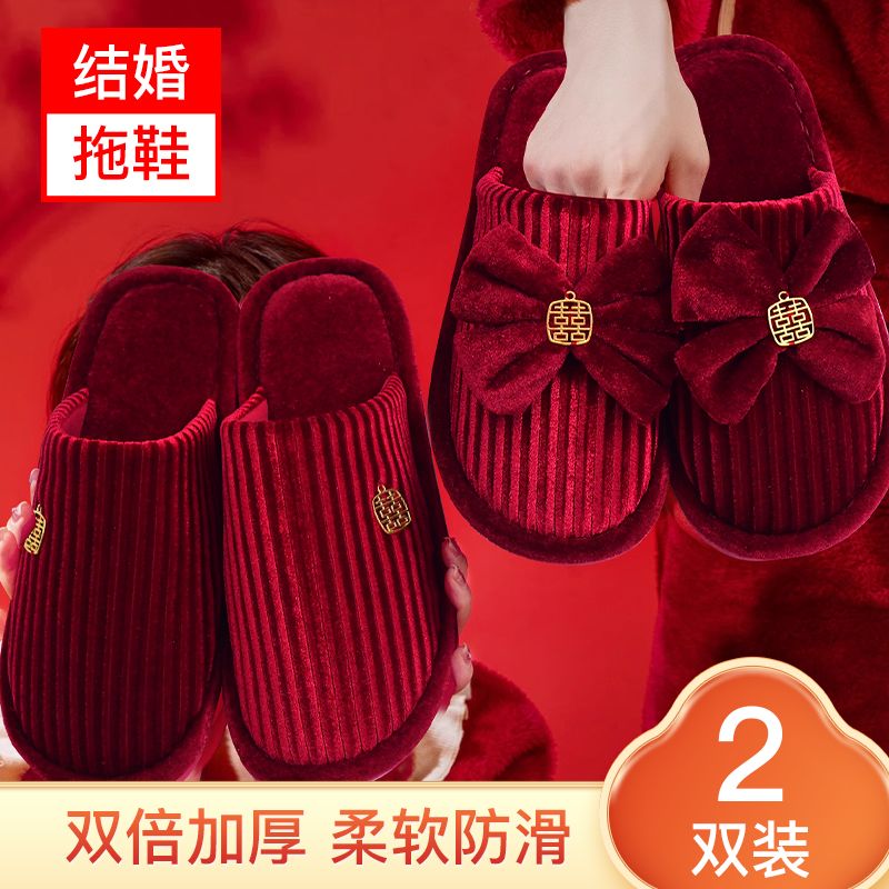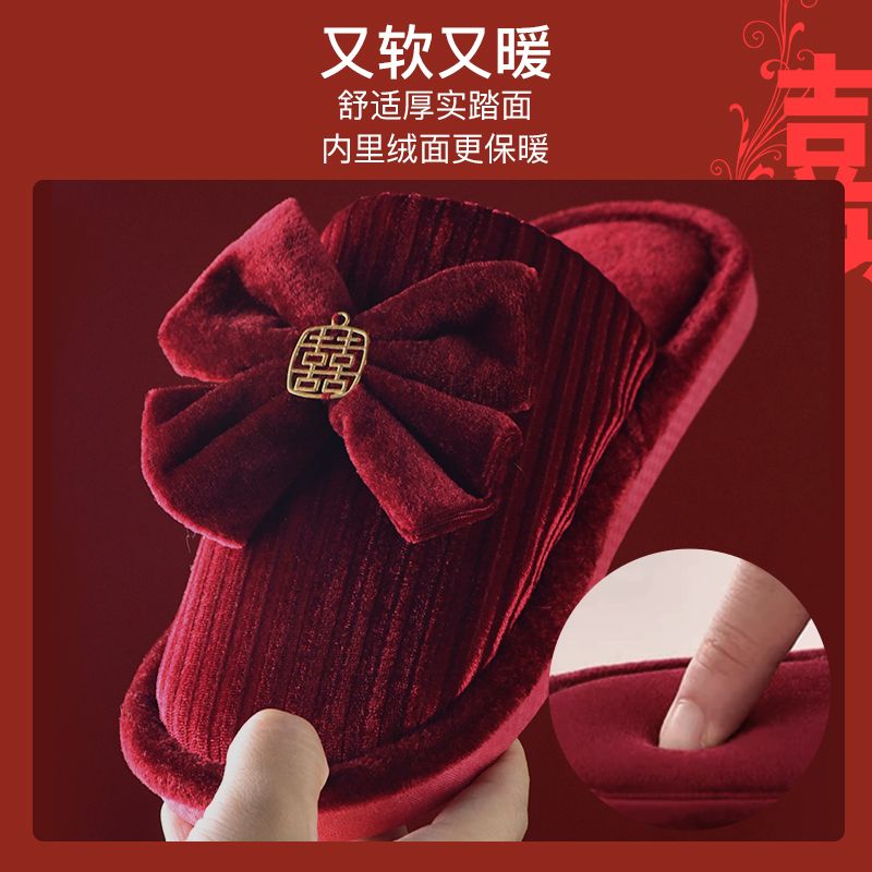 结婚拖鞋婚庆家居棉拖鞋新婚情侣喜庆大红色一对新郎新娘室内陪嫁