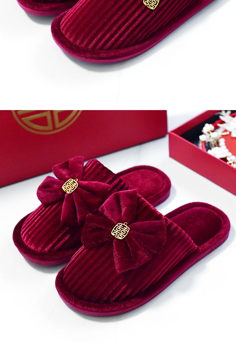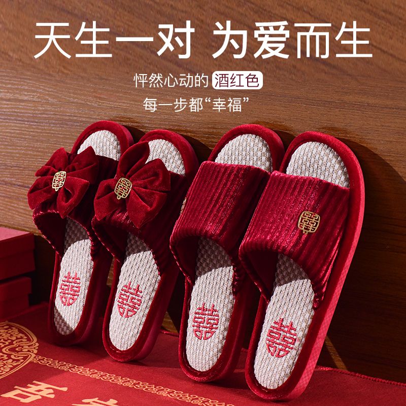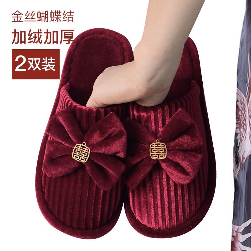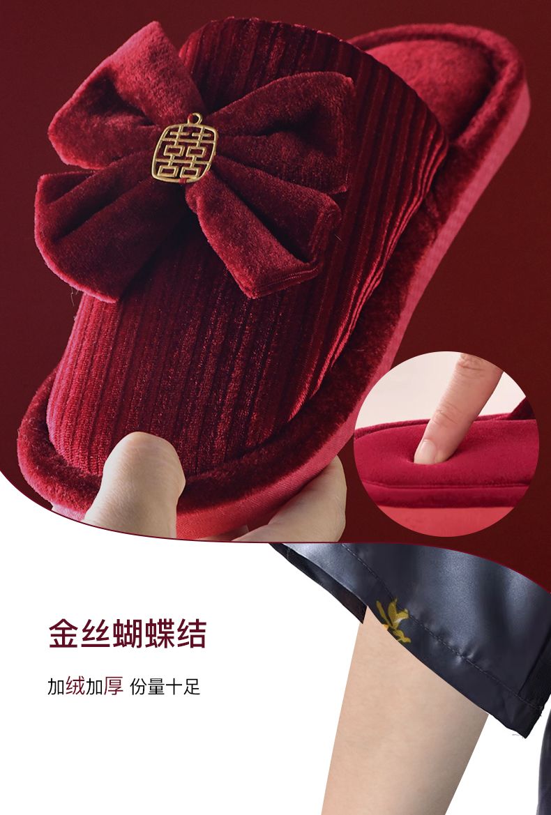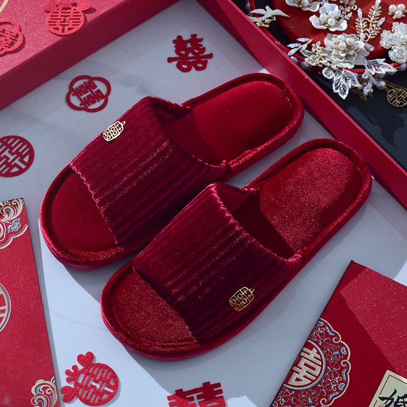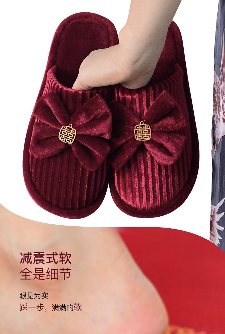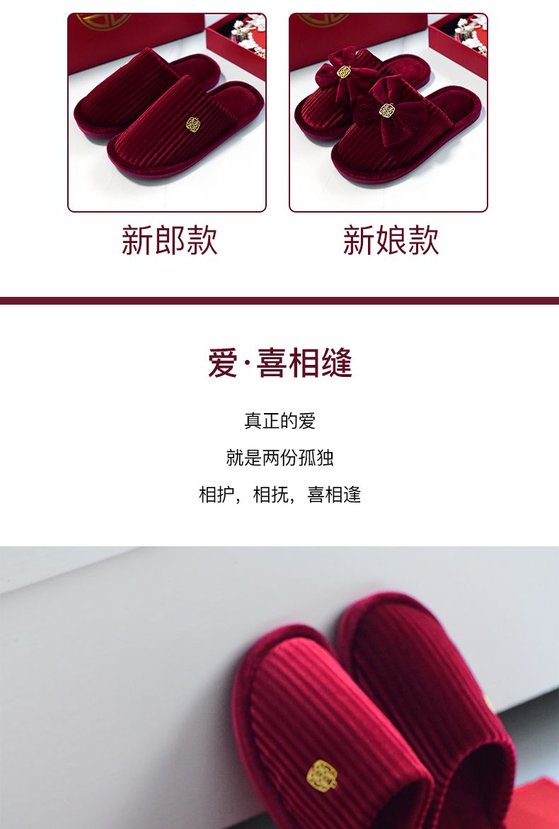 结婚拖鞋婚庆家居棉拖鞋新婚情侣喜庆大红色一对新郎新娘室内陪嫁