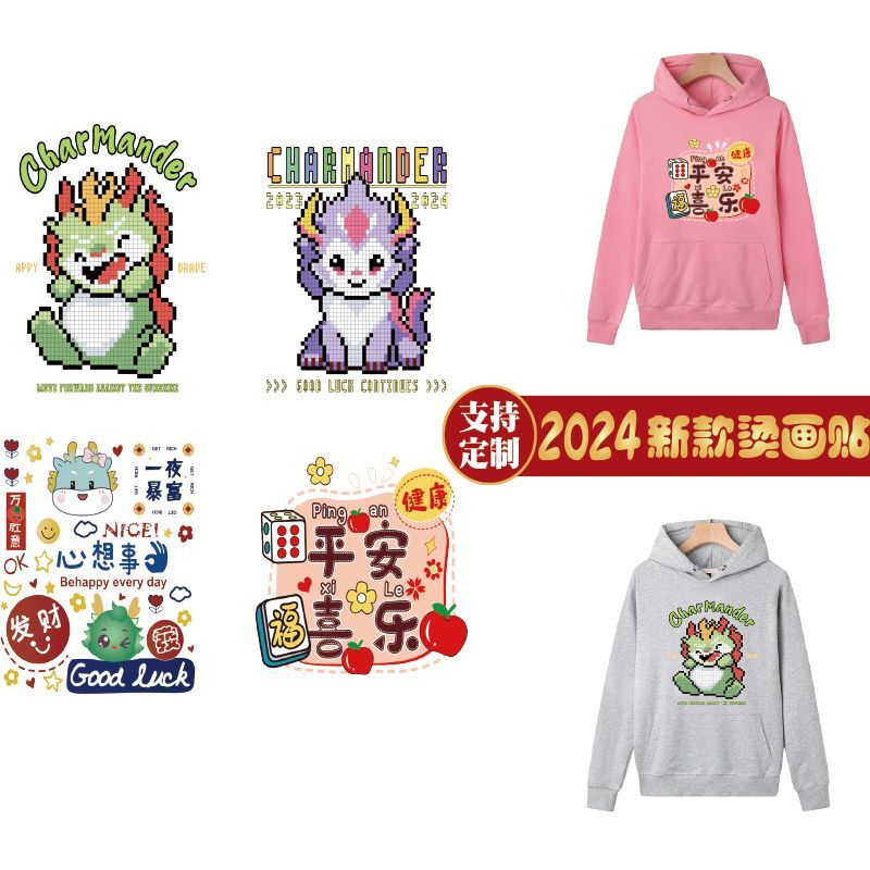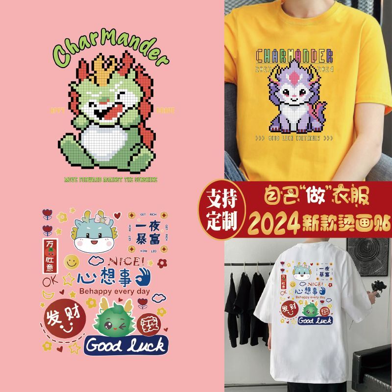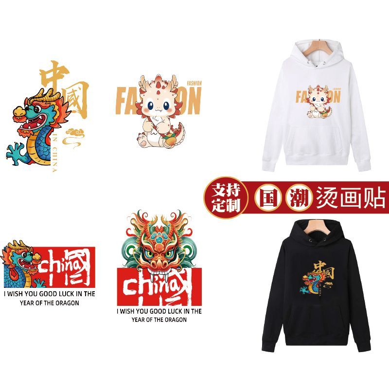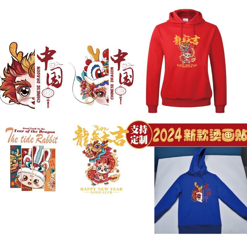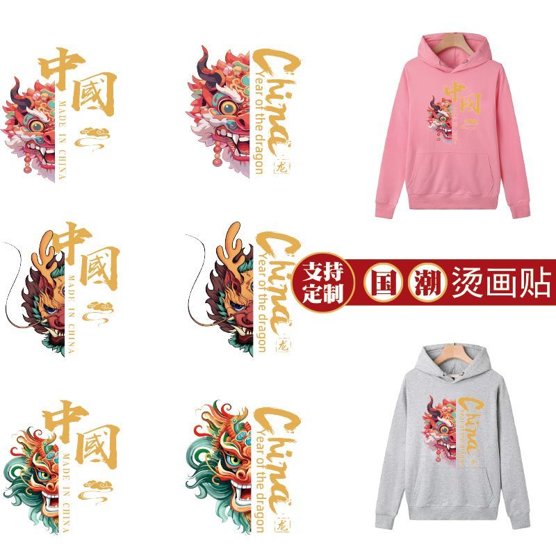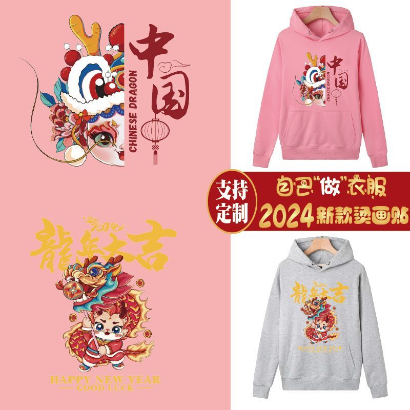 国潮热转印花烫画龙年卡通亲子图案国风个性定制diy烫印自粘布贴