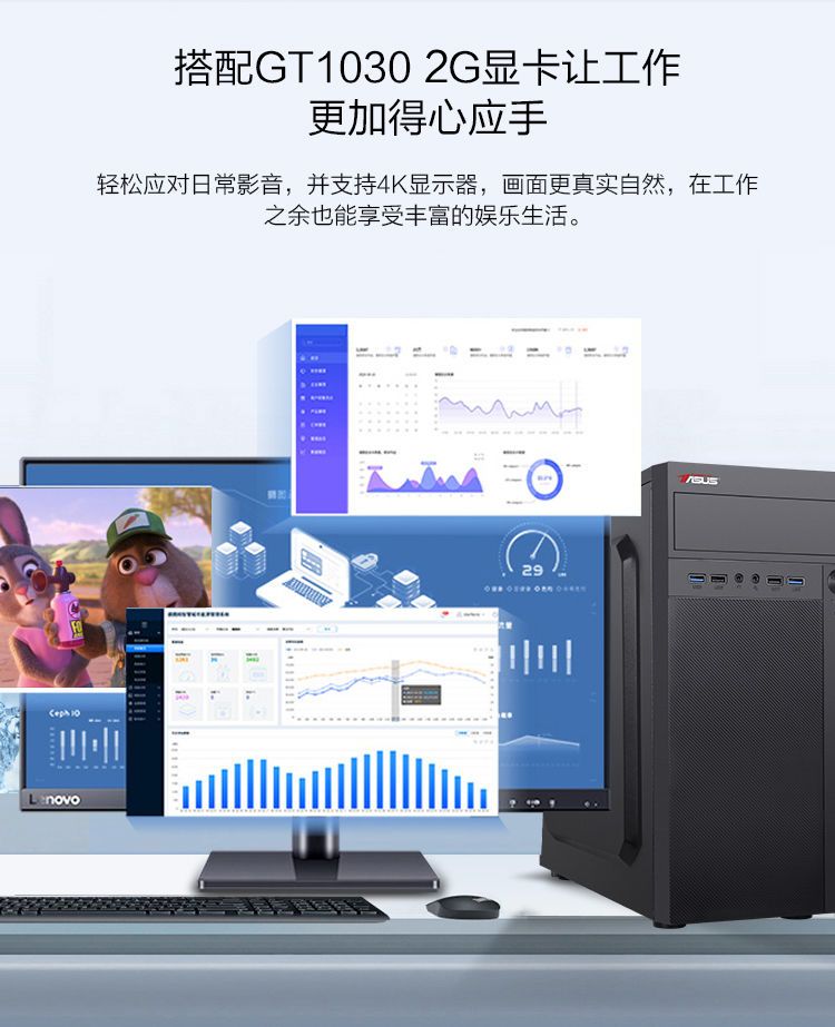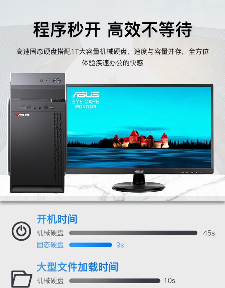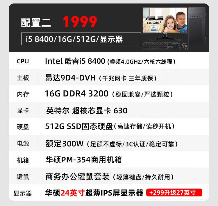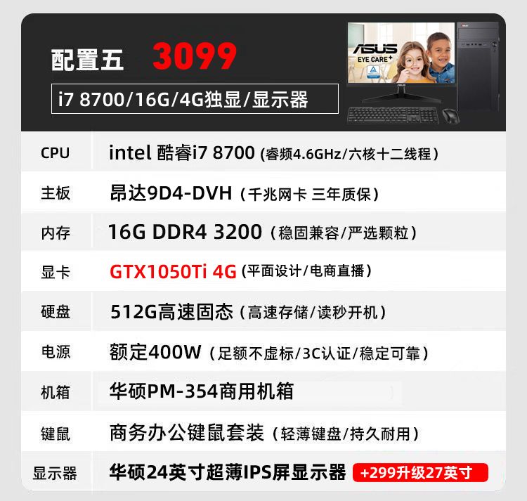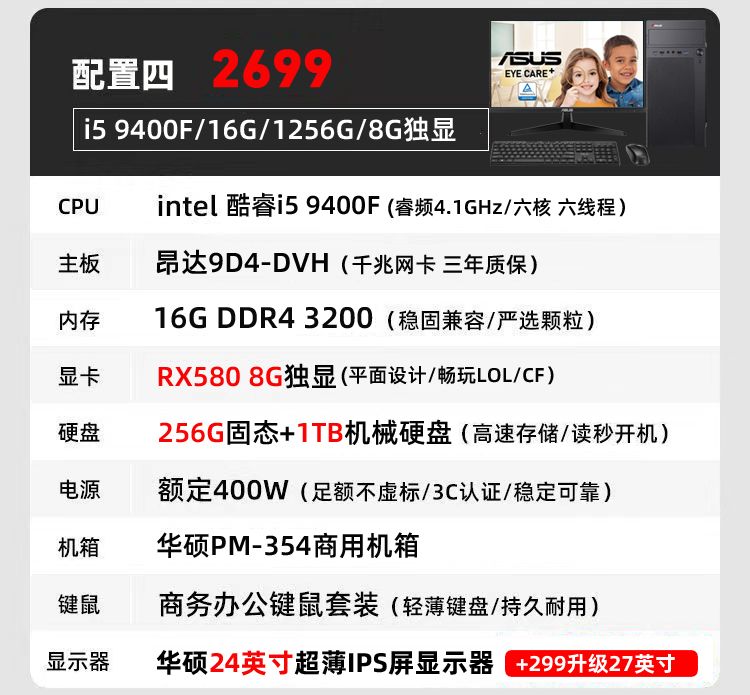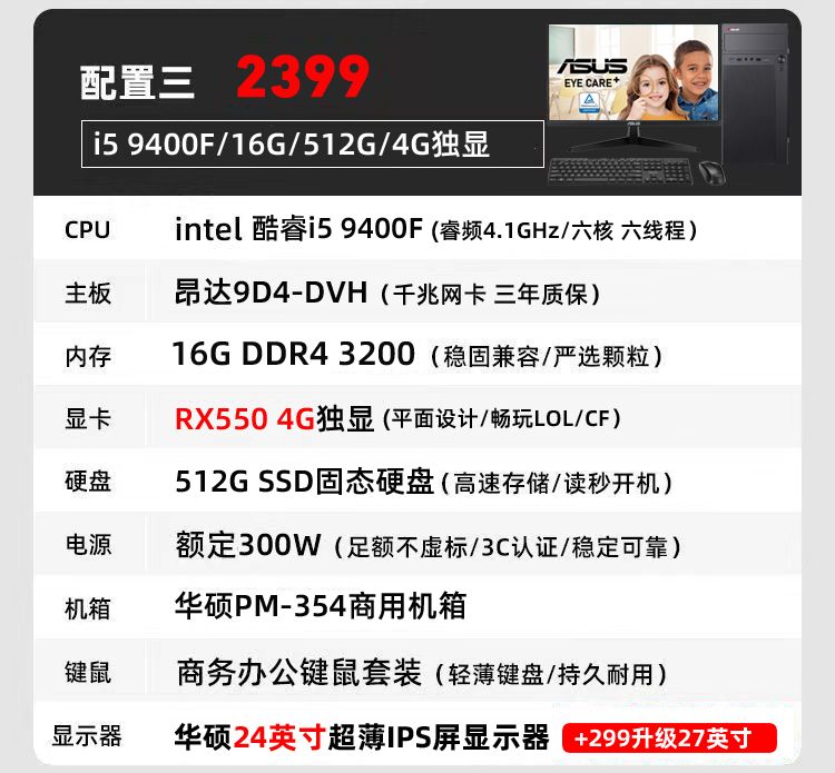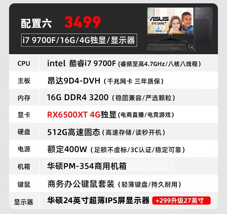 华硕i7 9700/i5/RX6500商务办公家用设计游戏DIY台式电脑整机全套