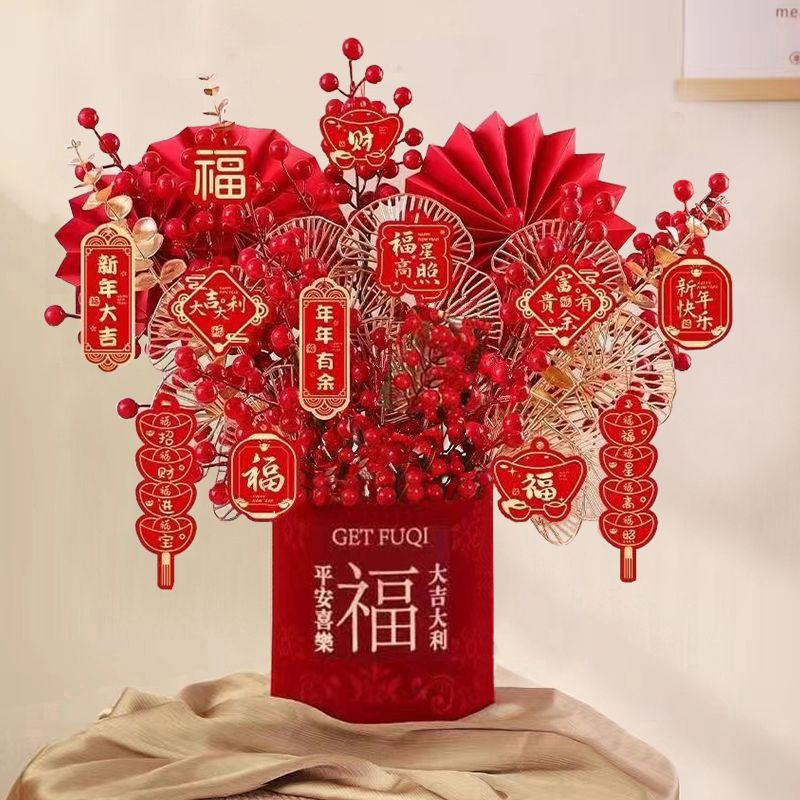 新款福桶红果发财果仿真花结婚新年装饰品客厅餐桌电视柜乔迁摆件