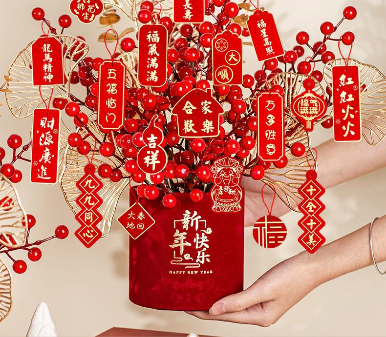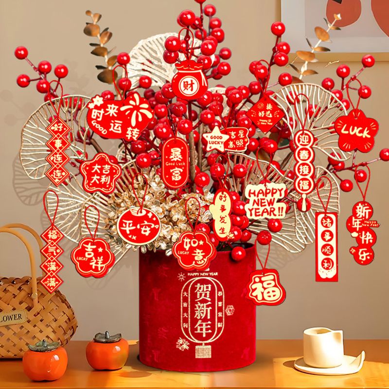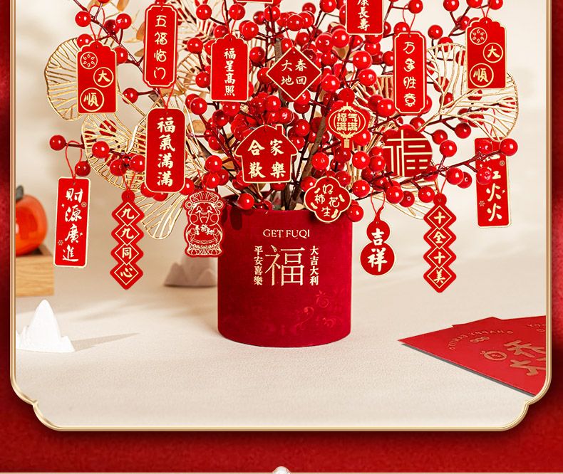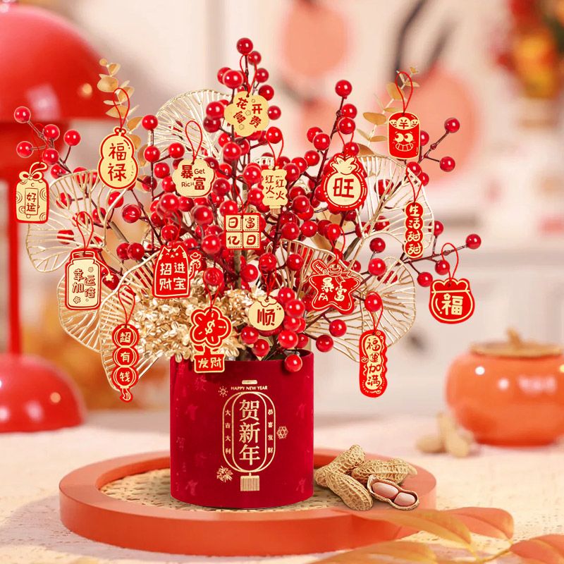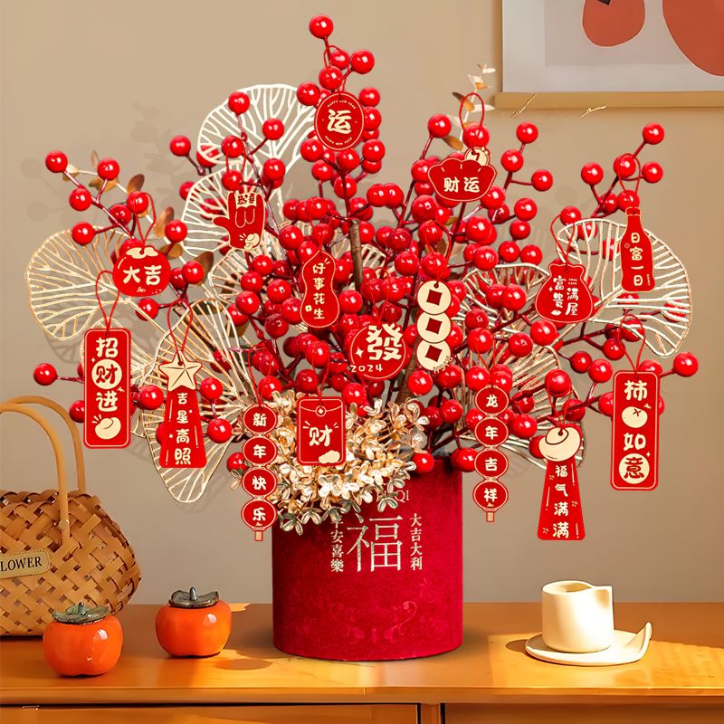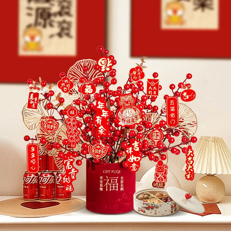新年仿真花发财果摆件氛围装饰桌面红果蛇年福桶抱抱桶假花装饰