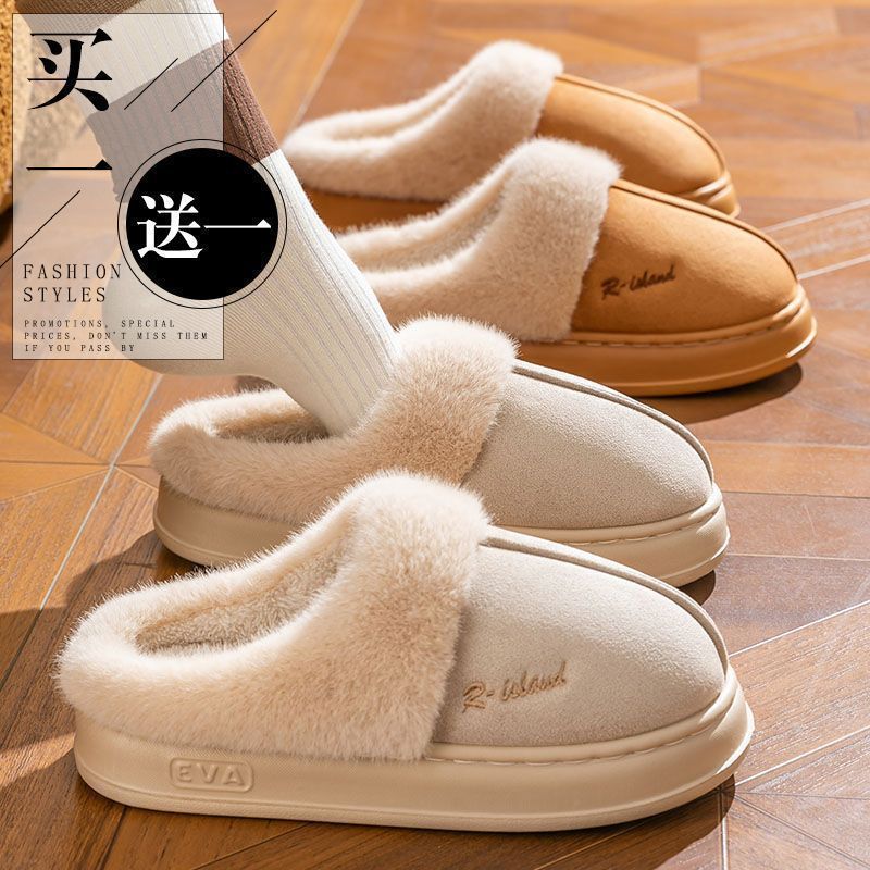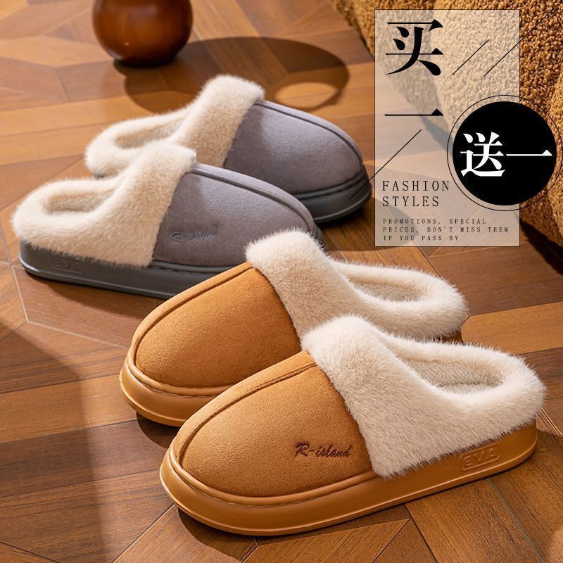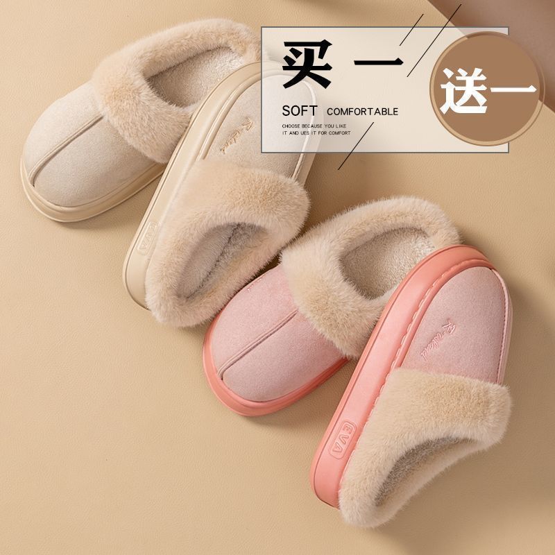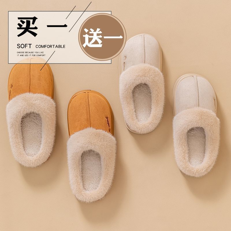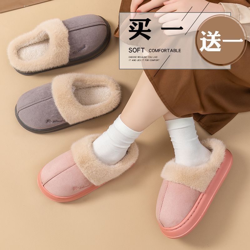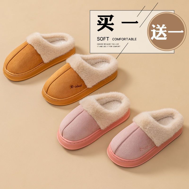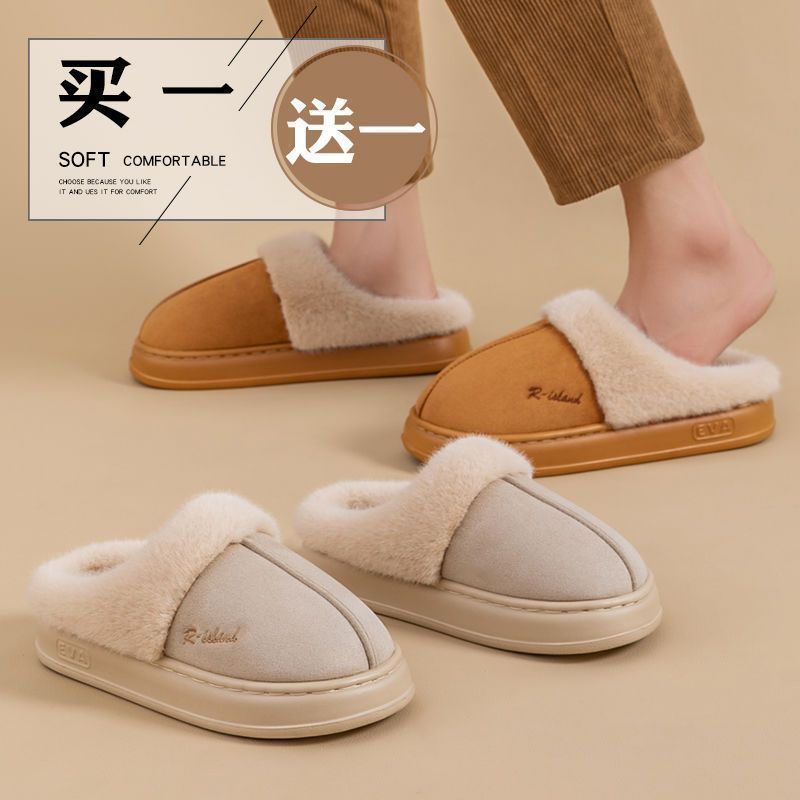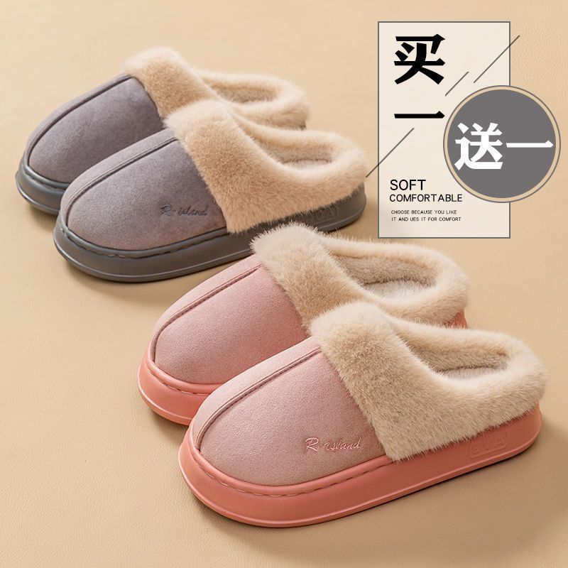 买一送一麂皮绒棉拖鞋女秋冬季室内厚底防滑居家用时尚情侣棉拖鞋