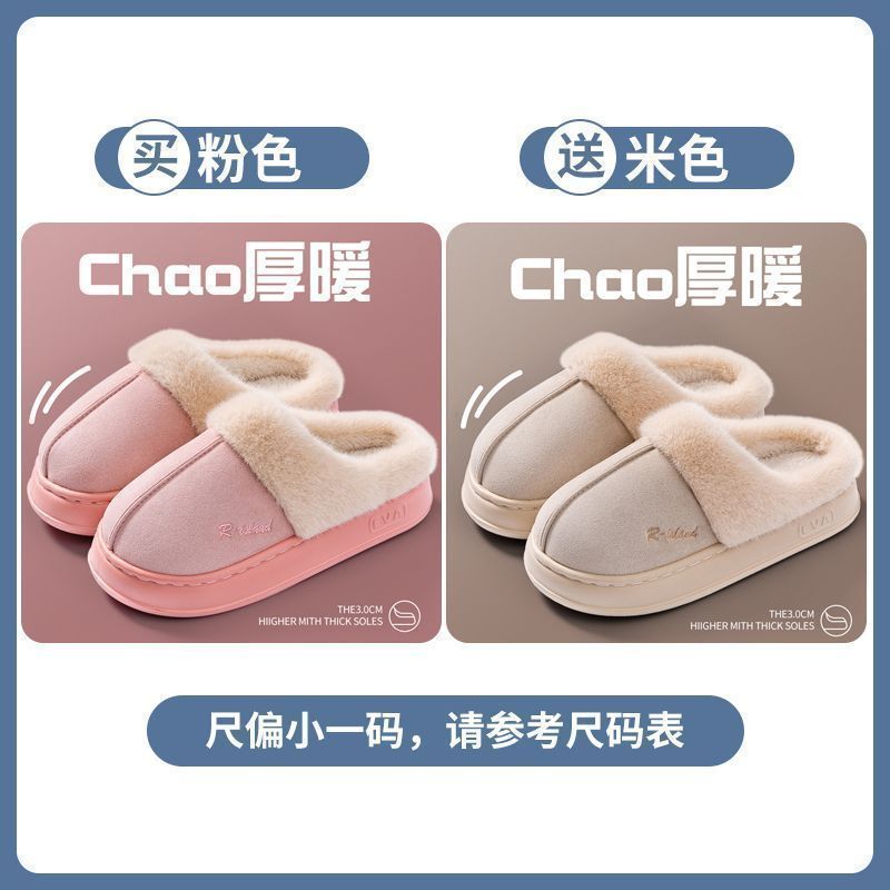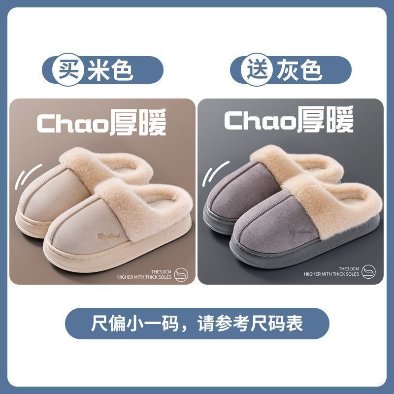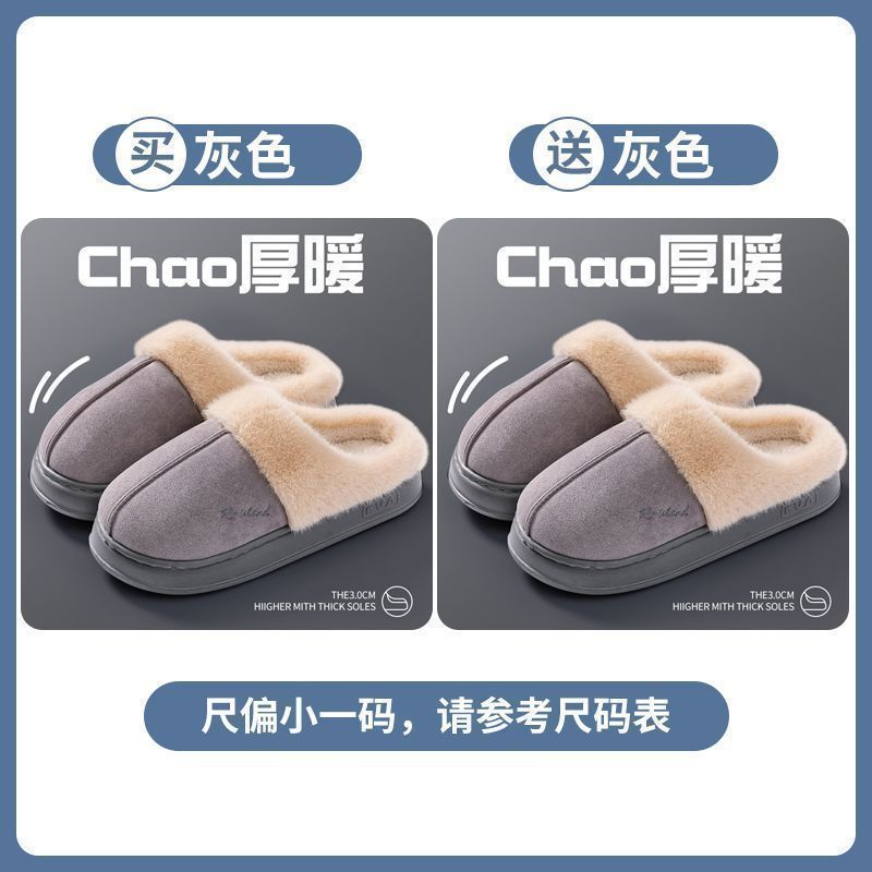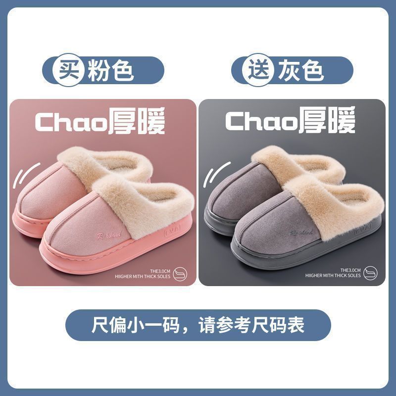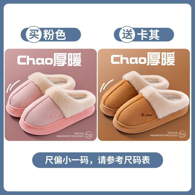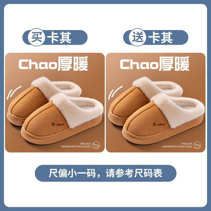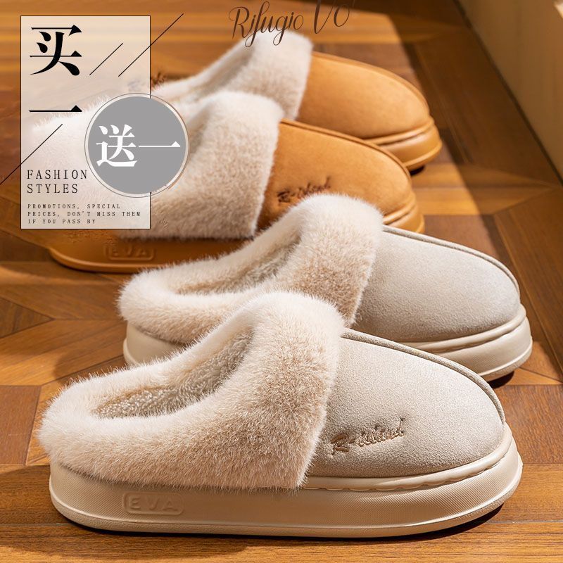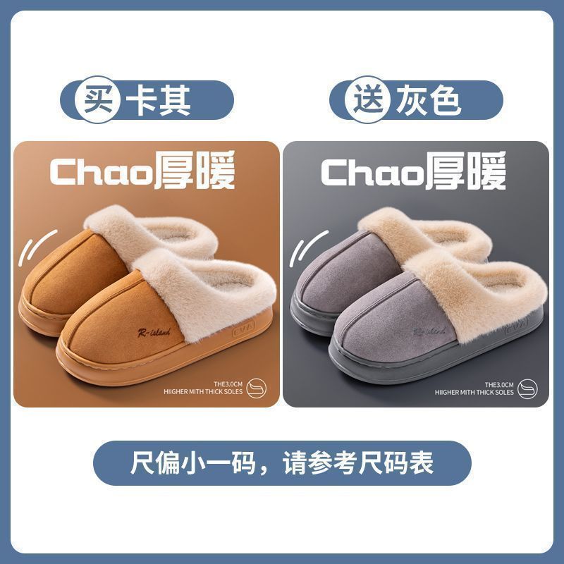 买一送一麂皮绒棉拖鞋女秋冬季室内厚底防滑居家用时尚情侣棉拖鞋