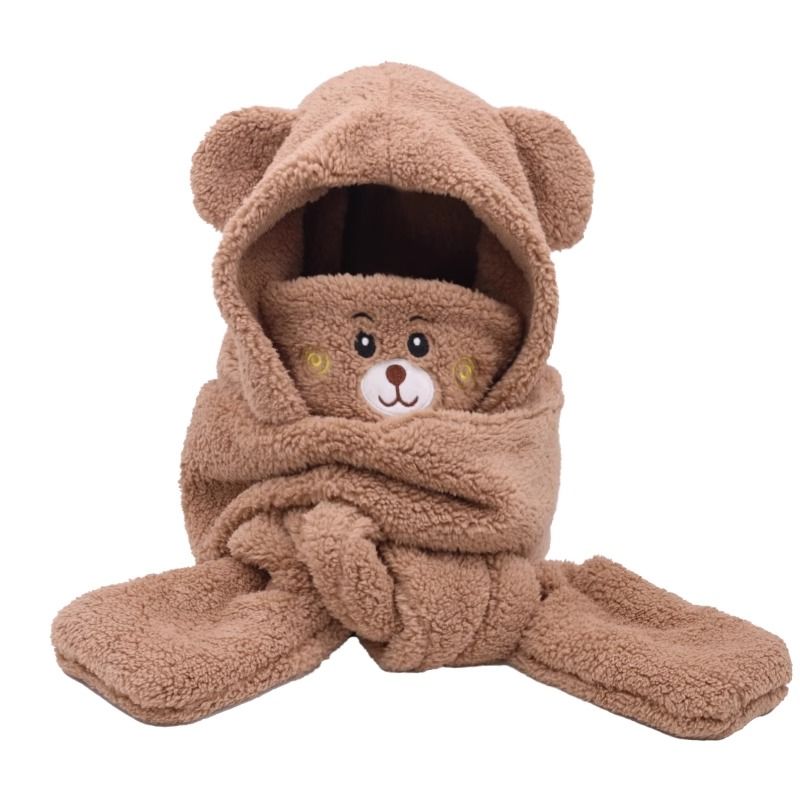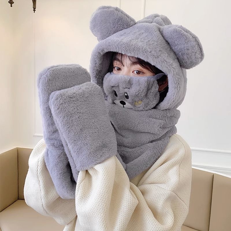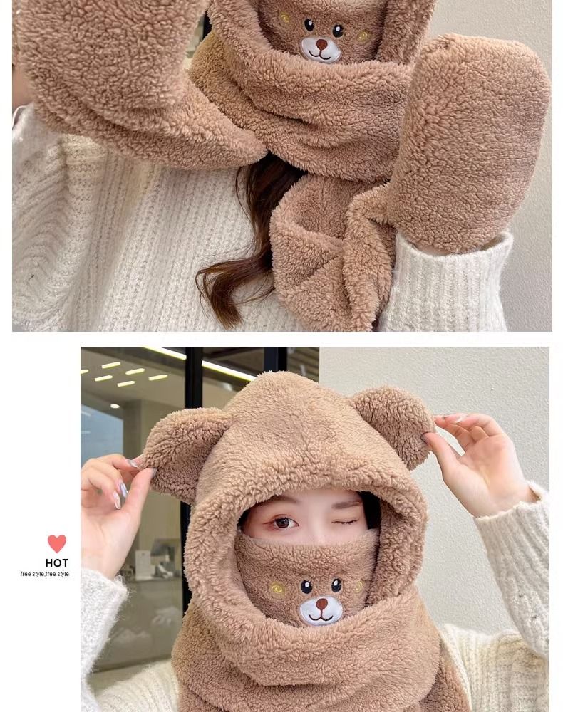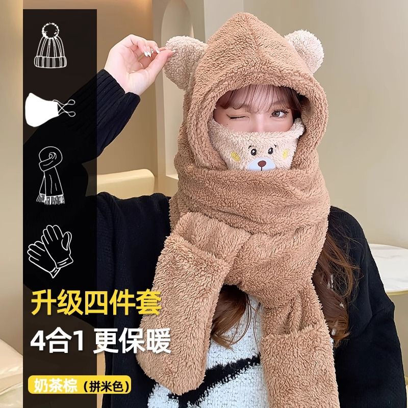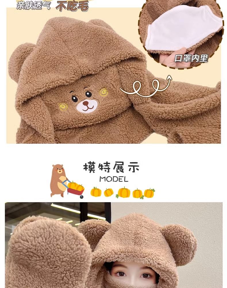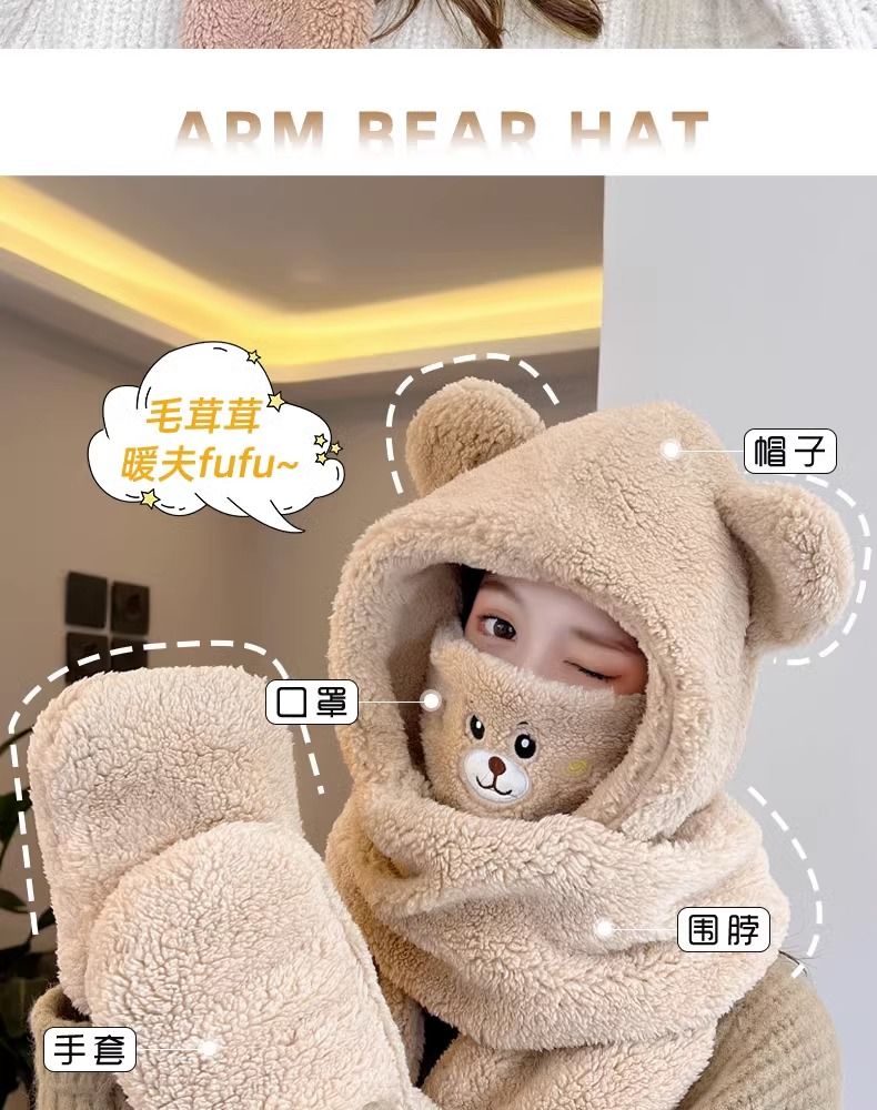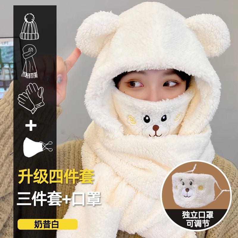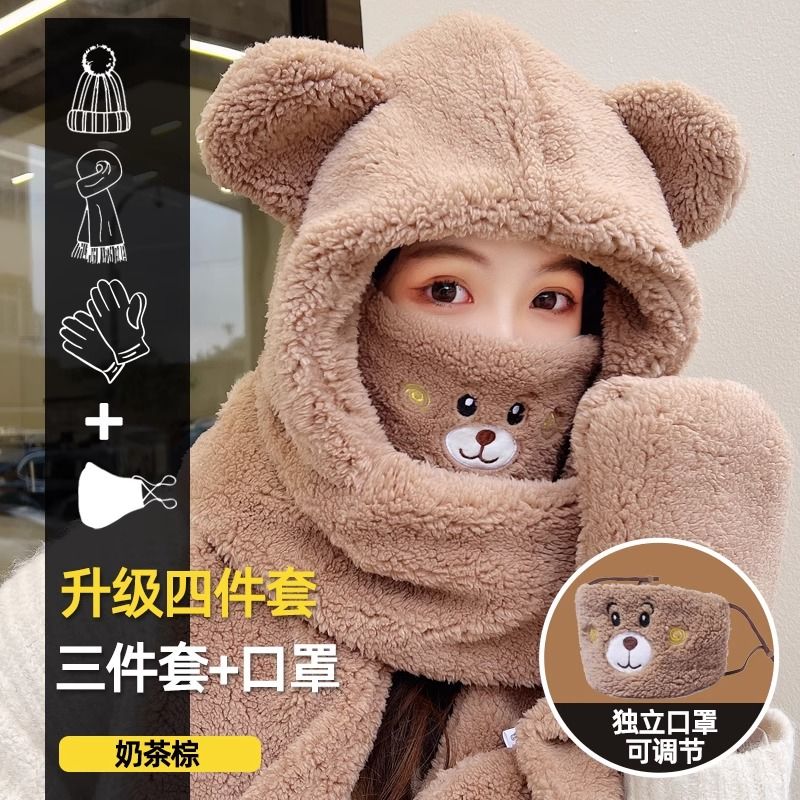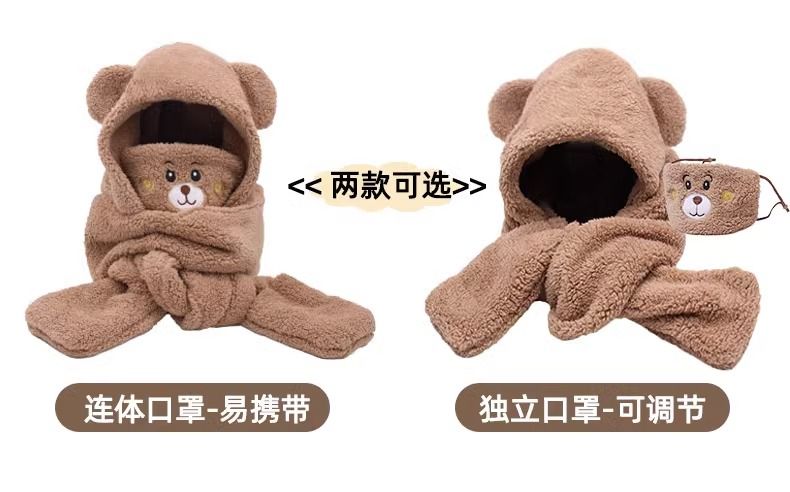2024新款帽子女围巾围脖一体帽三件套冬季防寒保暖骑车小熊口罩帽