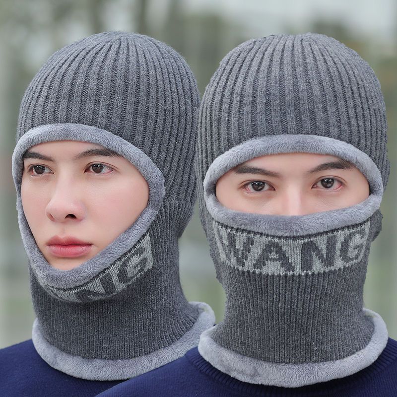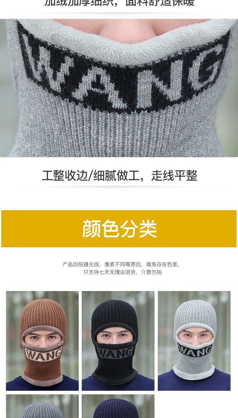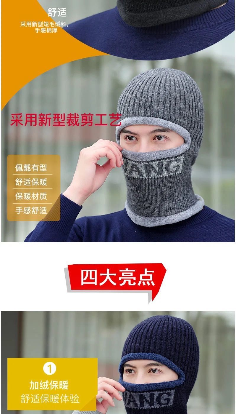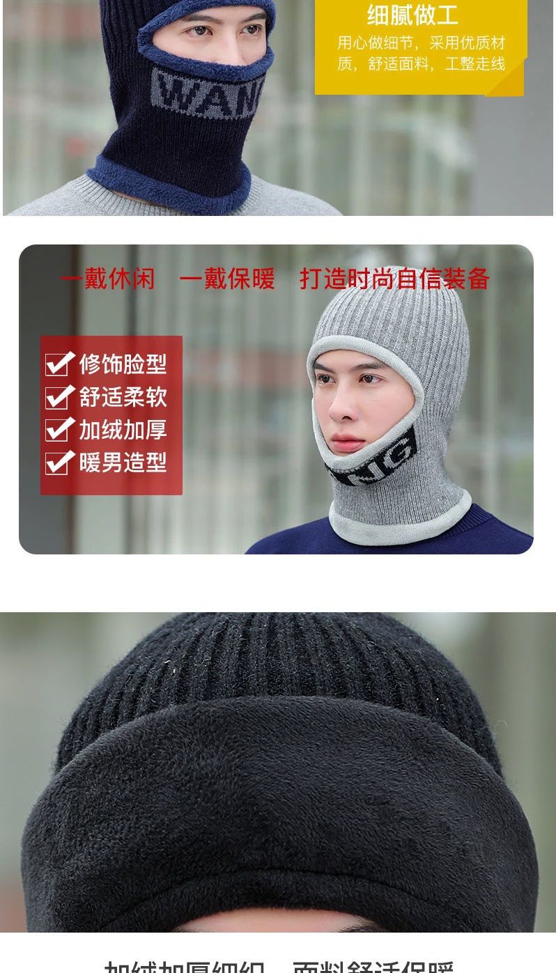 冬季男士帽子一体毛线帽加绒加厚保暖套头骑车护耳防风纯色针织帽
