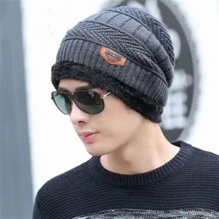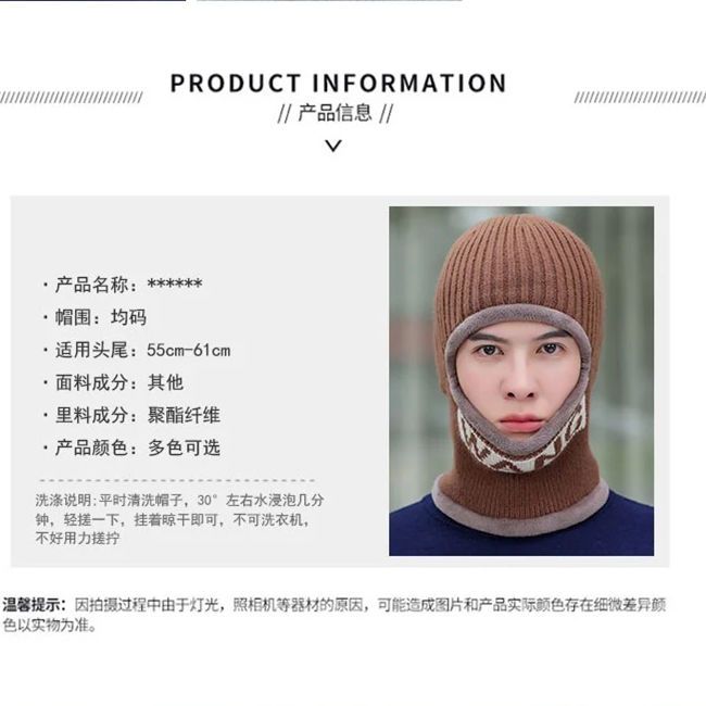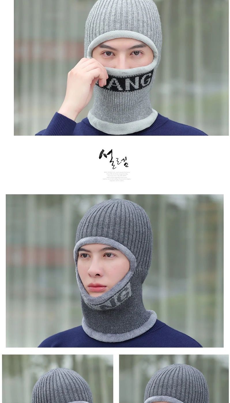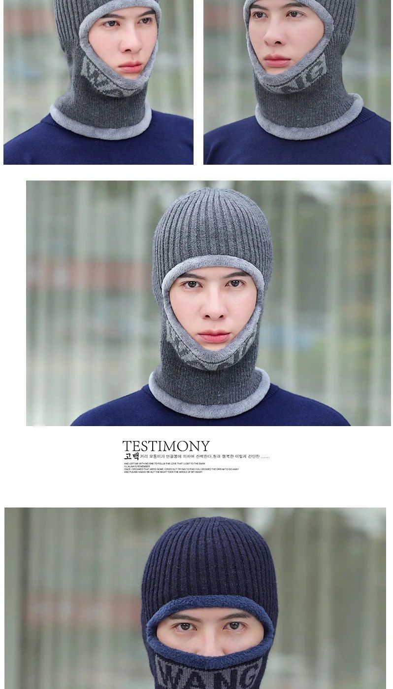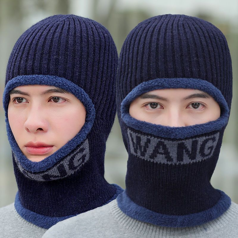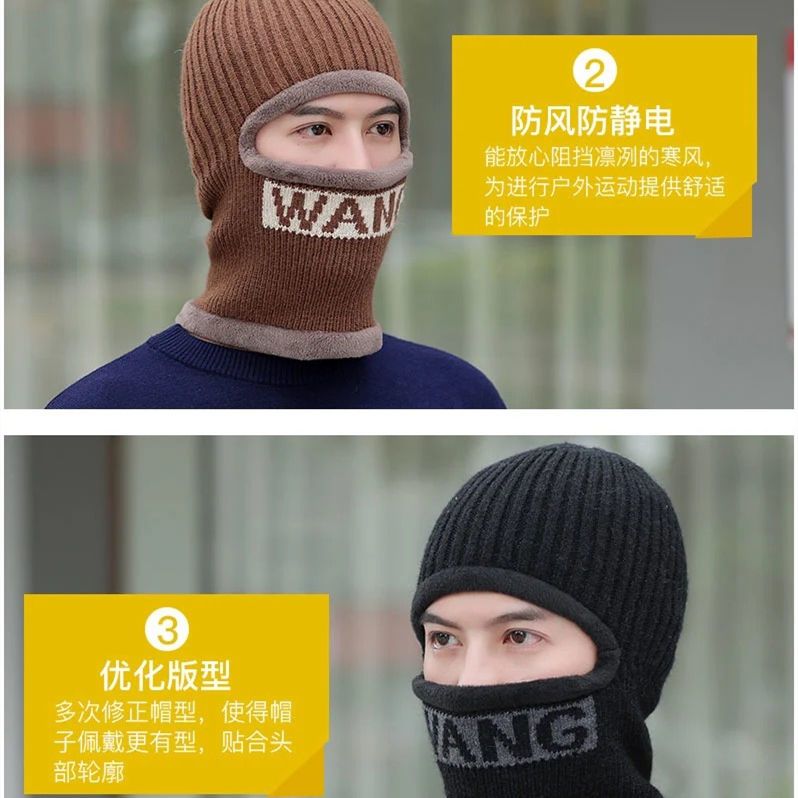 冬季男士帽子一体毛线帽加绒加厚保暖套头骑车护耳防风纯色针织帽