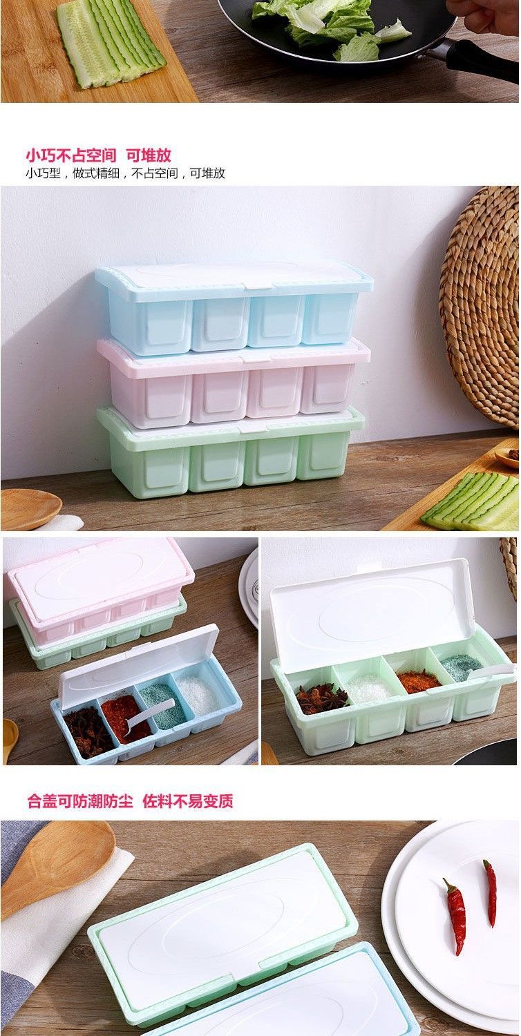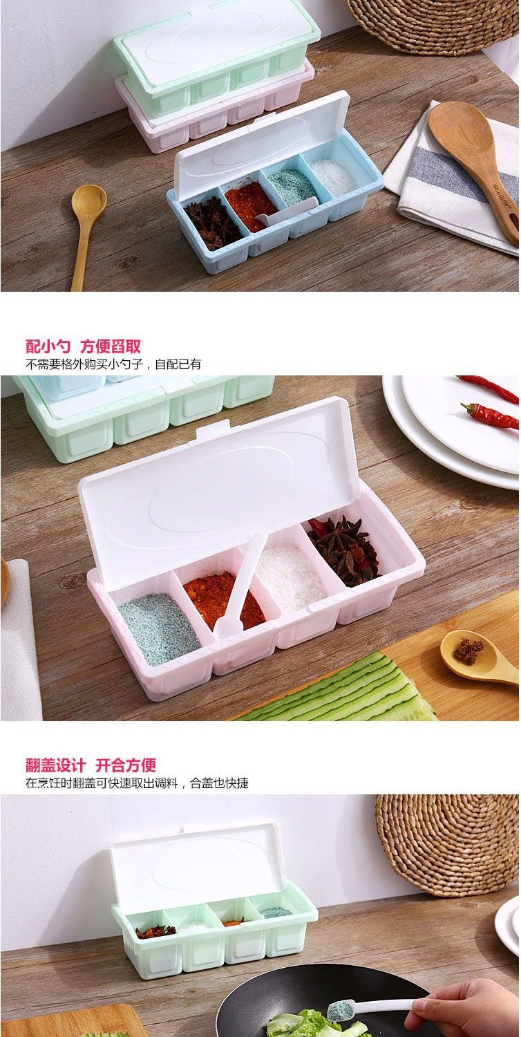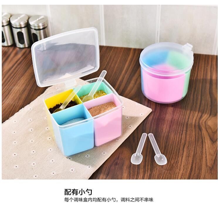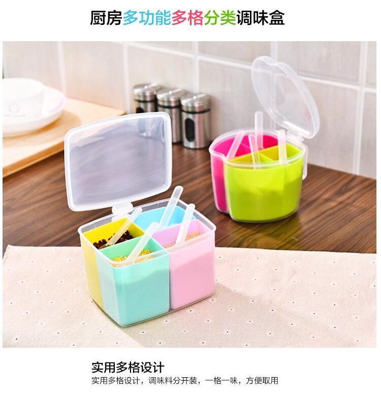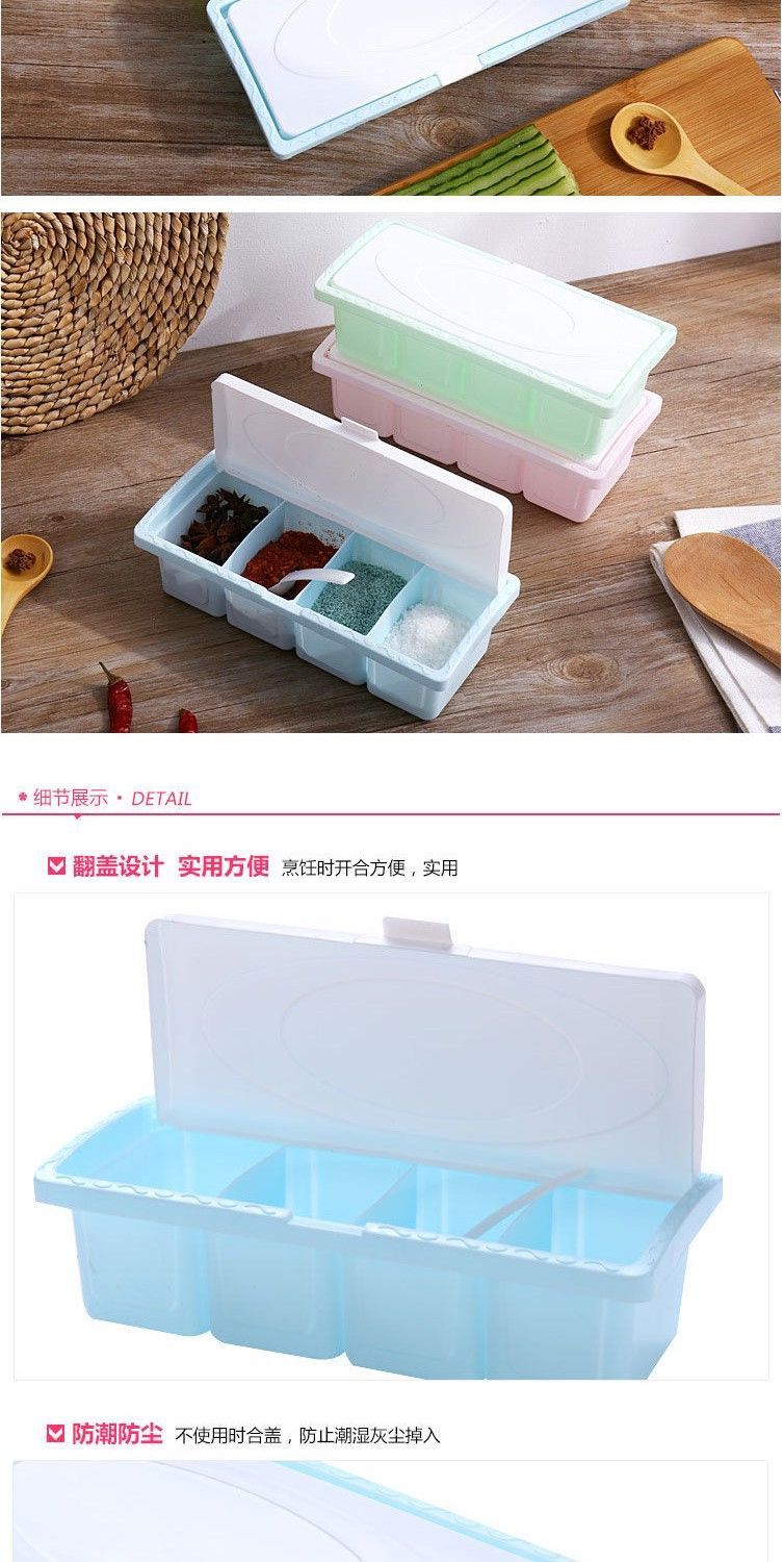 素色带盖4格调味盒调味罐厨房分隔带勺子味精盐罐调料调味料盒