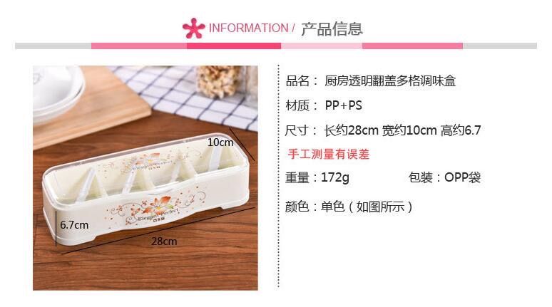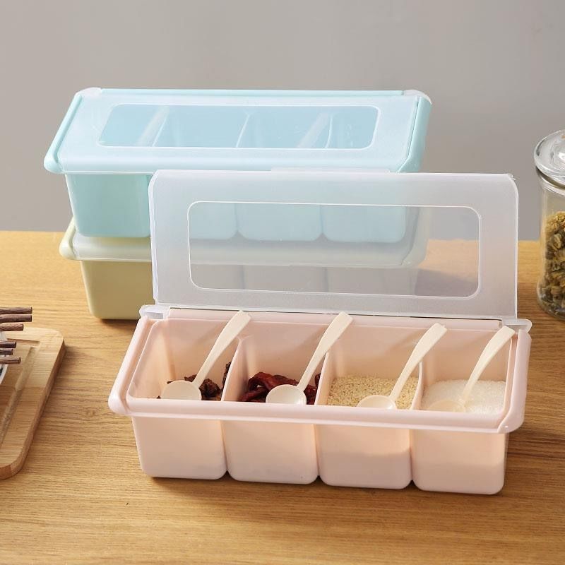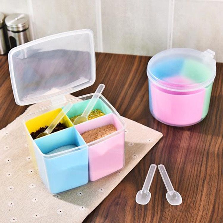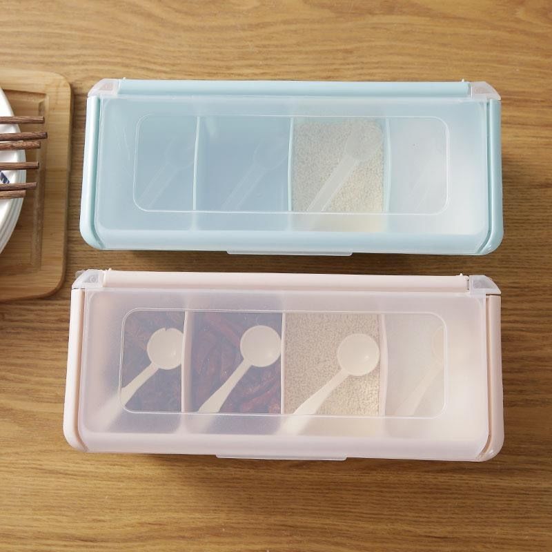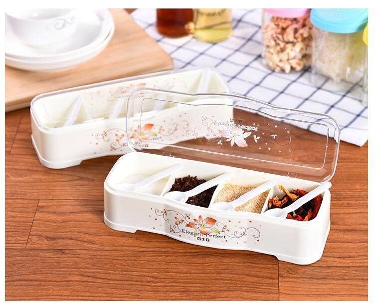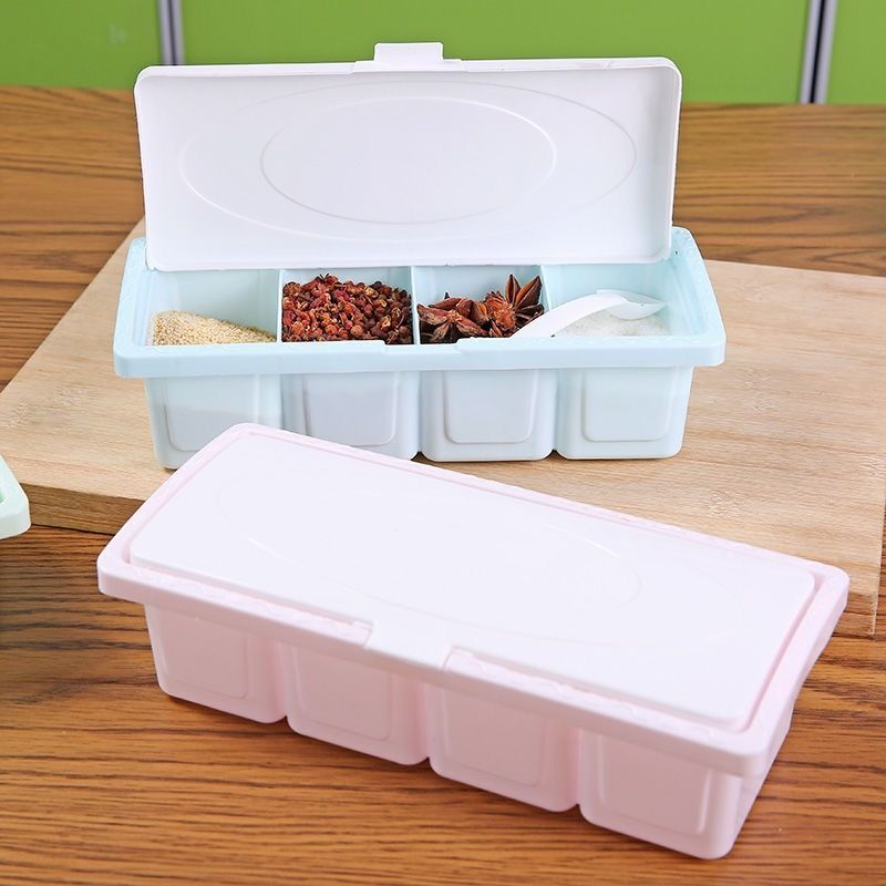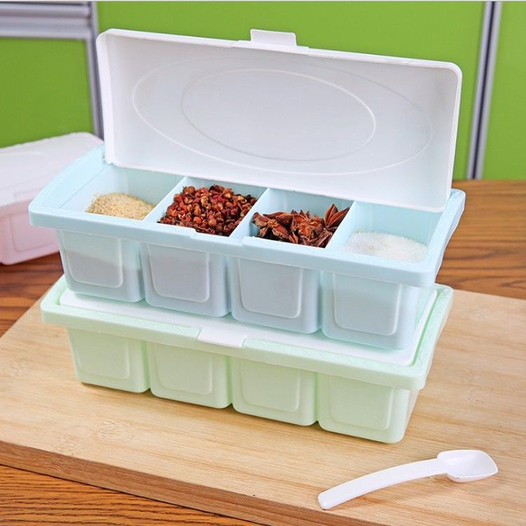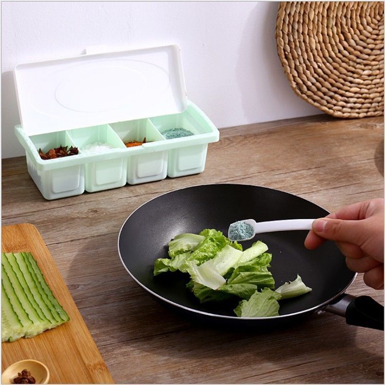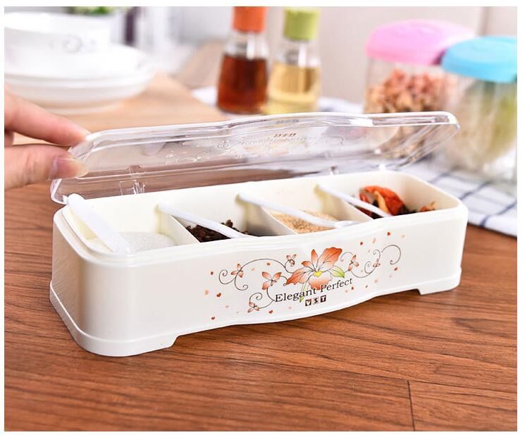 素色带盖4格调味盒调味罐厨房分隔带勺子味精盐罐调料调味料盒