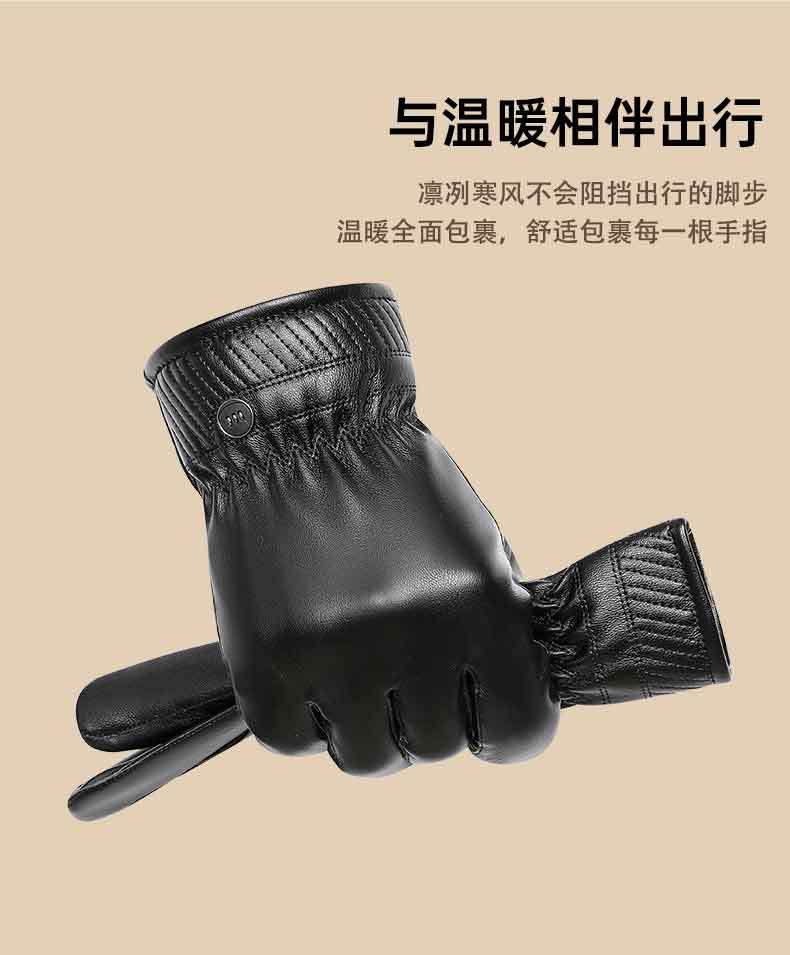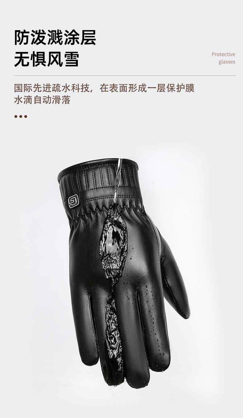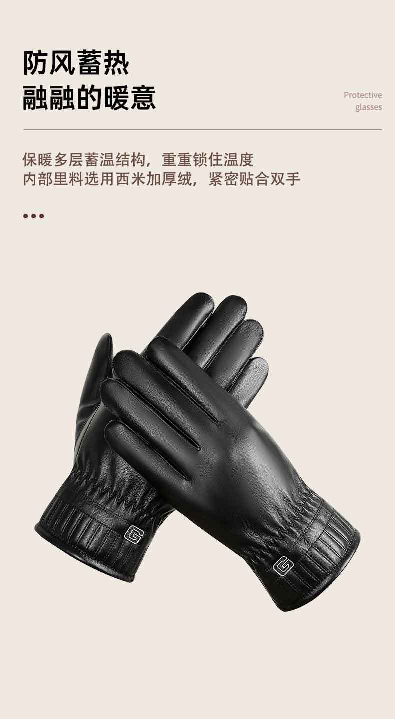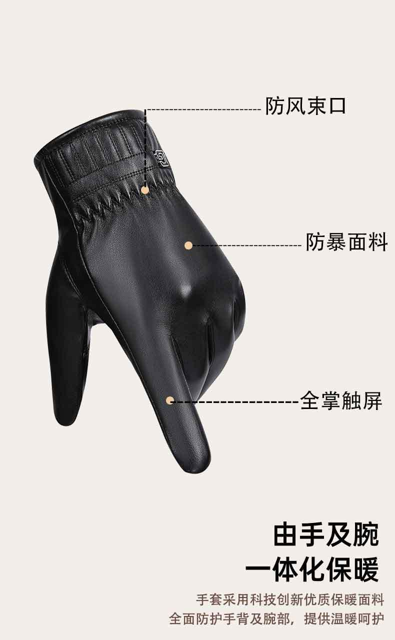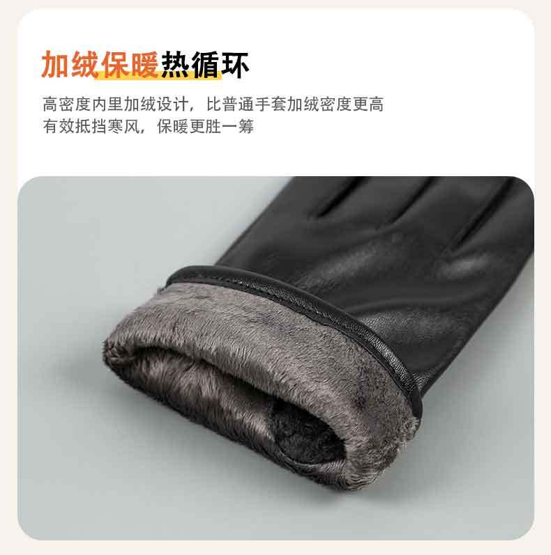 皮手套男全掌触屏防寒防风防滑软皮羊皮纹薄绒户外骑行手套秋冬款