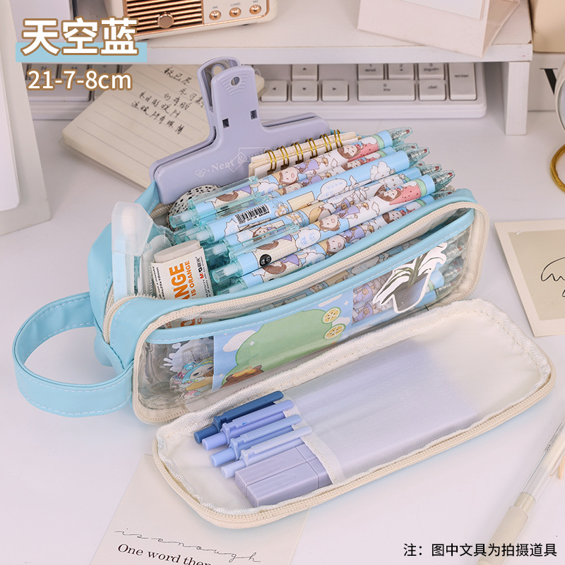 奶盐双层透明笔袋ins日系大容量初中小学生高颜值收纳铅笔文具盒