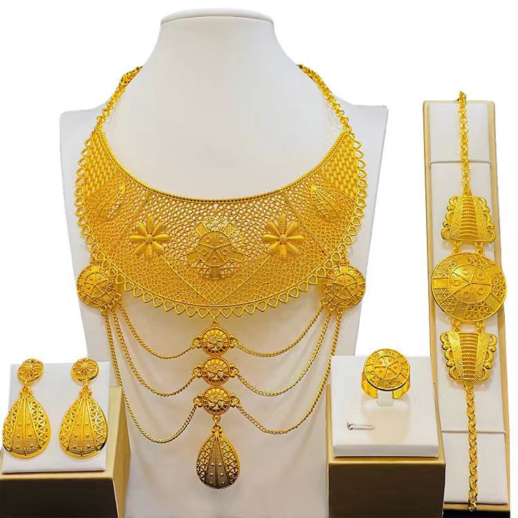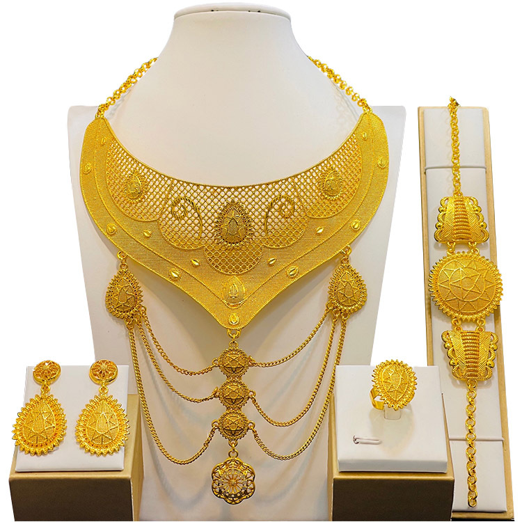 迪拜24K层次吊链大气合金四件套中东女士晚宴会项链耳环戒指手链