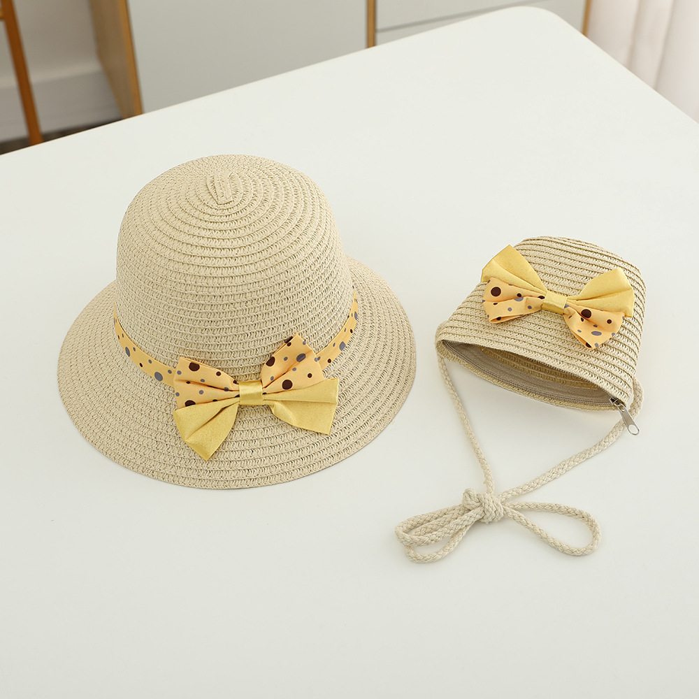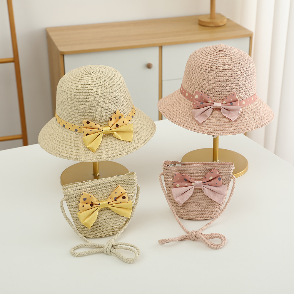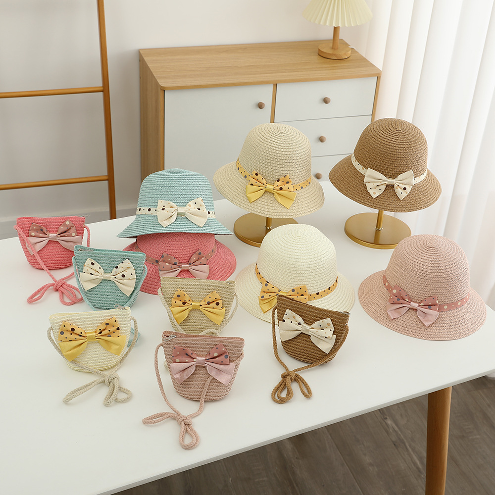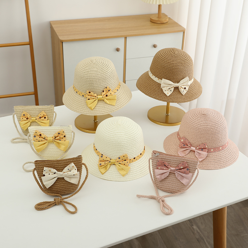 儿童草帽韩版潮流帽子包包二件套圆点蝴蝶结夏天防晒帽遮阳帽批发