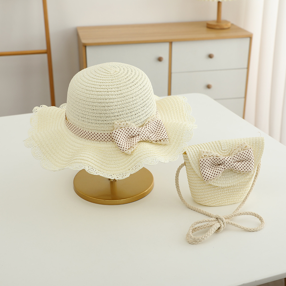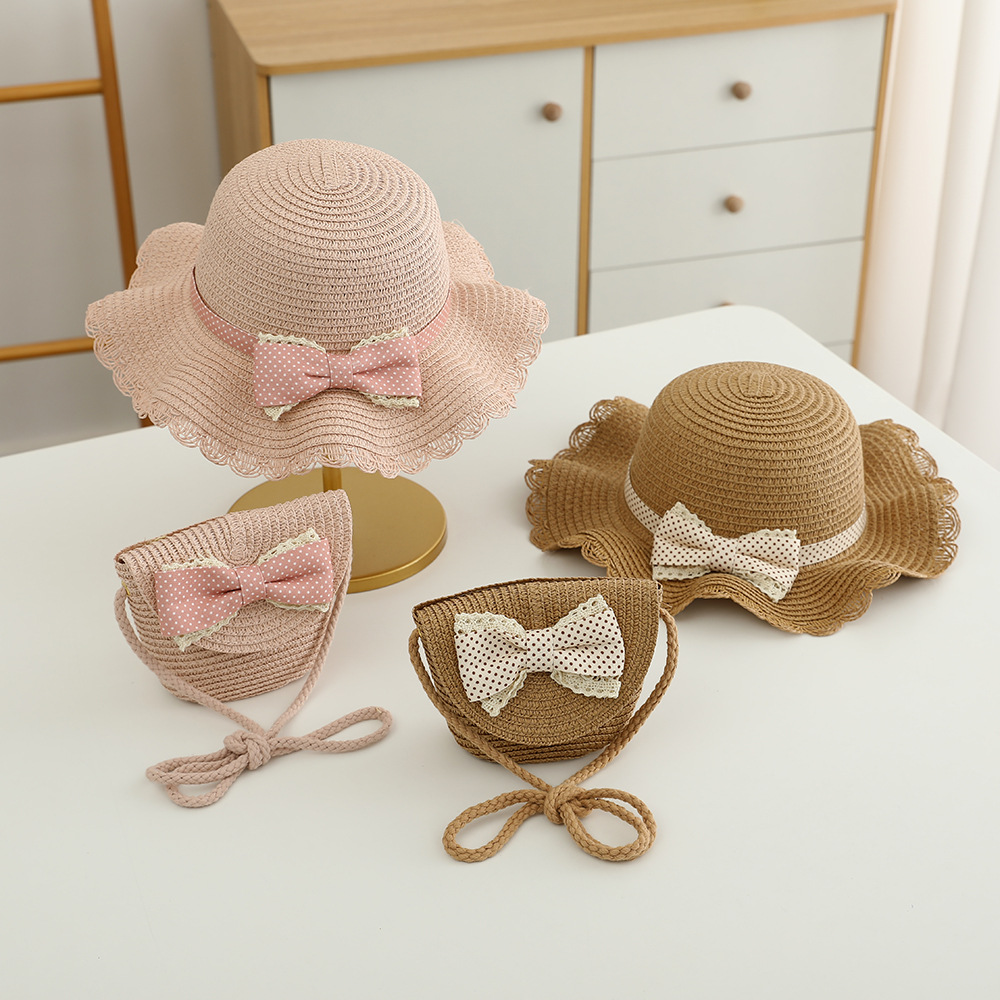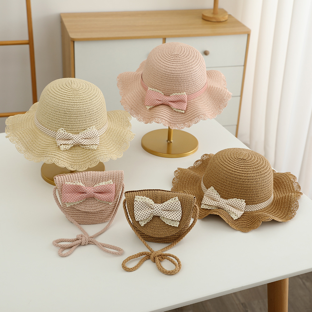 儿童草帽批发甜美可爱波点蝴蝶结帽子包包夏季女童防晒帽遮阳帽